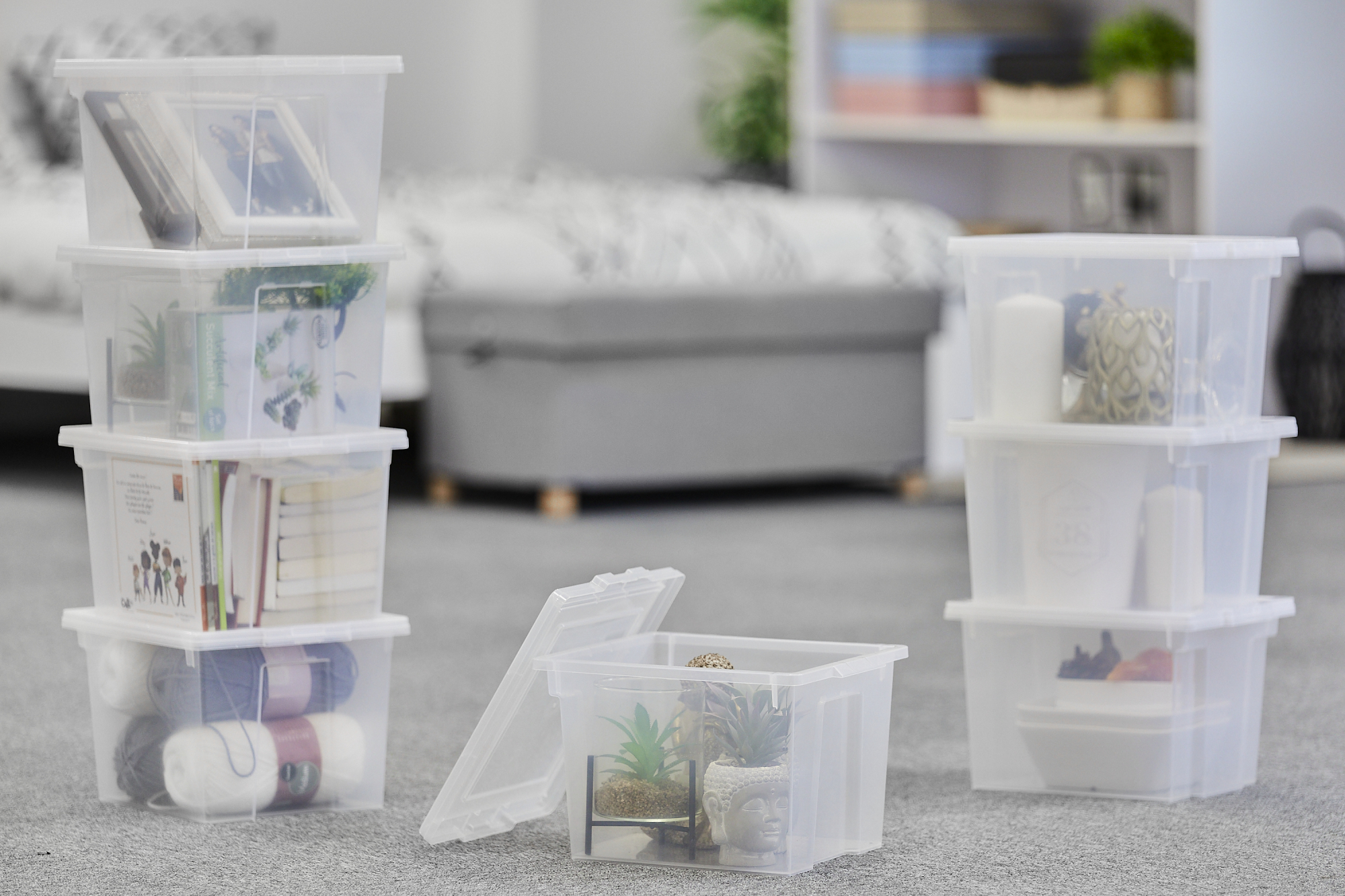 DIMENSIONS: 24 x 29 x 18.5 cm (L x P x H) CAPACITÉ : 10 L / Lot de 8 UTILISATION : Peut être utilisé dans le salon, la chambre à coucher ou dans le garage. EMPILABLES : Ces boîtes de rangement peuvent être empilées sur le couvercle. CARACTÉRISTIQUES : 2 clips pour sécuriser la fermeture des boîtes et une poignée ancrée pour un rangement facile en hauteur et ainsi pouvoir être utilisé comme boîtes de rangement pour les étagères. MATERIAU DE CASIERS DE RANGEMENT : Ces produits sont fabriqués en plastique sans BPA polypropylène. CONTIENT: 1 lot de 8 boîtes de rangement plastique avec couvercles, livrés dans un emballage conforme aux normes.