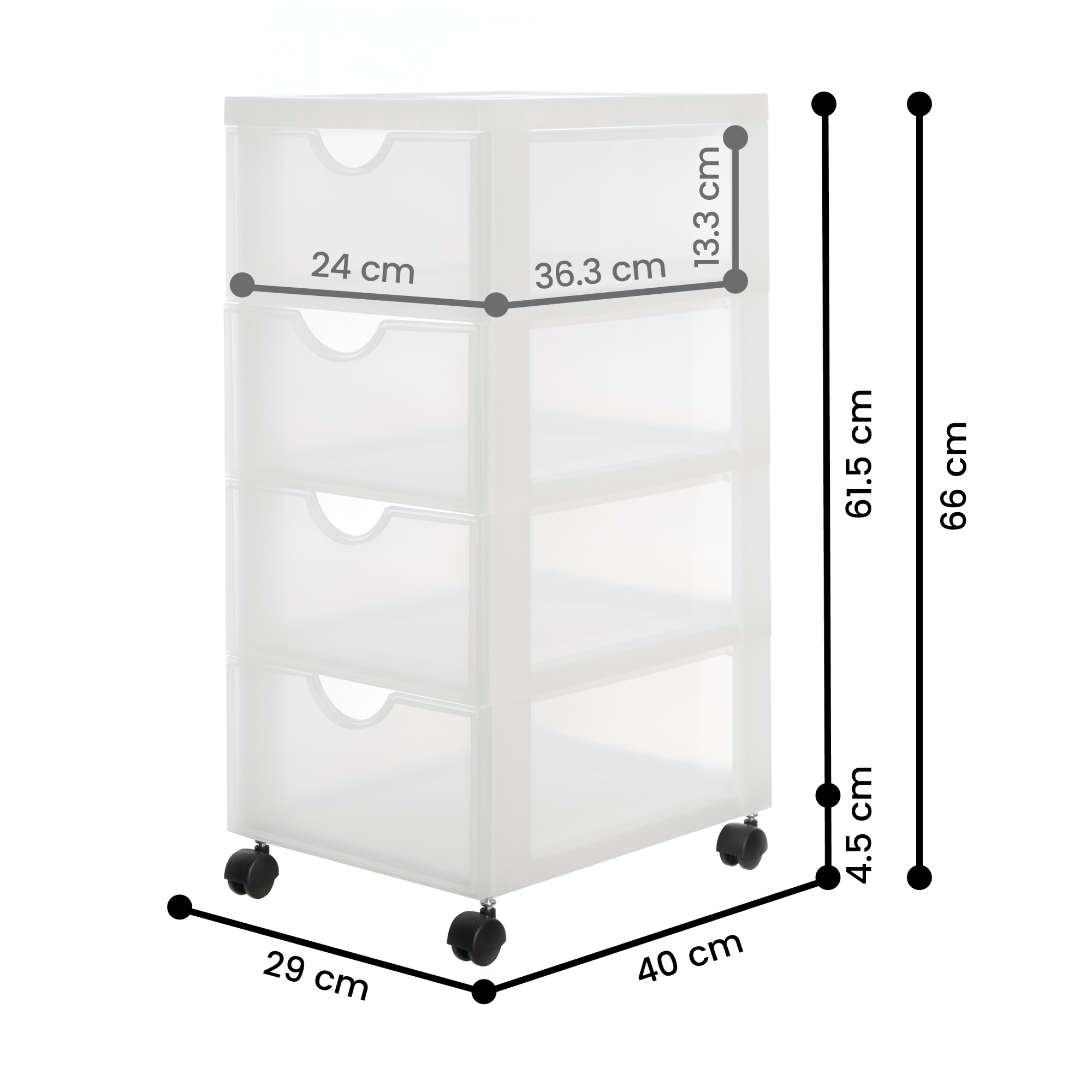 DIMENSIONS DE LA TOUR DE RANGEMENT : Externes : L29 x P40 x H61.5 cm avec les roues et sans roues, il vous faut soustraire environ 6cm, dans la hauteur |Internes (tiroirs): L23.2 x P35.5 x H13 cm|Les roues : L 3.5 x P 3.5 x H 4.5 cm|Ce produit est une fabrication 100% européenne d'Iris Ohyama provenant de ses usines . CAPACITÃ? DE LA TOUR DE RANGEMENT PLASTIQUE: Le volume de contenance de ce produit est de 4 x 11 L. Les tiroirs spacieux et de taille A4 des tours DC vous permettent de ranger toutes sortes d'objets, qu'il s'agisse d'articles de bureau ou de vêtements. Cela permet également de placer la tour dans votre bureau, votre salon ou votre salle de bain. MATERIAU DE CASIERS DE RANGEMENT : Ce produit est fabriqué en plastique sans BPA (polypropylÃ?ne). Cela garantit une résistance aux chocs et aux coups ainsi qu'un nettoyage simple de la boîte de rangement avec couvercle. POIGNÃ?E INTÃ?GRÃ?E ERGONOMIQUE : Ce produit est équipé d'une poignée ergonomique pour une ouverture facile et confortable des tiroirs. En cas de déménagement, vous n'aurez pas d'inquiétude à vous faire, car ce produit est léger, donc simple de transport d'un endroit à un autre. DESIGN DE TOUR DE RANGEMENT : Ã? la recherche d'astuce de rangement Accueillez notre tour de rangement avec son haut astucieux qui vous aidera les petits objets ! SystÃ?me d'arrêt des tiroirs, permettant d'éviter que les tiroirs ne tombent, pour une utilisation optimale de l'espace grâce à une forme optimisée. Ã? la maison comme au bureau, ce produit saura satisfaire vos besoins et ceux des vÃ?tres ! CONTENU DE LA LIVRAISON : 1 Tour de rangement livrée avec 4 roulettes 360° pour une mobilité accrue. Ce produit est livré dans un emballage conforme aux normes.