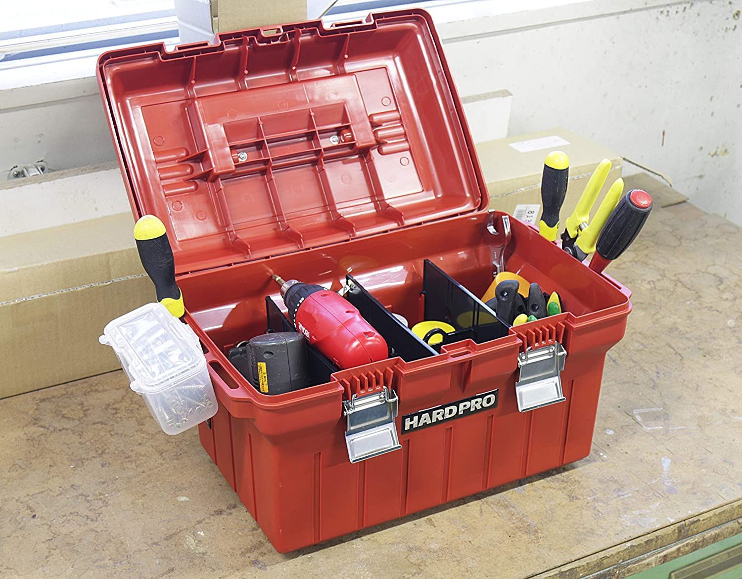 CONTIENT: 1 boîte à outils DIMENSIONS: 46 x 28 x 27 cm (L x P x H) CAPACITÃ? : Charge maximale : 30 kg DESIGN : Ã?quipé d'une poignée ferme pour rendre la boîte facile à transporter. Vendu avec des accessoires pour compartimenter la boîte avec différents types d'outils de bricolage. UTILISATION : Peut être utilisé à l'intérieur et à l'extérieur et est parfait pour stocker les outils de bricolage et de jardinage. MATÃ?RIAU : PolypropylÃ?ne (plastique) extra robuste