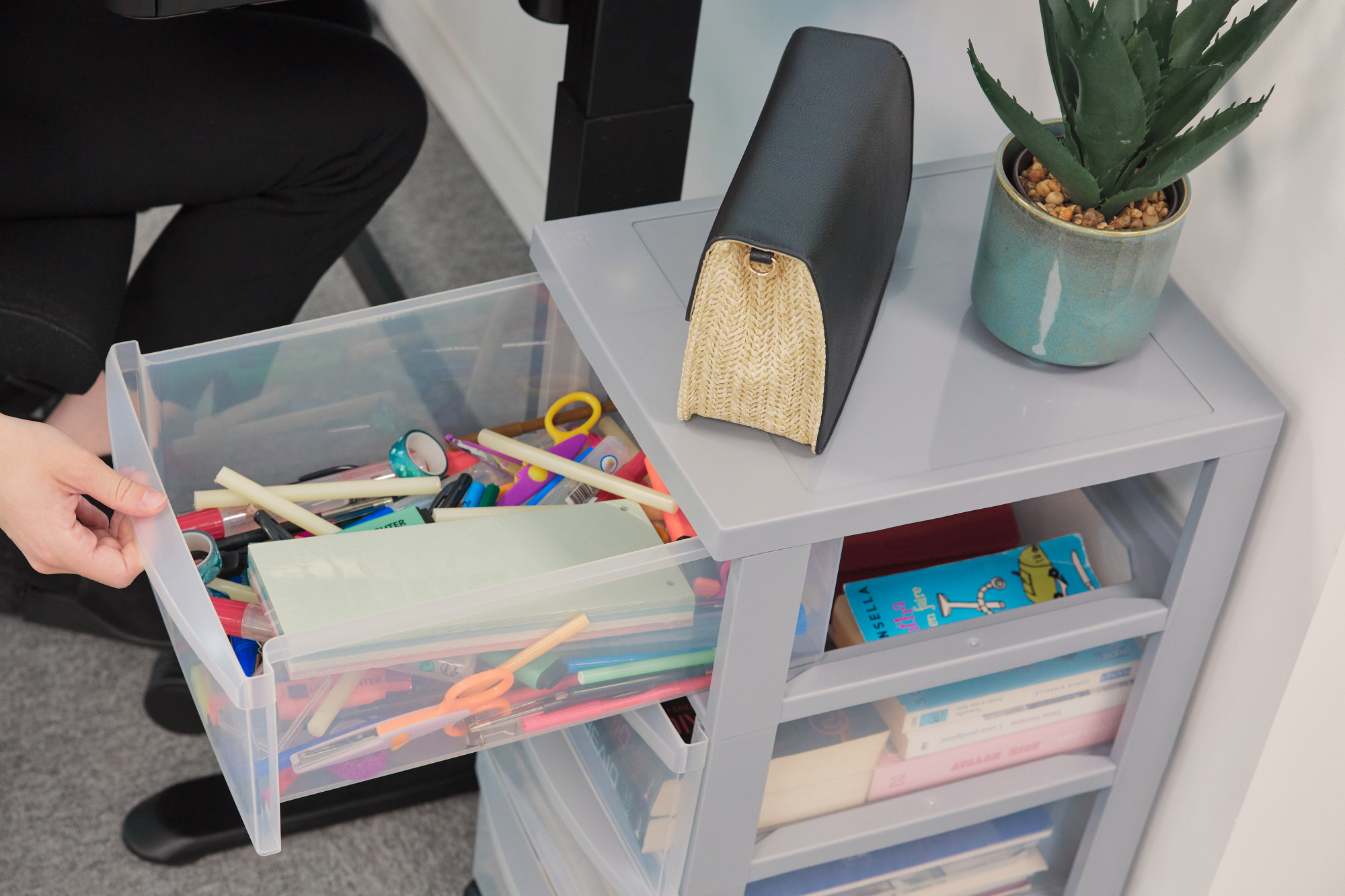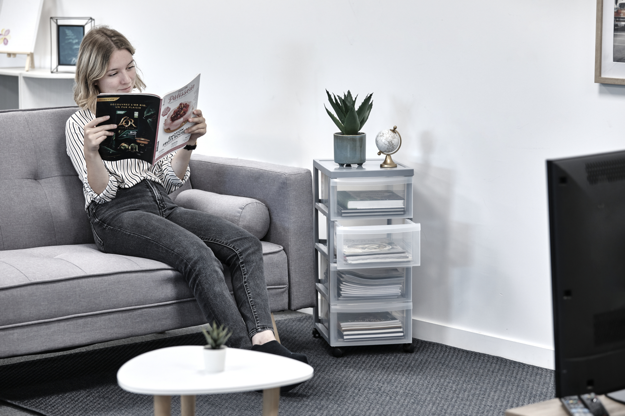 Au bureau, au salon ou à la chambre, si vous aimez le rangement, dites Welcome à cette tour de rangement modulable ! Ce produit saura être l'allié qui gardera vos lieux toujours ordonnés. Il dispose de tiroirs qui vous permettront de ranger du matériel ou des fournitures : collection de feutres et de stylos, carnets, agendas, papeterie... Assez compacte, cette tour mesure l'équivalent d'un format A5 ou A4. Vous n'aurez donc pas d'inquiétude, car cette tour saura trouver sa place dans différents endroits de votre domicile ou à qui vous l'offrirez tout simplement. Aussi, la matière de ce produit étant légère, elle vous facilitera l'entretien à partir d'un chiffon humide. Son design sobre, transparent et classique conviendra à tous les styles de décoration. De plus, elle se fondra aussi bien dans un univers industriel que contemporain. Les tiroirs transparents vous permettent de visualiser ce qui se trouve à l'intérieur sans avoir besoin de les ouvrir. Pour finir, déplacez très facilement ce produit d'une pièce à une autre grâce aux 4 roues 360° dont elle est dotée.