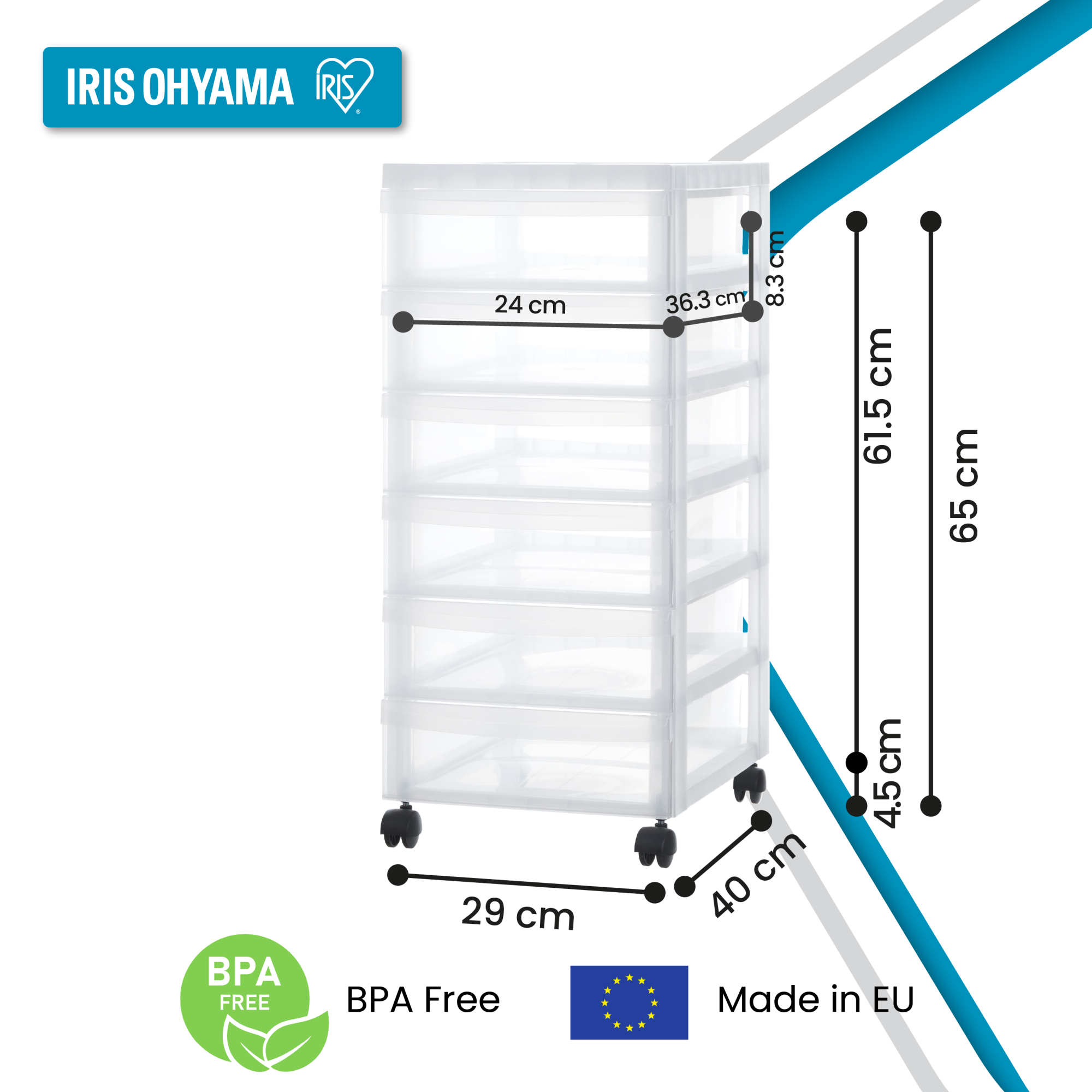DIMENSIONS DE LA TOUR DE RANGEMENT : Externes : L29 x P40 x H61.5 cm avec les roues et sans roues, il vous faut soustraire environ 6cm, dans la hauteur |Internes (tiroirs): L23.5 x P35.5 x H8.5 cm|La hauteur de la tour avec roulettes: 65.5 cm|Les roues : L 3.5 x P 3.5 x H 4.5 cm|Ce produit est une fabrication 100% européenne d'Iris Ohyama provenant de ses usines . CAPACITÉ DE LA TOUR DE RANGEMENT PLASTIQUE: Le volume de contenance de cette tour est 6 tiroirs de 7 L. Les tiroirs spacieux et de taille A4 de ce produit vous permettent de ranger toutes sortes d'objets, cela peut aller des articles de bureau aux vêtements. Vous pouvez stocker 1 pack de 500 feuilles A4 par tiroir. MATERIAU DE CASIERS DE RANGEMENT : Ce produit est fabriqué en plastique sans BPA (polypropylène). Cela garantit une résistance aux chocs et aux coups ainsi qu'un nettoyage simple de la boîte de rangement avec couvercle. POIGNÉE INTÉGRÉE ERGONOMIQUE : Ce produit est équipé d'une poignée ergonomique pour une ouverture facile et confortable des tiroirs. En cas de déménagement, vous n'aurez pas d'inquiétude à vous faire, car ce produit est léger, donc simple de transport d'un endroit à un autre. DESIGN DE TOUR DE RANGEMENT : À la recherche d'astuce de rangement Accueillez notre tour de rangement avec son haut astucieux qui vous aidera les petits objets ! Système d'arrêt des tiroirs, permettant d'éviter que les tiroirs ne tombent, pour une utilisation optimale de l'espace grâce à une forme optimisée. À la maison comme au bureau, ce produit saura satisfaire vos besoins et ceux des vôtres ! CONTENU DE LA LIVRAISON : 1 Tour de rangement livrée avec 4 roulettes 360° pour une mobilité accrue. Ce produit est livré dans un emballage conforme aux normes.