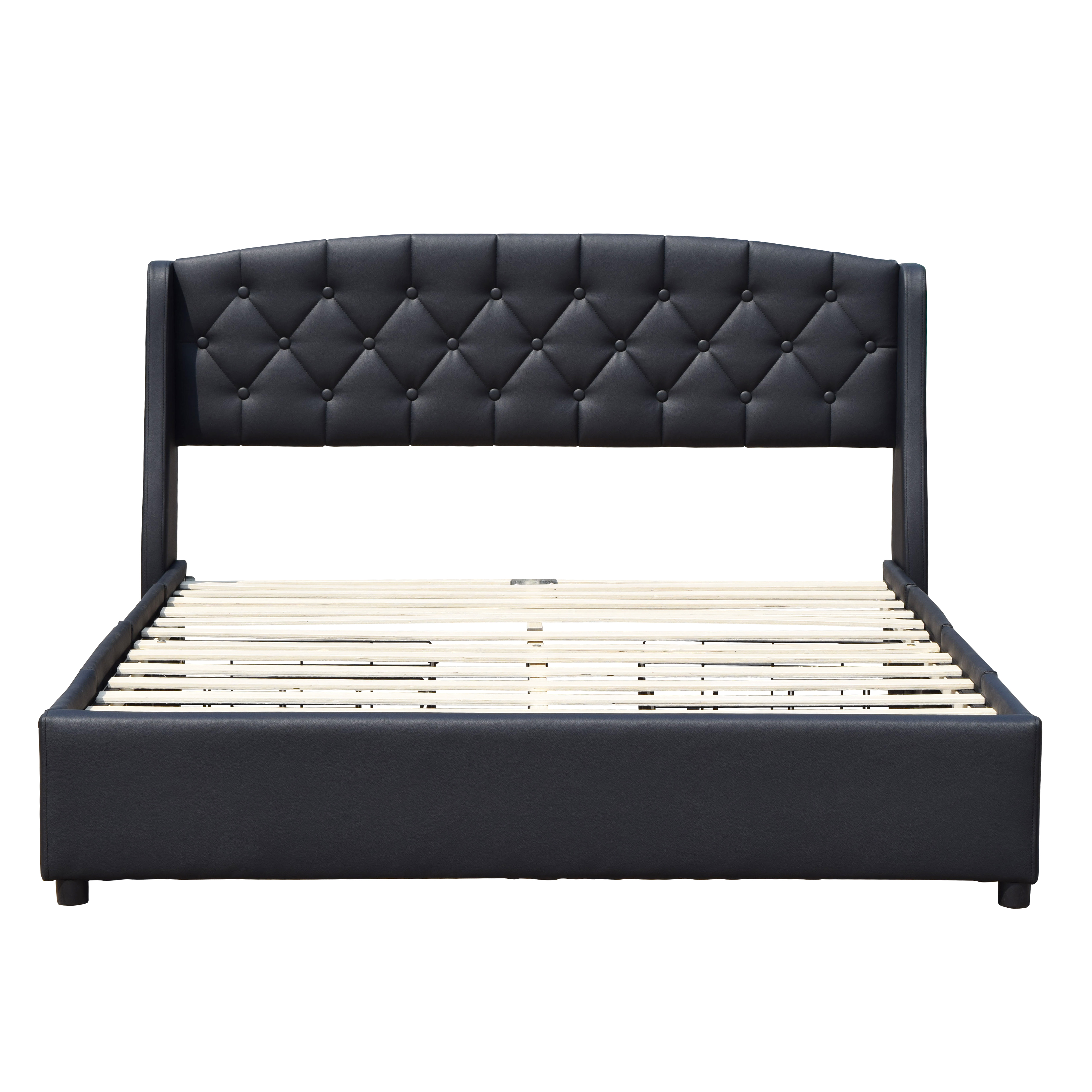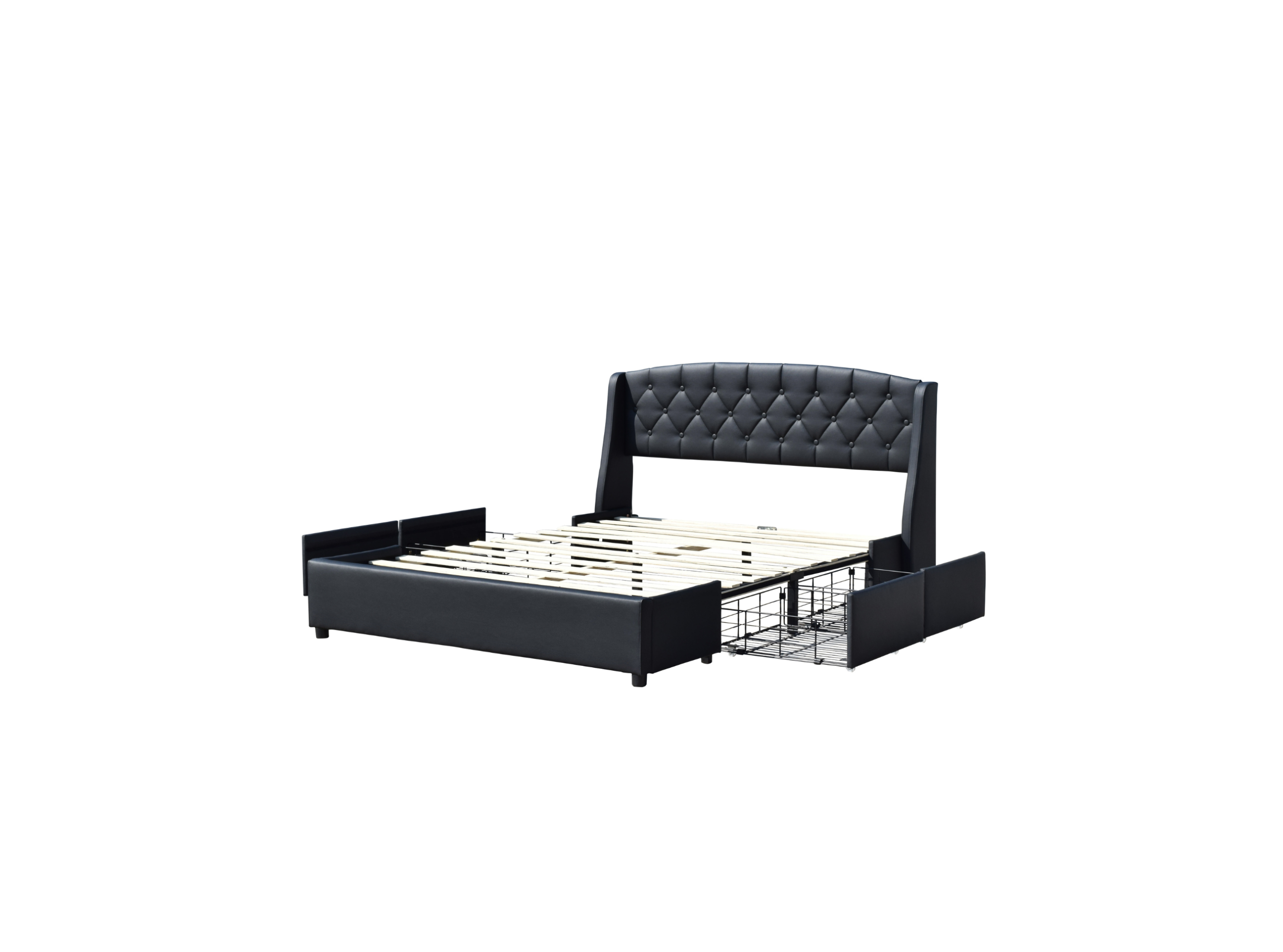 Lit + Sommier + Tête de Lit Hauteur 101 cm avec 4 tiroirs dimensions 51x46 cm + Pieds en 4 cm Couleur NOIR Caracteristiques: 1 Lit simple solide en bois, avec des lignes epurees, ce lit sera un ajout apprecie aux chambres et au salon, egalement ideal pour les petits espaces, les enfants, les adolescent, les invites et les adultes. 2 Un sommier solide avec de 13 resistantes et confortables Lattes en bois 5 cm de large et 0,9 cm d'epaisseur + Pieds Hauteur 4 cm 3 Resistant aux chocs et aux rayures epaisseur du Metal +/- 1,2 mm . Tissu PVC Simili etanche tres facile d'entretien 4 Livraison rapide 5 Hauteur de la Tête de Lit Hauteur 101 cm Capitonnee, Hauteur des longs pans 18 cm et Epaisseur 3 cm S'il vous plait noter: * Le matelas n'est pas inclus. * Ne serrez pas les vis jusqu'a ce qu'elles soient completement assemblees. * Ne Pas utiliser ce produit si des pieces sont manquantes, endommagees ou usees. * Ne Pas permettre aux enfants de sauter sur le lit, car cela pourrait causer des dommages au chassis. * Veuillez verifier et serrer toutes les vis et boulons vers le haut tous les 3 mois pour assurer la stabilite.