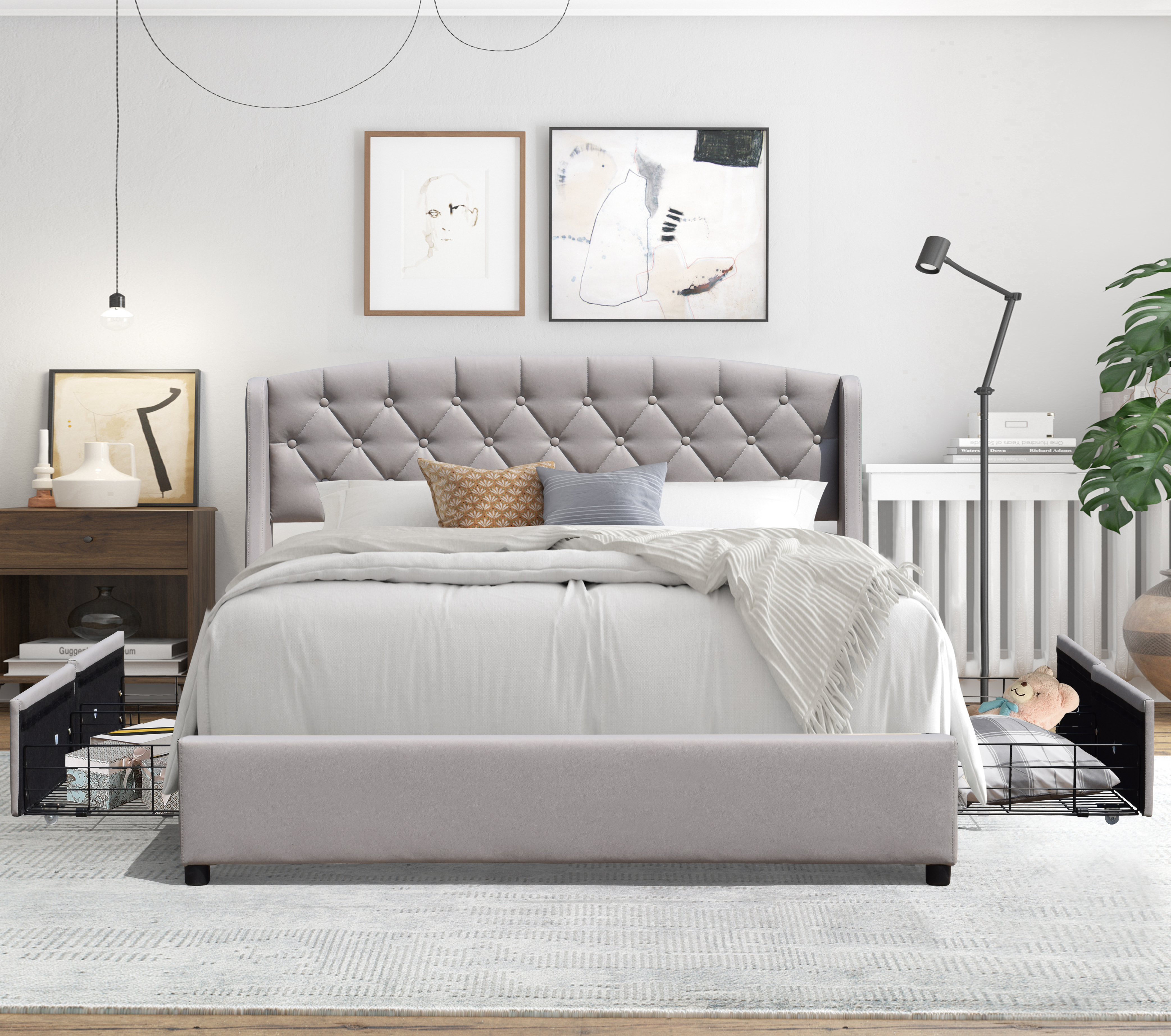 iris - Solide et Confortable Lit 160x200 avec Sommier avec 4 tiroirs + Tete de lit Couleur GRIS + Pieds e