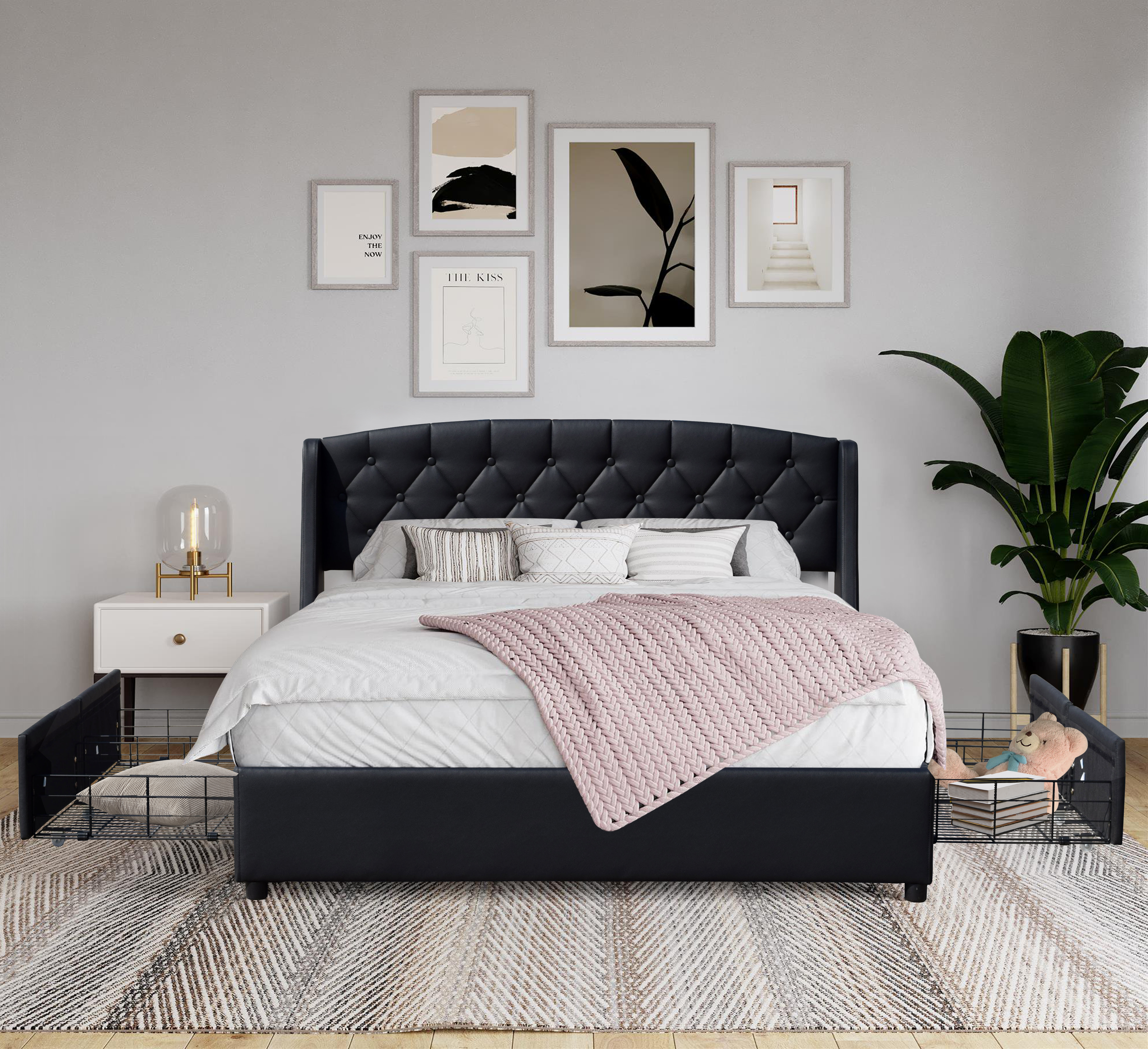 iris - Solide et Confortable Lit 160x200 avec Sommier avec 4 tiroirs + Tete de lit Couleur NOIR + Pieds e
