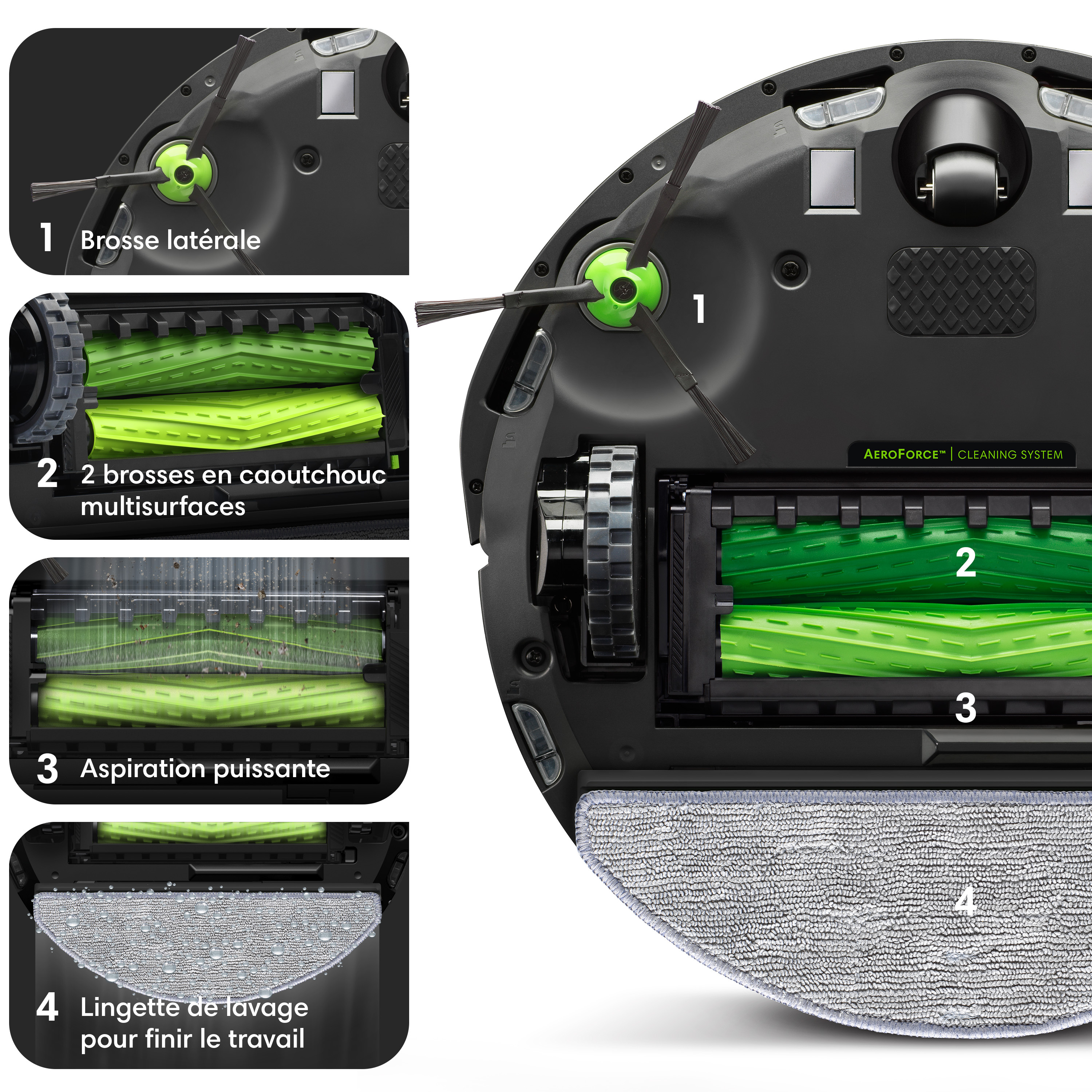 | Accessoires inclus | Système d'auto-vidage Clean Base, Filtre haute efficacité supplémentaire, Brosse latérale supplémentaire, Bac interchangeable Roomba Combo, Lingette de lavage en microfibre, Sac AllergenLock supplémentaire |
