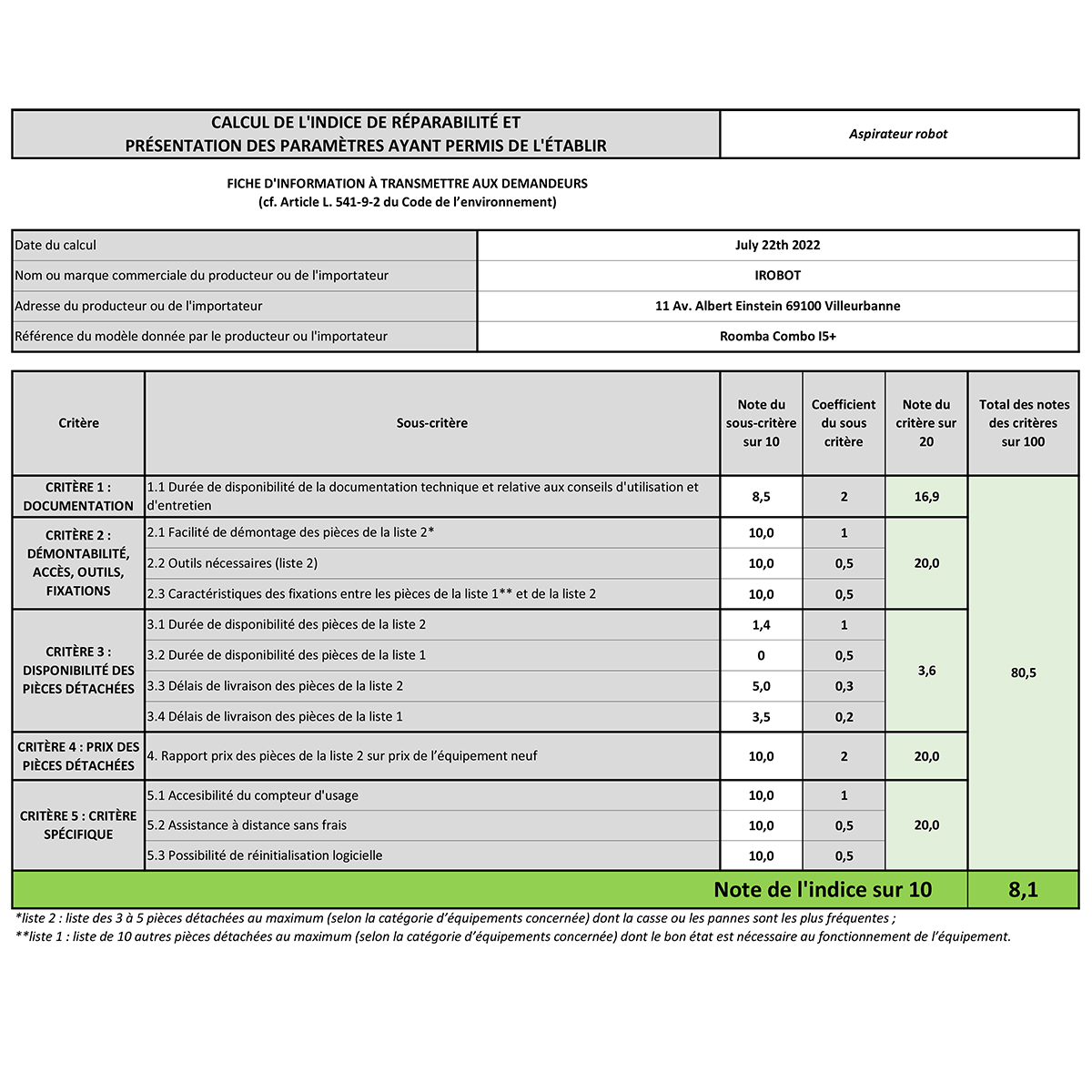 Indice de réparabilité 8,1 / 10