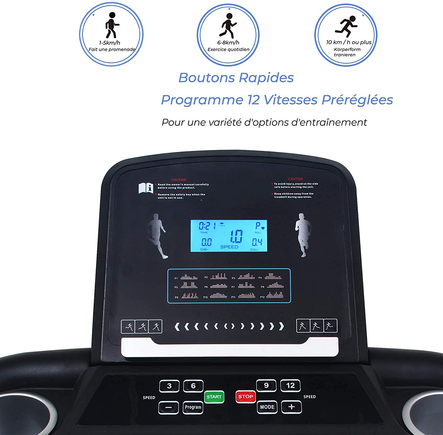 【PROTECTION】Moteur 750W, avec le tapis de course SY-T2702, entraînez-vous en douceur. La surface de course (1000 x 400 mm) est composée de 5 couches avec système d'amortissement à 8 zones. Vos articulations sont ainsi protégées contre les chocs. Taille étendue: 127 x 66 x 119 cm, Poids maximal de l'utilisateur: 120 KG.