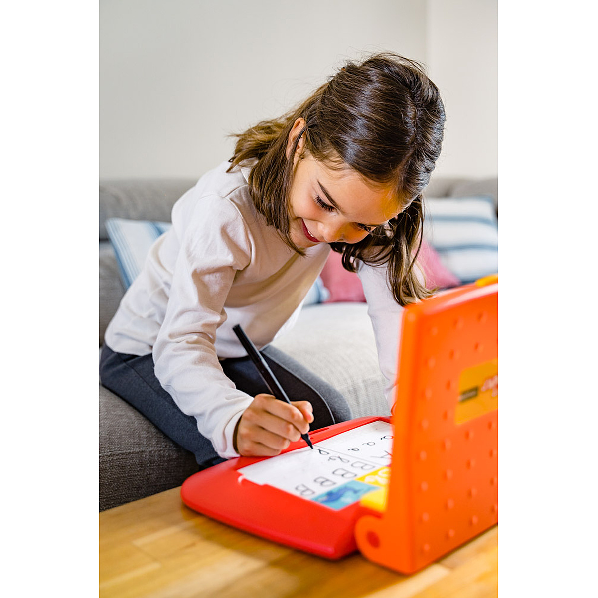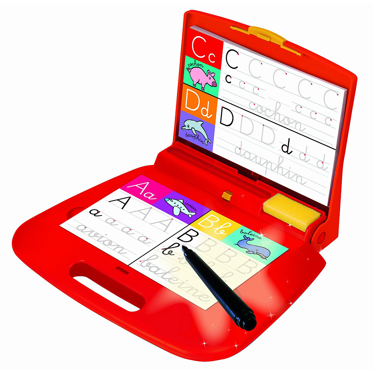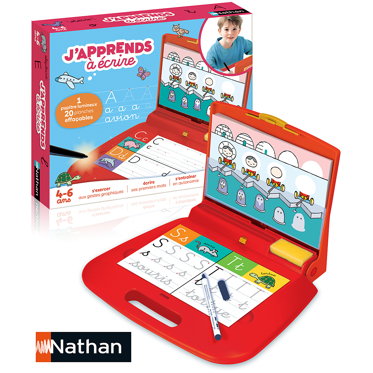 20 planches effaçables pour apprendre à écrire en s'amusant. L'enfant s'excerce aux premiers gestes d'écritures (lignes droites, vagues, ronds,) et découvre les 26 lettres de l'alphabet. Le pupitre lumineux lui donne le modèle pour écrire ses premiers mots.