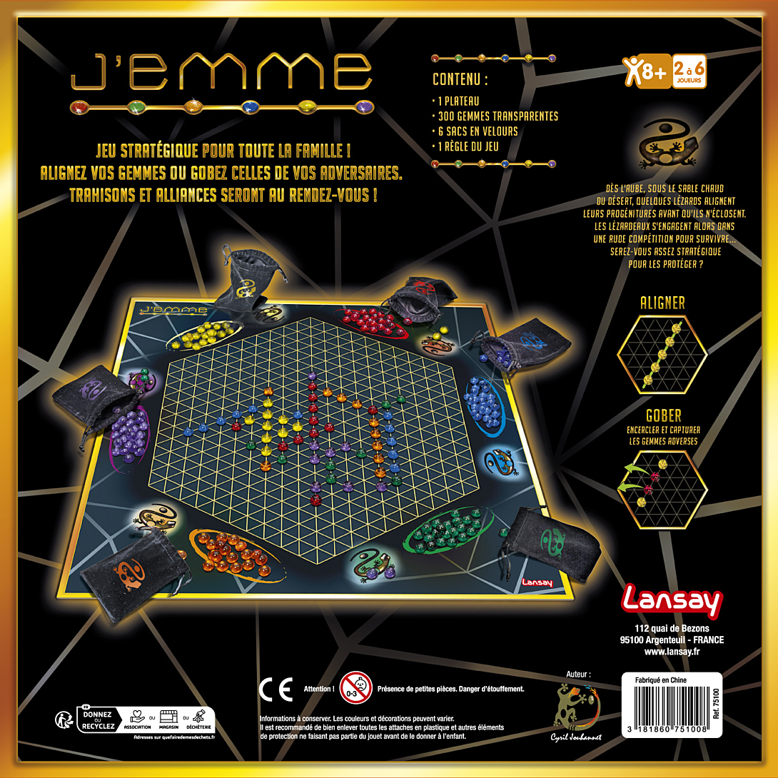 J'emme, jeu stratégique pour toute la famille ! Soyez le plus rapide à aligner vos gemmes et protégez-les avant de vous les faire gober ! Dès 8 ans.
