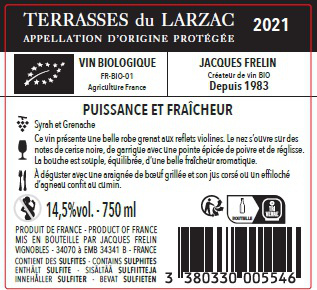 | Libellé | Jacques Frelin Terrasses du Larzac BIO, 2021 - Terrasses du Larzac AOP - Rouge - 75 cl |