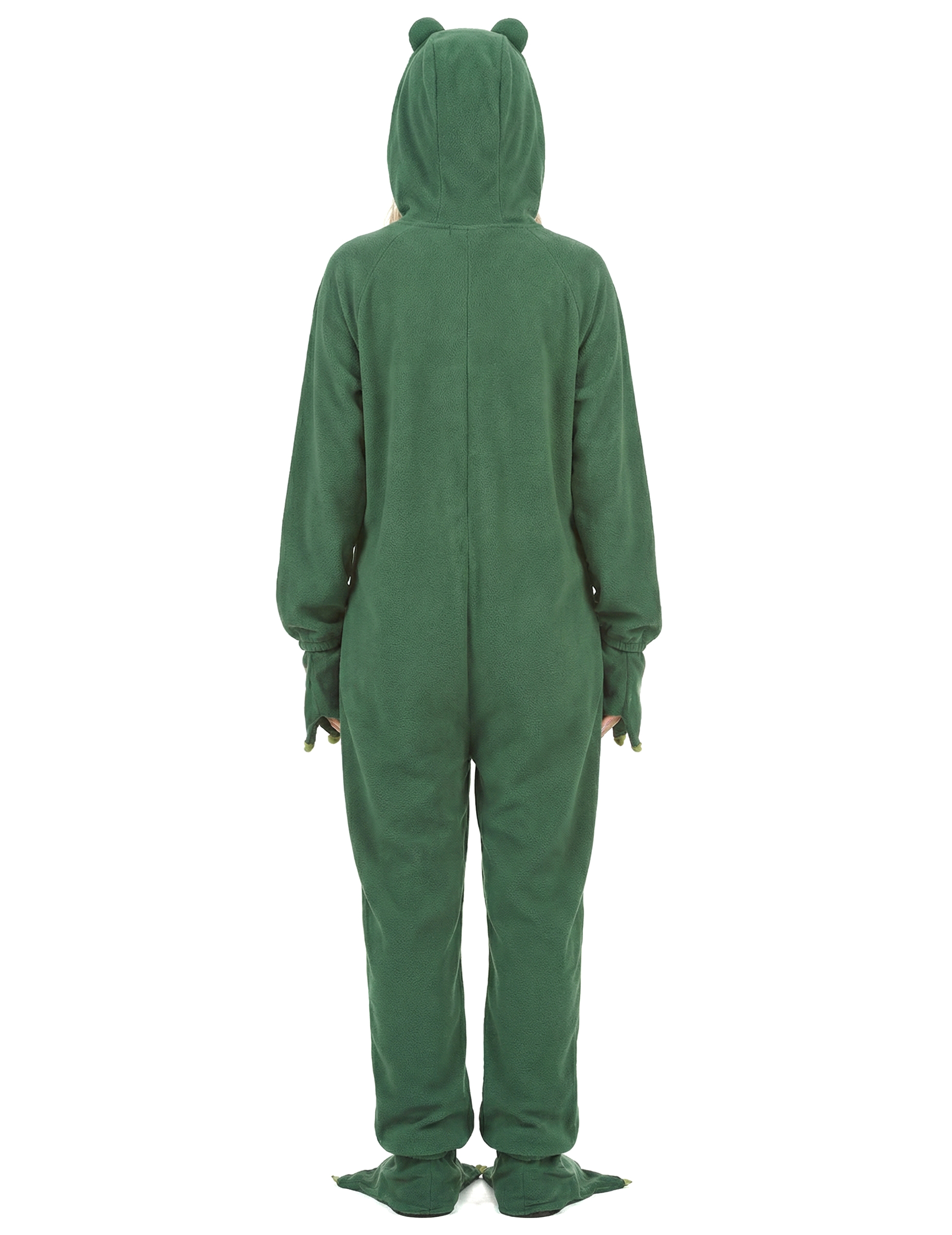 Cette combinaison de grenouille pour femme est en polaire vert foncé avec le ventre vert clair. Elle se ferme à l'avant par une fermeture éclaire. La large capuche, incluse, montre deux yeux blanc et deux petites narines. Ce déguisement comprend également deux couvres-mains et deux sur-chaussures, représentant les pattes palmées caractéristiques du batracien. Ce déguisement de grenouille sera parfait pour sautiller de partout et créer l'hilarité de vos amis lors d'une soirée costumée !