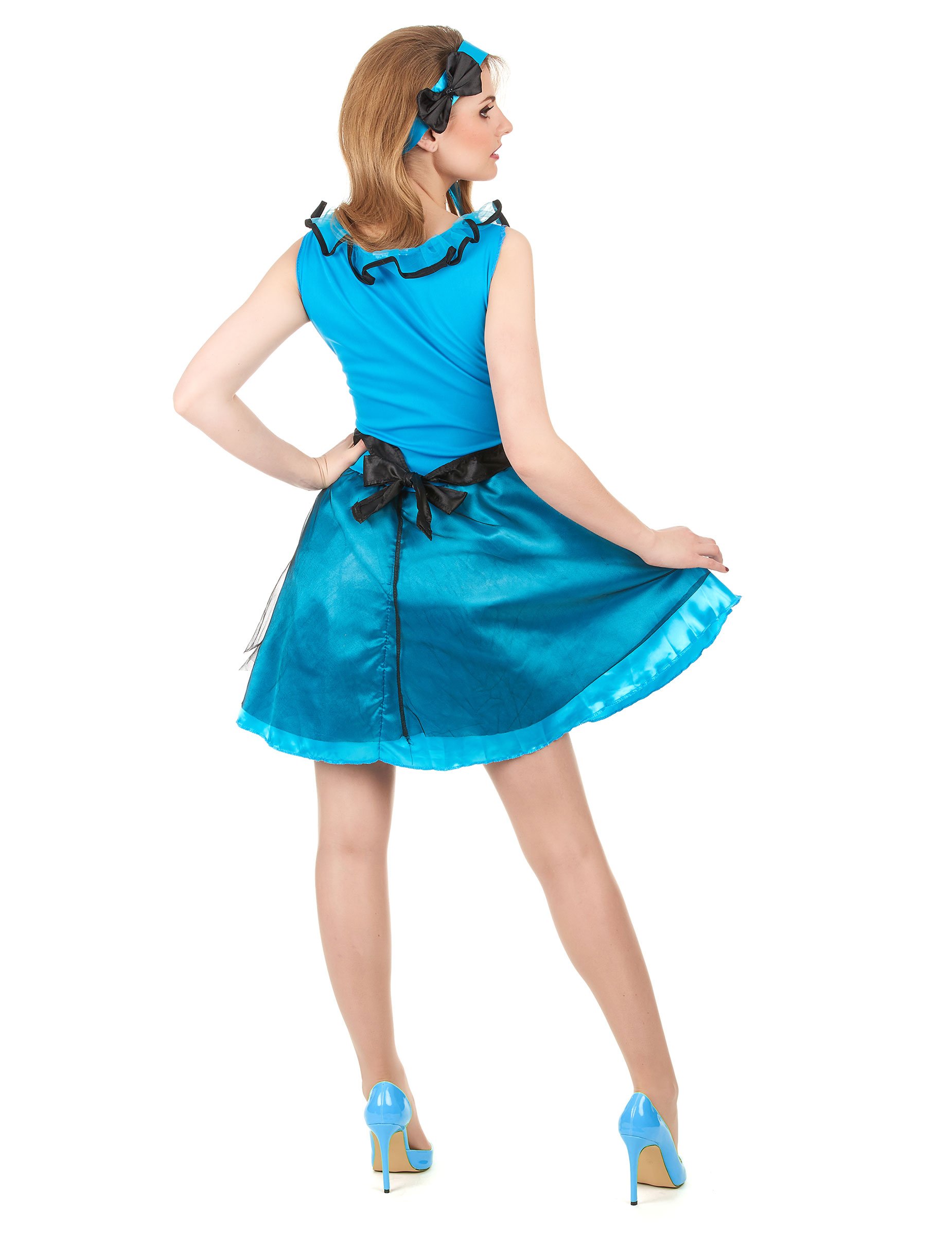 Ce déguisement pour adulte représente une jeune fille au pays imaginaire. Il comprend une robe avec un tablier, une ceinture et un bandeau (chaussures non incluses). La robe est en polyester bleu satiné. Sans manche, elle a des froufrous en voile fin sur les bretelles. Un jupon de voile noir recouvre la jupe bleue et un voile blanc en résille donne du volume à l'ensemble. Sur la poitrine une bande de tissu à damiers est cousue pour simuler le tablier. Le bas du tablier est blanc avec un liseré noir et un gros coeur rouge. Une ceinture avec un noeud noir satiné mesurant 16 x 9 cm souligne la taille. Le bandeau est du même bleu satiné que la robe. Il mesure 84 x 6cm. Un gros noeud noir de 11 x 9 cm est cousu sur le dessus. Déguisez-vous en Dame de Cœur originale si vous êtes invitée à une soirée à thème.