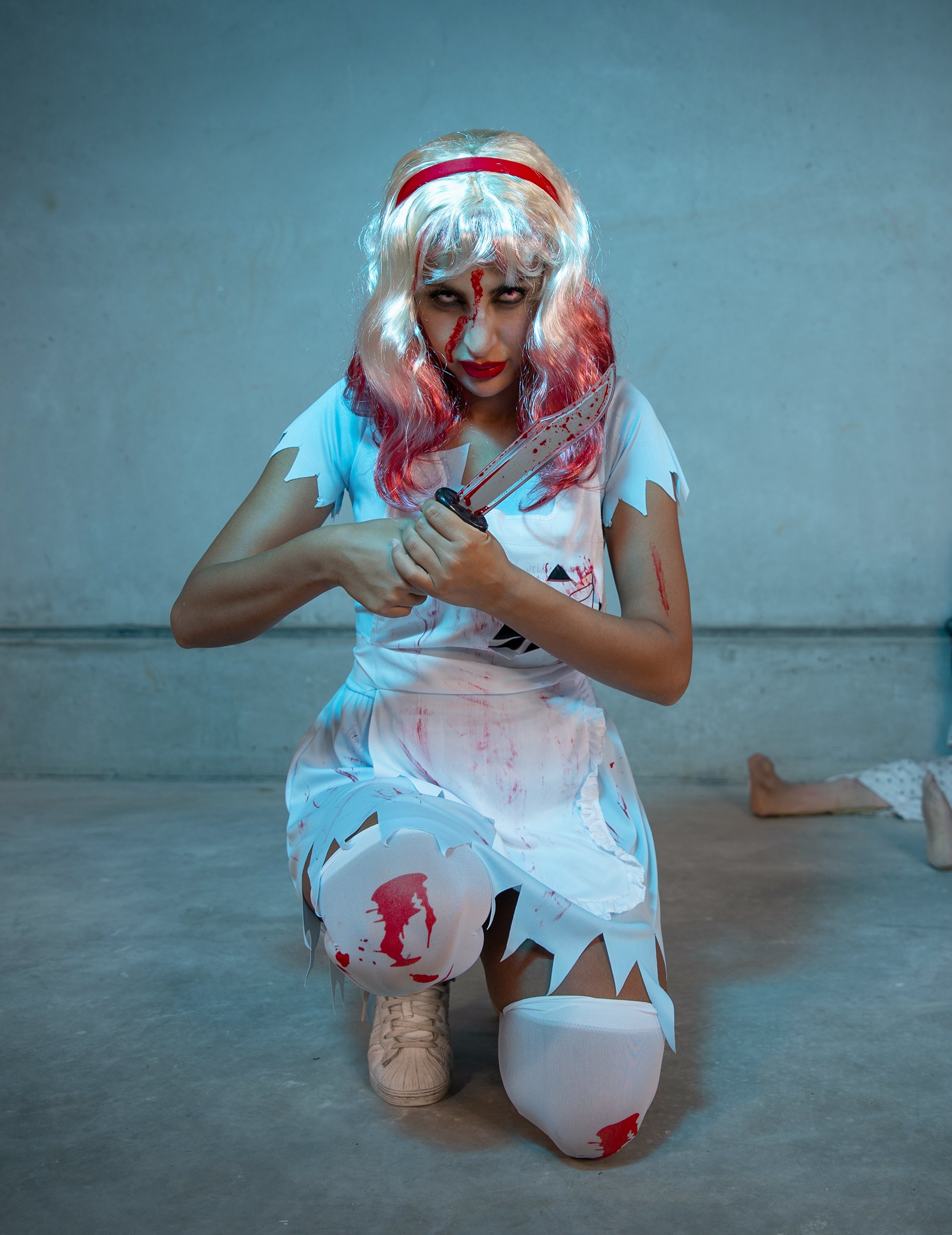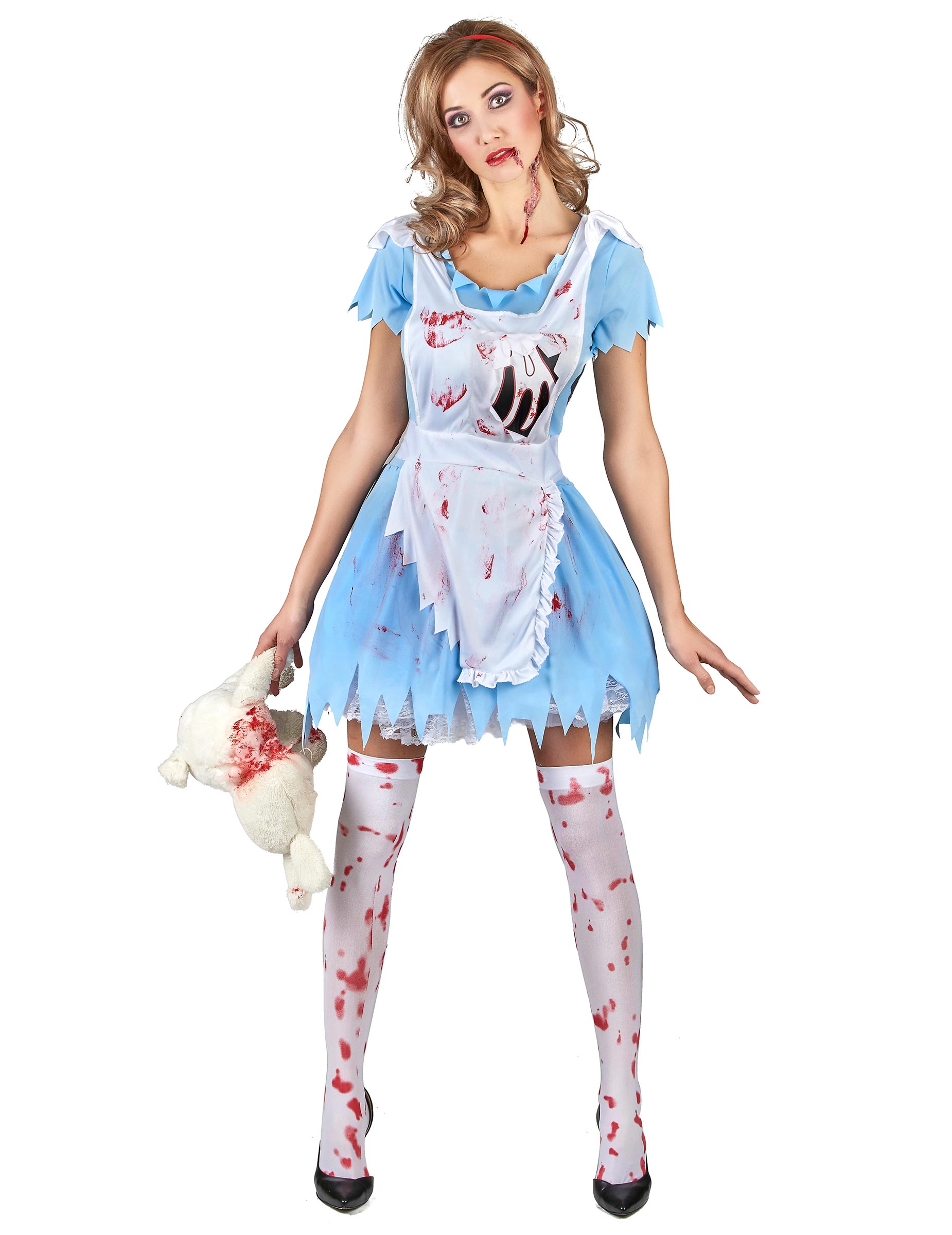 Ce déguisement de Alice Halloween est pour femme et comprend une robe, un tablier et un serre-tête. La robe courte est en tissu fin bleu ciel. Le col, les manches et le bas de la robe sont coupés en pointes et l'ensemble est parsemé de tâches de faux sang. Le tablier à effets déchiré et ensanglanté, s'enfile comme un sac à dos par le devant et s'attache dans le dos au niveau de la taille. Enfin le serre tête est en plastique souple recouvert de tissu rouge. Il accessoirisera parfaitement vos cheveux détachés ou bien votre chignon. Cet ensemble gore sorti d'un film d'horreur sera parfait pour être belle et effrayante lors d'une soirée déguisée telle que Halloween !