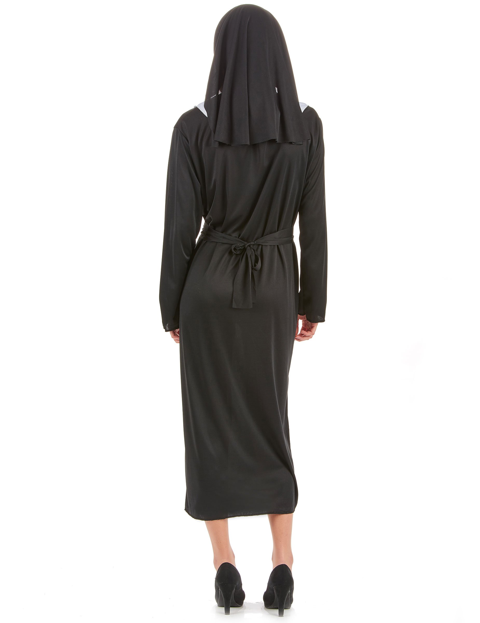 Ce déguisement de bonne soeur pour adulte se compose d'une robe et d'une coiffe. La robe noire est ample et à manches longues. Un col blanc orne ce tissu, et se ferme à l'aide d'un scratch sur la nuque. La coiffe blanche et noire se positionne sur la tête grâce à un élastique blanc. Lors d'une soirée déguisée comme Halloween, Carnaval ou pour un enterrement de vie de jeune fille, déguisez-vous en religieuse sérieuse.