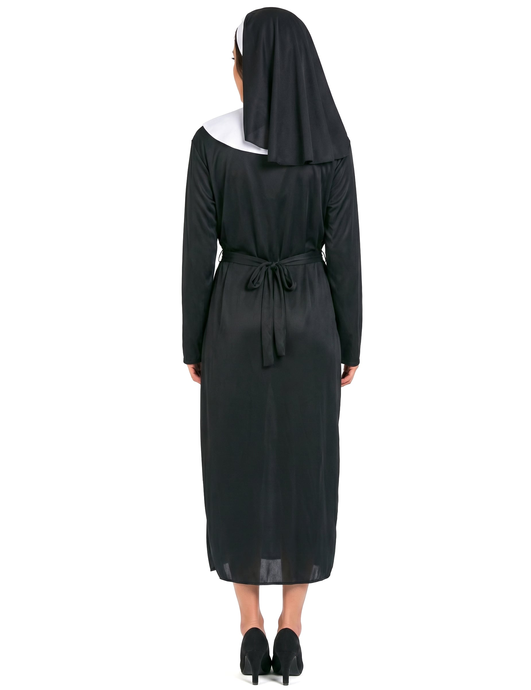 Ce déguisement de bonne soeur pour adulte se compose d'une robe et d'une coiffe. La robe noire est ample et à manches longues. Un col blanc orne ce tissu, et se ferme à l'aide d'un scratch sur la nuque. La coiffe blanche et noire se positionne sur la tête grâce à un élastique blanc. Lors d'une soirée déguisée comme Halloween, Carnaval ou pour un enterrement de vie de jeune fille, déguisez-vous en religieuse sérieuse.