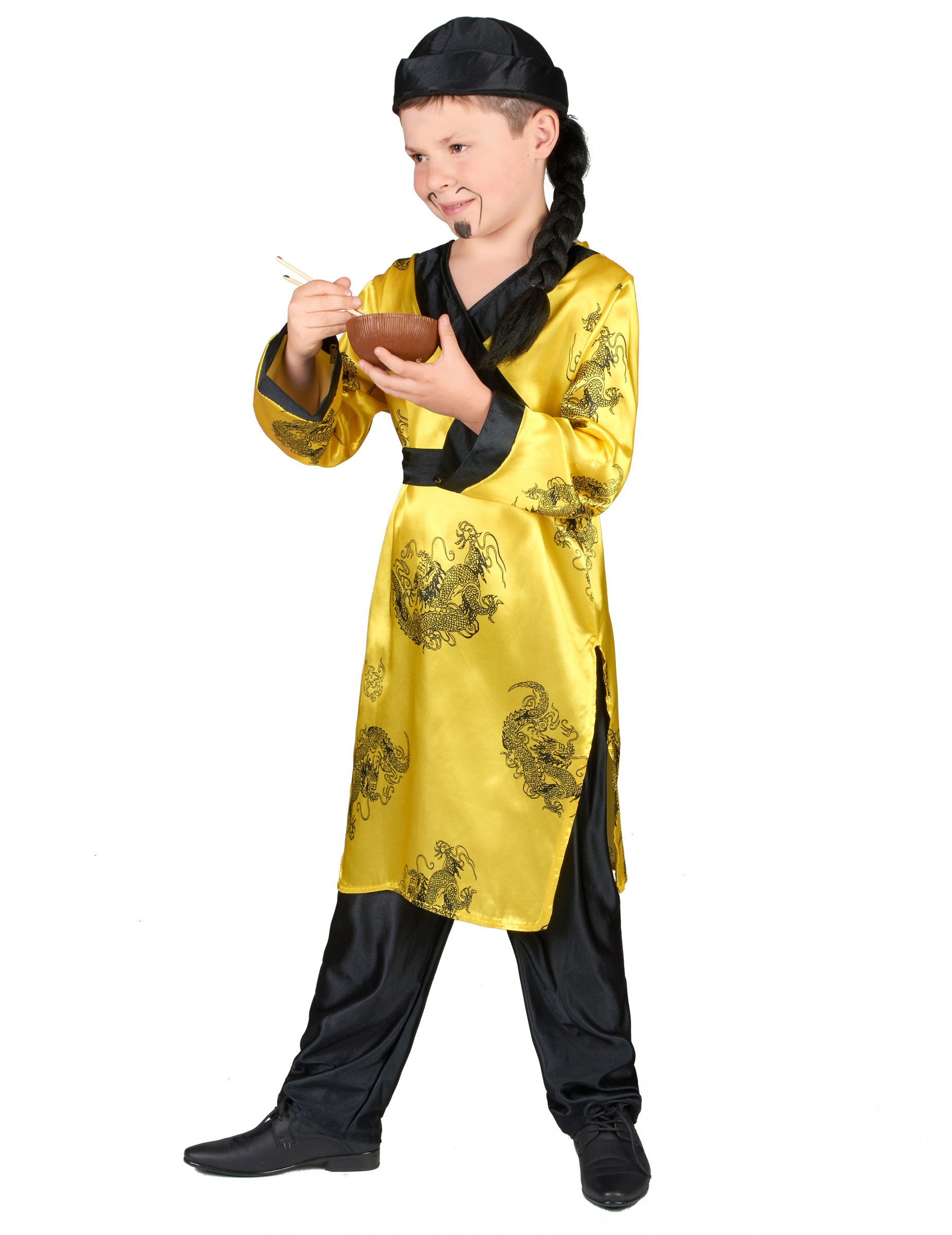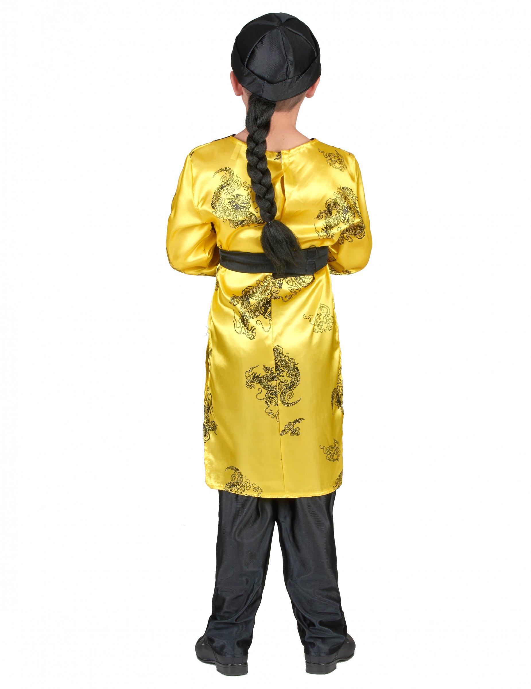 Ce déguisement traditionnel de chinois pour garçon comprend une longue tunique légère et satinée avec motifs dragon et fendue sur les côtés, un pantalon noir brillant à taille élastique, une ceinture à scratche et une coiffe avec tresse en cheveux synthétiques (Moustache et chaussures non incluses). Cette tenue traditionnelle de chinois sera parfaite pour les anniversaires déguisés, pour un spectacle ou pour le Carnaval.