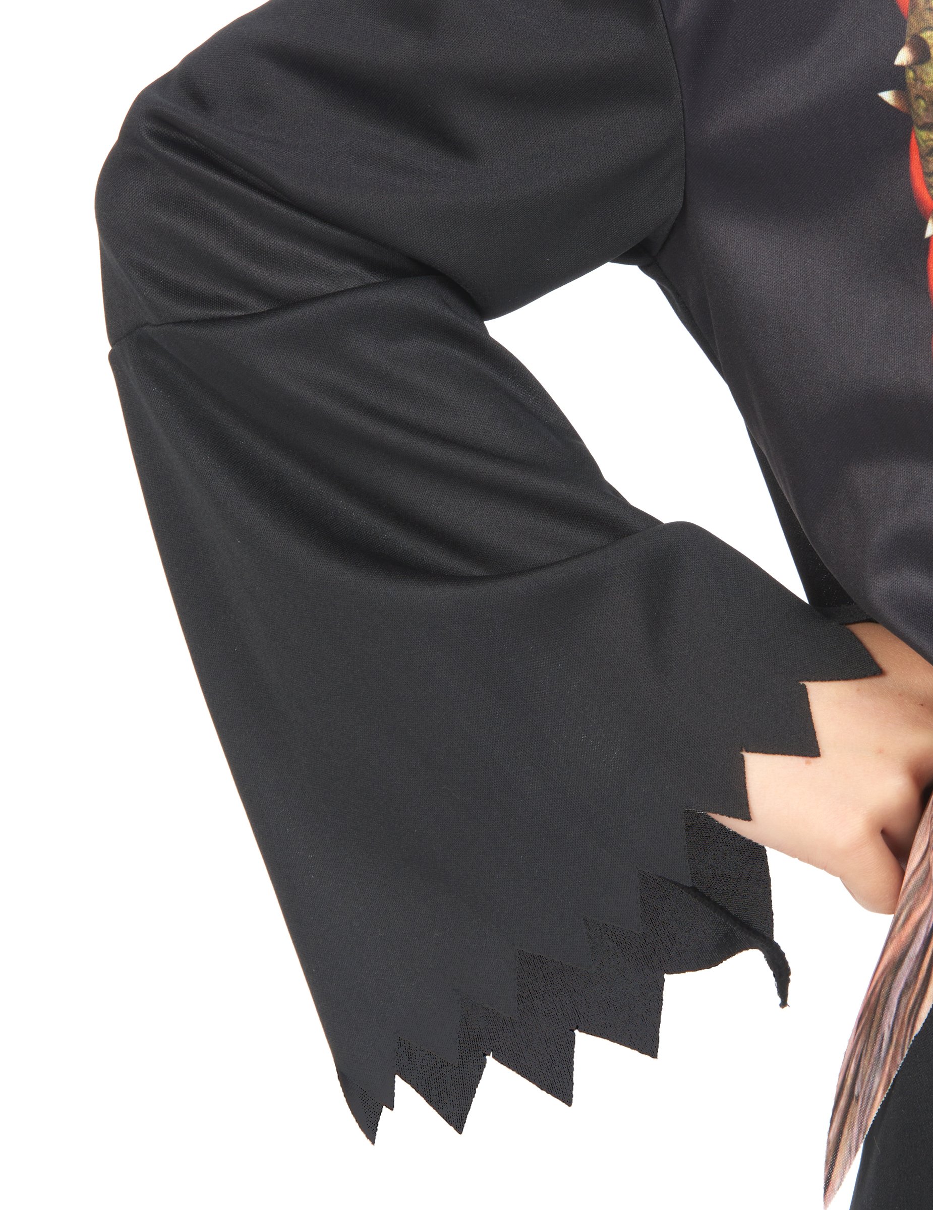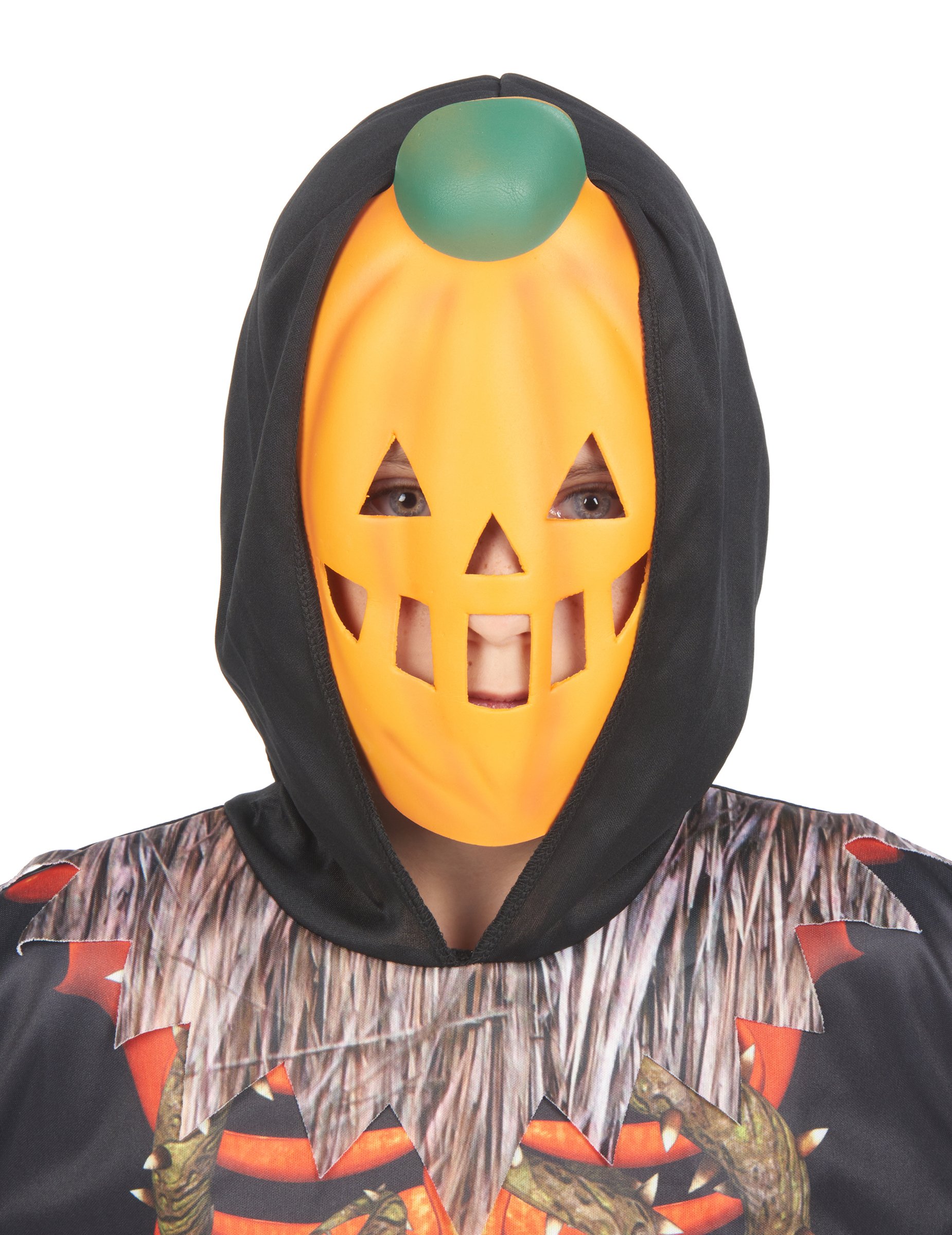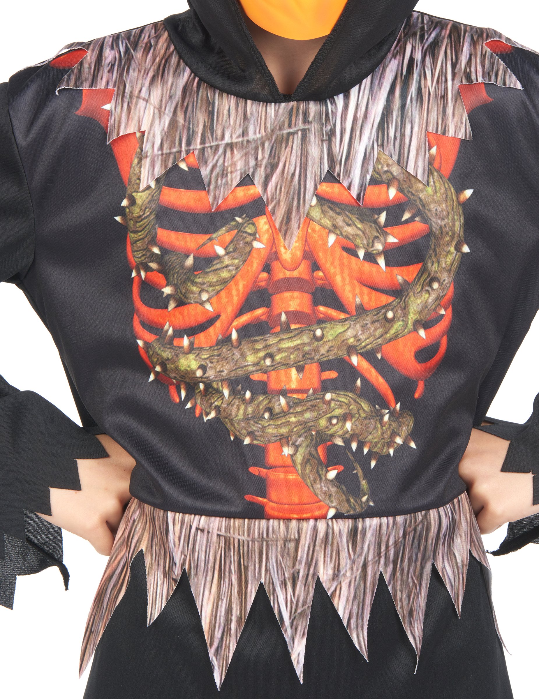 Ce déguisement de citrouille squelette est pour enfant. Il comprend un masque et une robe à capuche. La robe est noire à manches longues. Ses extrémités sont coupées en dent. Sur le buste est imprimé un squelette orange entouré d'une branche à épines. La robe comprend un col à motifs en bois et un tour de taille du même motif. La capuche est noire. Le masque orange représente le visage d'une citrouille. Les trous représentent les détails du visage. Une bosse verte sur le dessus du masque représente la tige de la citrouille. Ce déguisement de squelette de citrouille vous permettra d'avoir le déguisement le plus original pour Halloween !