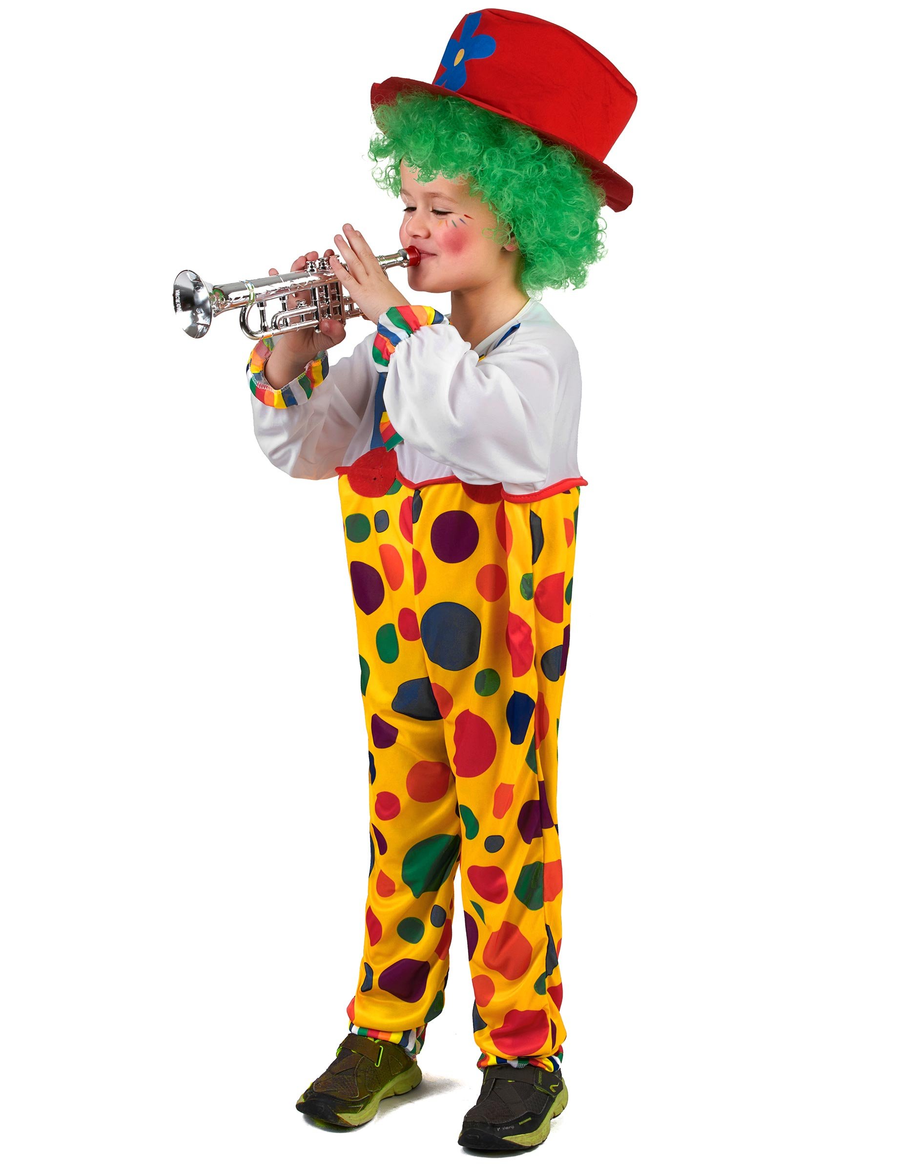 Ce déguisement de clown pour enfant comprend une combinaison ainsi qu'un chapeau (chaussures, perruque, anneaux et trompette non inclus). La combinaison est à manches et jambes longues terminées par des élastiques. L'ensemble de toutes les couleurs est porté large pour un effet comique totalement en accord avec l'image du clown. L'habit évoque clairement une salopette à pois multicolores sur fond jaune avec bretelles bleues à boutons rouges et t-shirt blanc à noeud papillon. Le chapeau en feutrine épaisse est rouge avec une fleur bleue. Il complète l'ensemble de manière très rigolote. Pour un goûter d'anniversaire ou bien pour le Carnaval, ce déguisement plein de couleur fera de votre enfant le plus adorable des comiques de cirque.