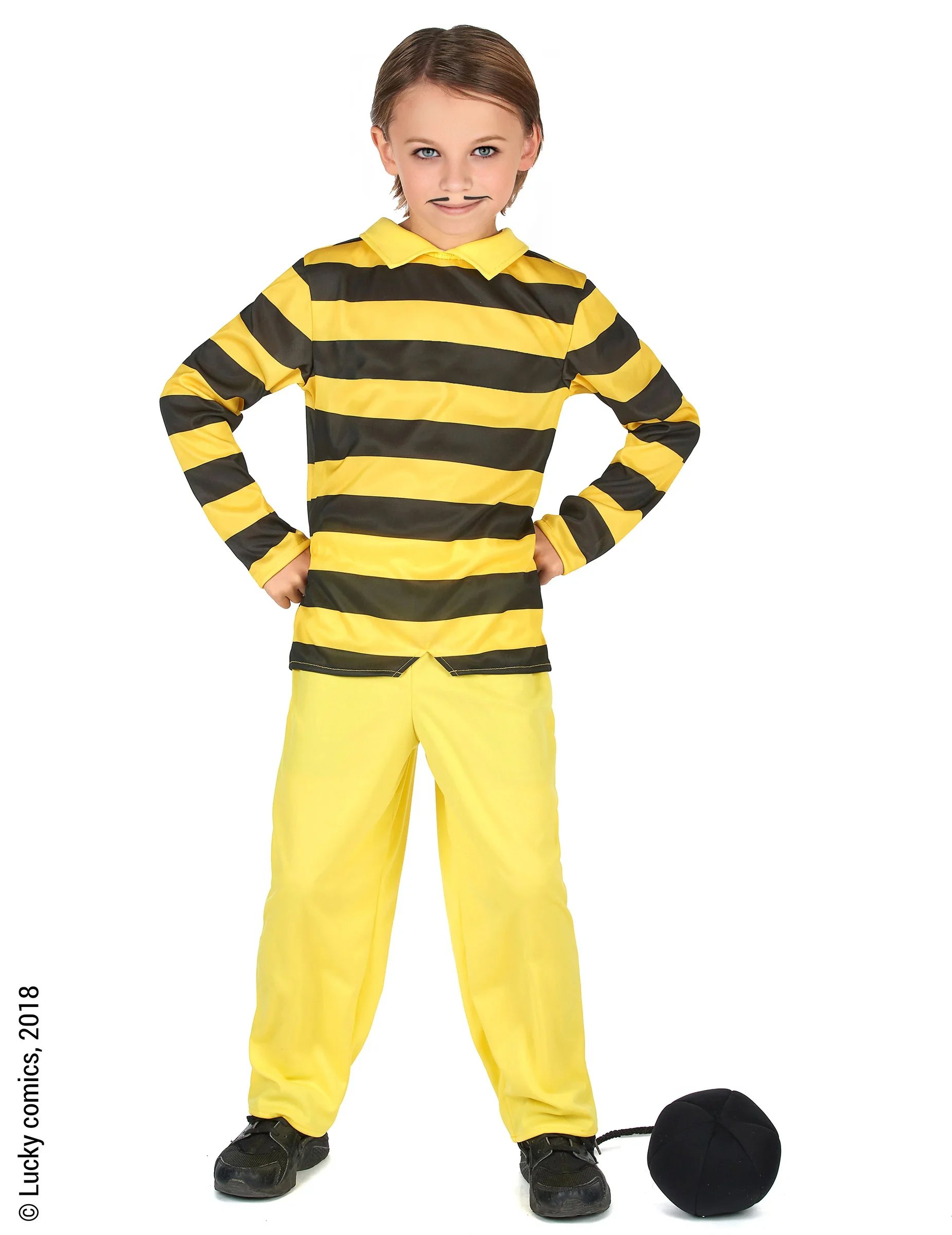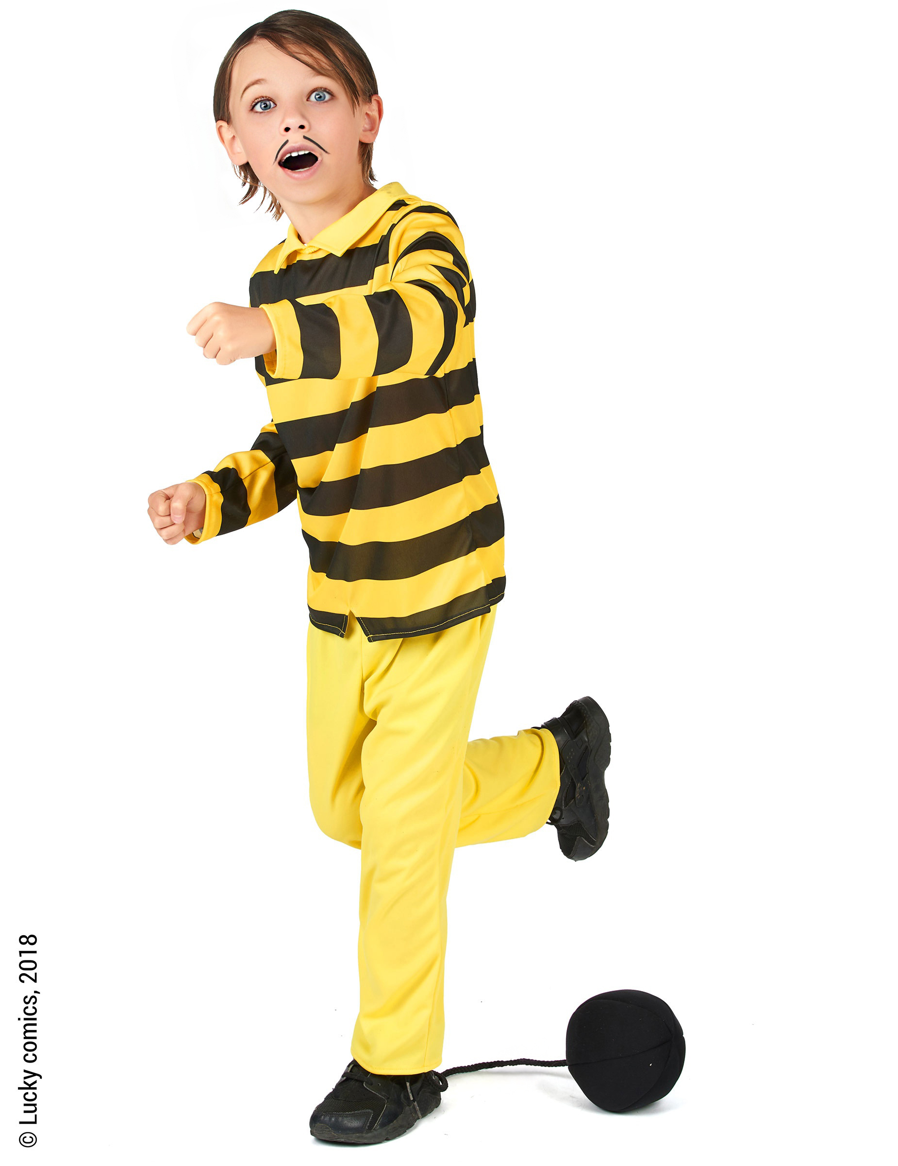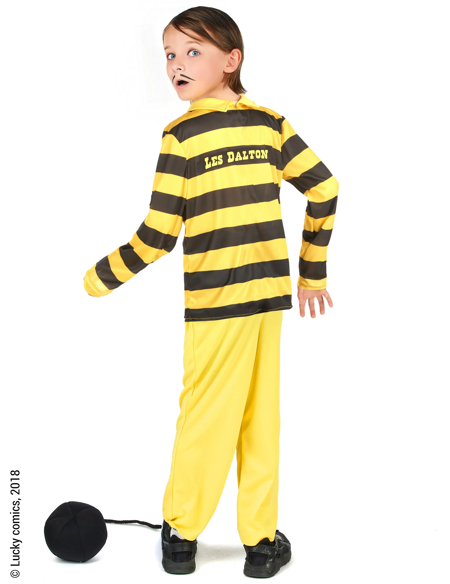 Ce déguisement Dalton pour enfant est sous licence officielle Lucky Luke. Il se compose d'un haut, d'un panatalon et d'un boulet. Le haut, à manches longues, est rayé jaune et noir avec un col entièrement jaune. Le pantalon est à coupe droite et entièrement jaune lui aussi. Et pour accessoiriser ce déguisement et le rendre encore plus réaliste un boulet de prisonnier qui s'attache autour de la cheville est inclus ! Ce déguisement sera parfait pour incarner l'un des célébres frères Dalton, lors du prochain carnaval.