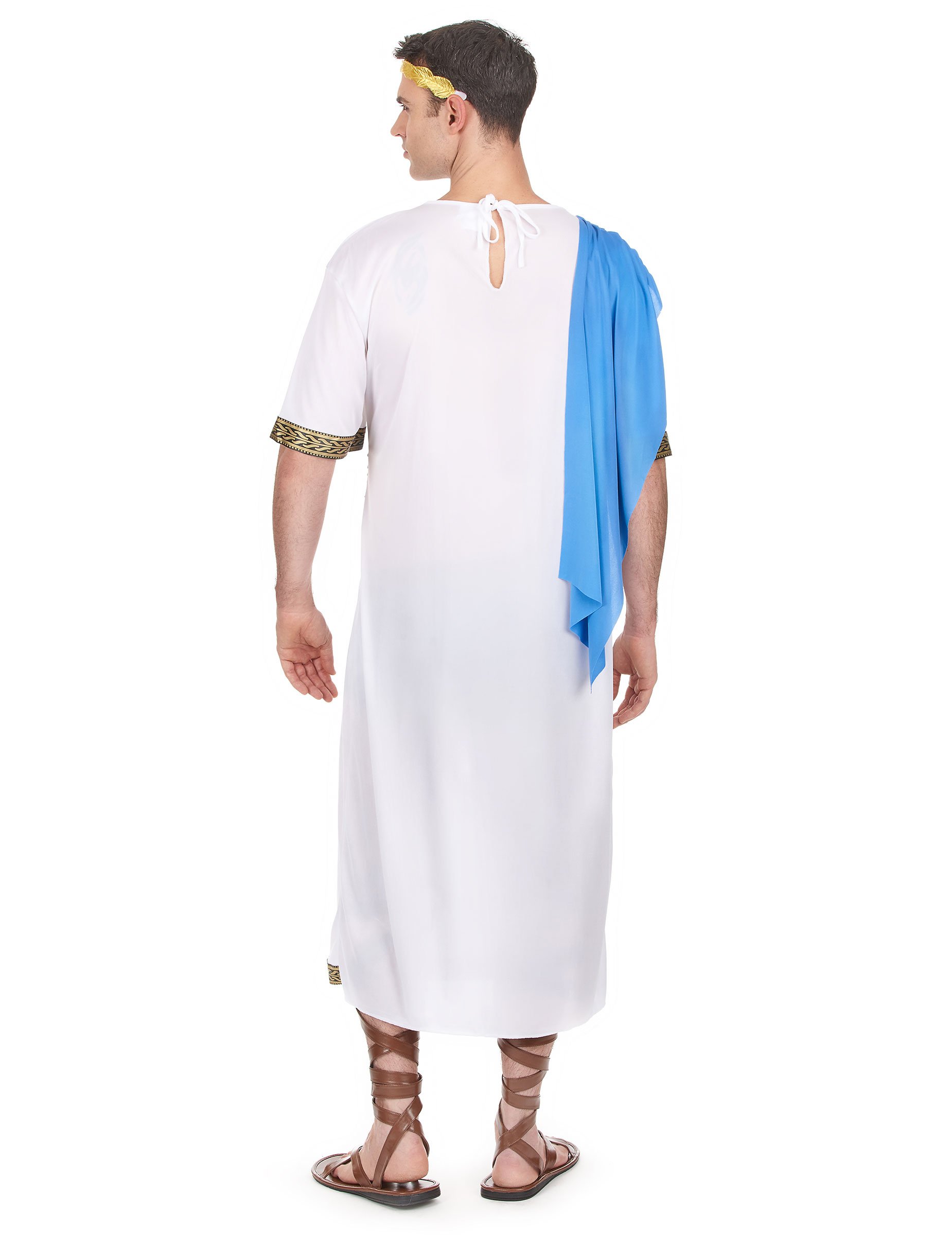 Ce déguisement de dieu Grec pour homme se compose d'une robe et d'une coiffe (chaussures non incluses). La robe est blanche à manches courtes. Le bas de la robe, des manches ainsi que l'encolure sont bordés d'un large galon noir et or. Un drapé bleu est présent à l'avant de la robe et tombe derrière l'épaule droite. Cette robe se ferme dans le dos à l'aide de 2 liens à nouer. Enfin, une coiffe représentant une couronne de laurier couleur or vient compléter ce costume. Il s'agit d'un serre tête en plastique blanc avec des fausses feuilles de laurier dorées dessus. Ce déguisement sera parfait pour vous mettre dans la peau d'un dieu Grec le temps d'une soirée sur le thème de la mythologie.