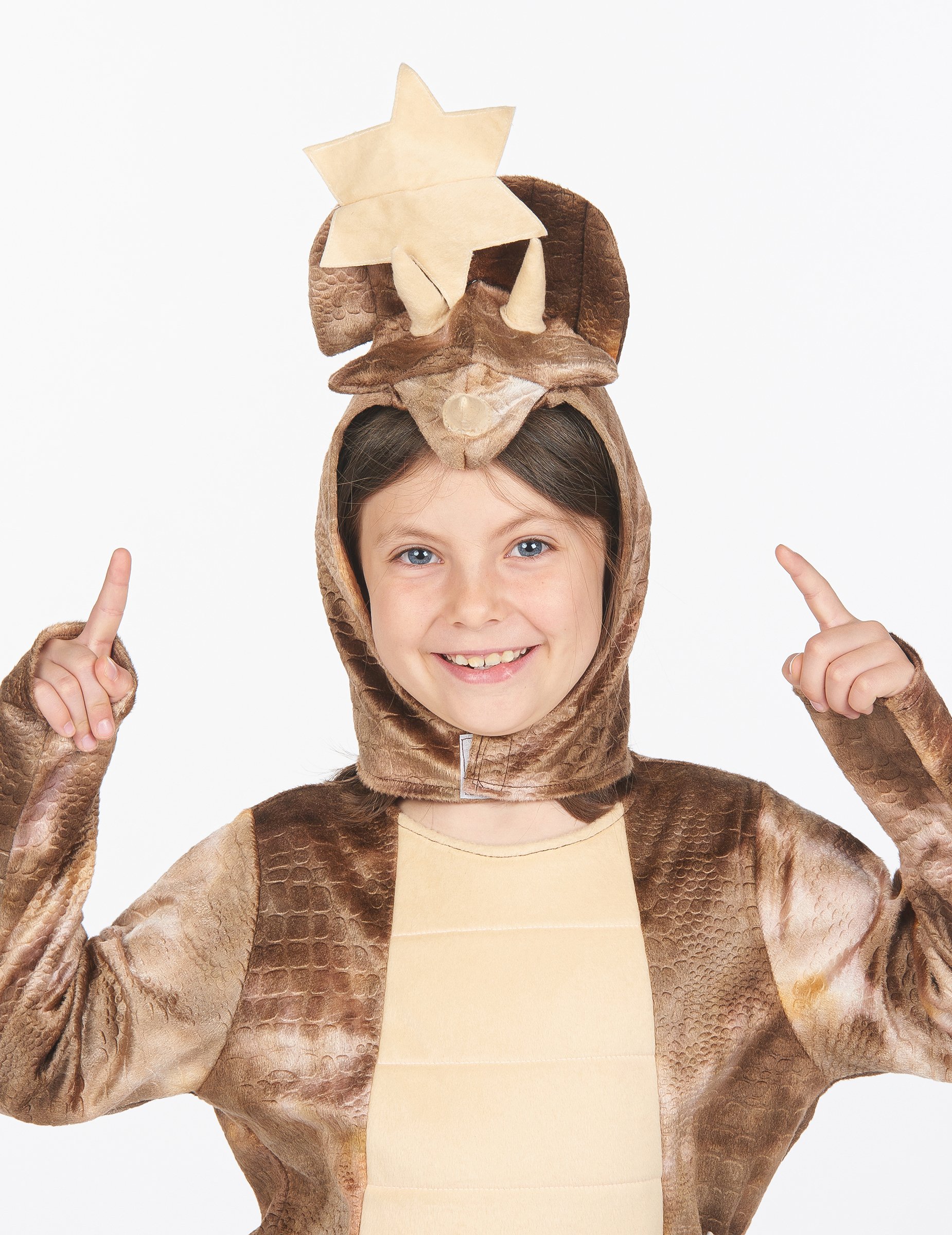 Ce déguisement dinosaure sorti de l'oeuf est pour enfant. Il comprend la combinaison, un short ainsi qu'une capuche. La combinaison du costume porte les couleurs d'un petit dinosaure soit un dégradé de vert avec du beige sur la partie centrale avant. A manches longues, cette combinaison comporte une queue de dinosaure et s'enfilera facilement à l'aide d'une fermeture éclair centrale au niveau du dos. Le short représente l'œuf de dinosaure, il s'enfilera facilement tout comme un vrai short. Pour compléter l'ensemble, une capuche dinosaure est compris dans le lot. Elle est aux même couleurs que la combinaison et est ornée de fausses dents de dinosaure. La capuche s'attachera à l'aide d'une fermeture scratch. Ce déguisement dinosaure sera parfait pour la soirée déguisée de votre enfant !