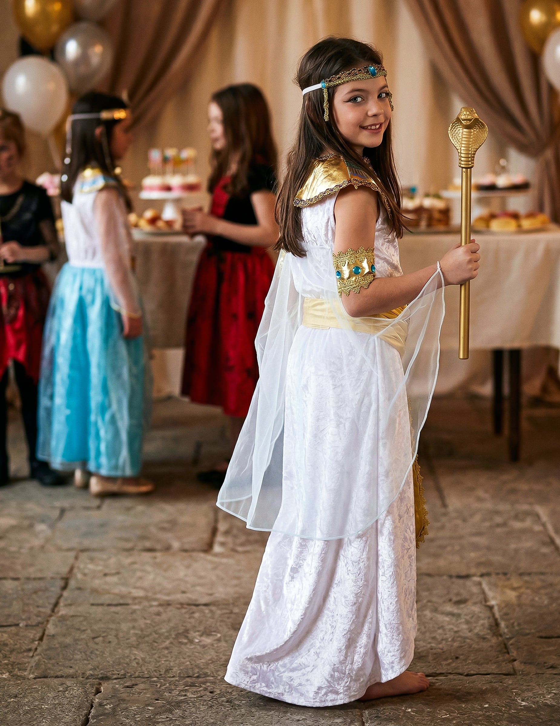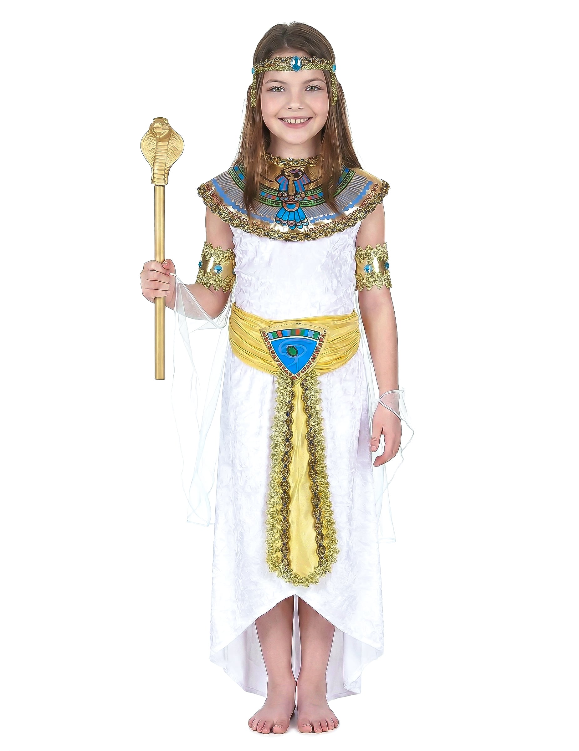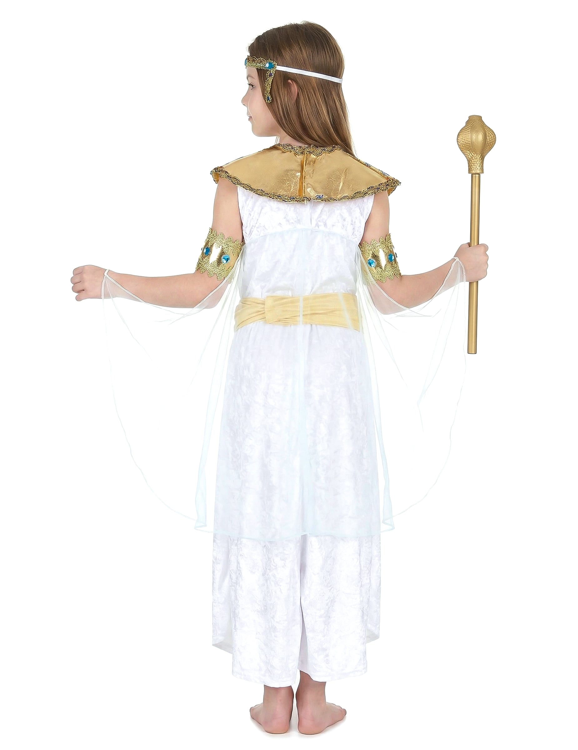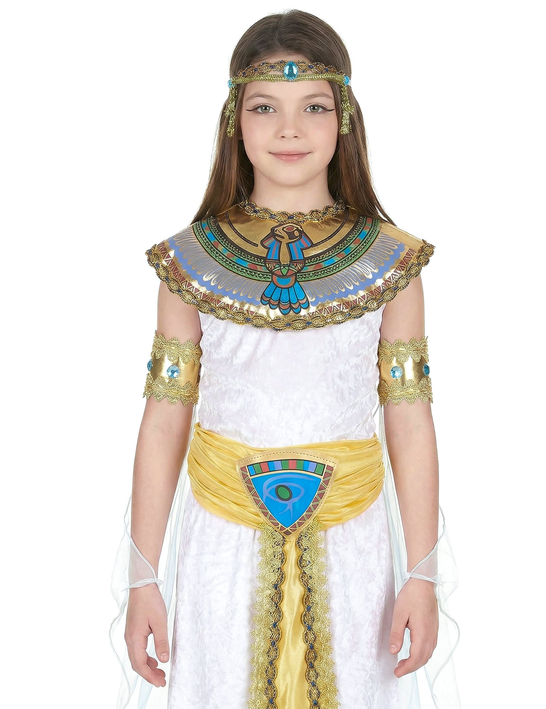 Ce déguisement d'égyptienne est pour fille et se compose d'une robe, d'une ceinture, d'une colerette, de deux manchons et d'un bandeau. La robe est blanche, au toucher velours. Plus courte devant que derrière, vous pourrez cintrer la taille grâce à la ceinture à fixations scratches. La ceinture est majoritairement jaune et décorée d'un petit plastron sur lequel est représenté l'oeil Divin. La colerette est à nouer derrière le cou. Elle est en tissu plastifié avec une représentation d'un aigle. L'accessoire recouvrira vos épaules. Les deux manchons sont à scratches et dorés. Décorés de fausses pieres précieuses, ils se placeront sur les bras de votre reine en devenir. Le bandeau accessoirisera le front de votre petit ange. Pourvu d'un élastique, il ne gènera en rien toutes les coiffures que vous ferez à votre fille. Il est également doré avec une fausse gemme bleue en son centre. Enfin des pièces de tulle bleu clair attachées à la robe créeront une traîne du plus bel effet. Elle suivra les mouvements notamment grâce aux élastiques à passer aux doigts. Ce déguisement de reine d'Egypte sera parfait pour votre enfant à l'occasion du Carnaval ou pour un goûter d'anniversaire !