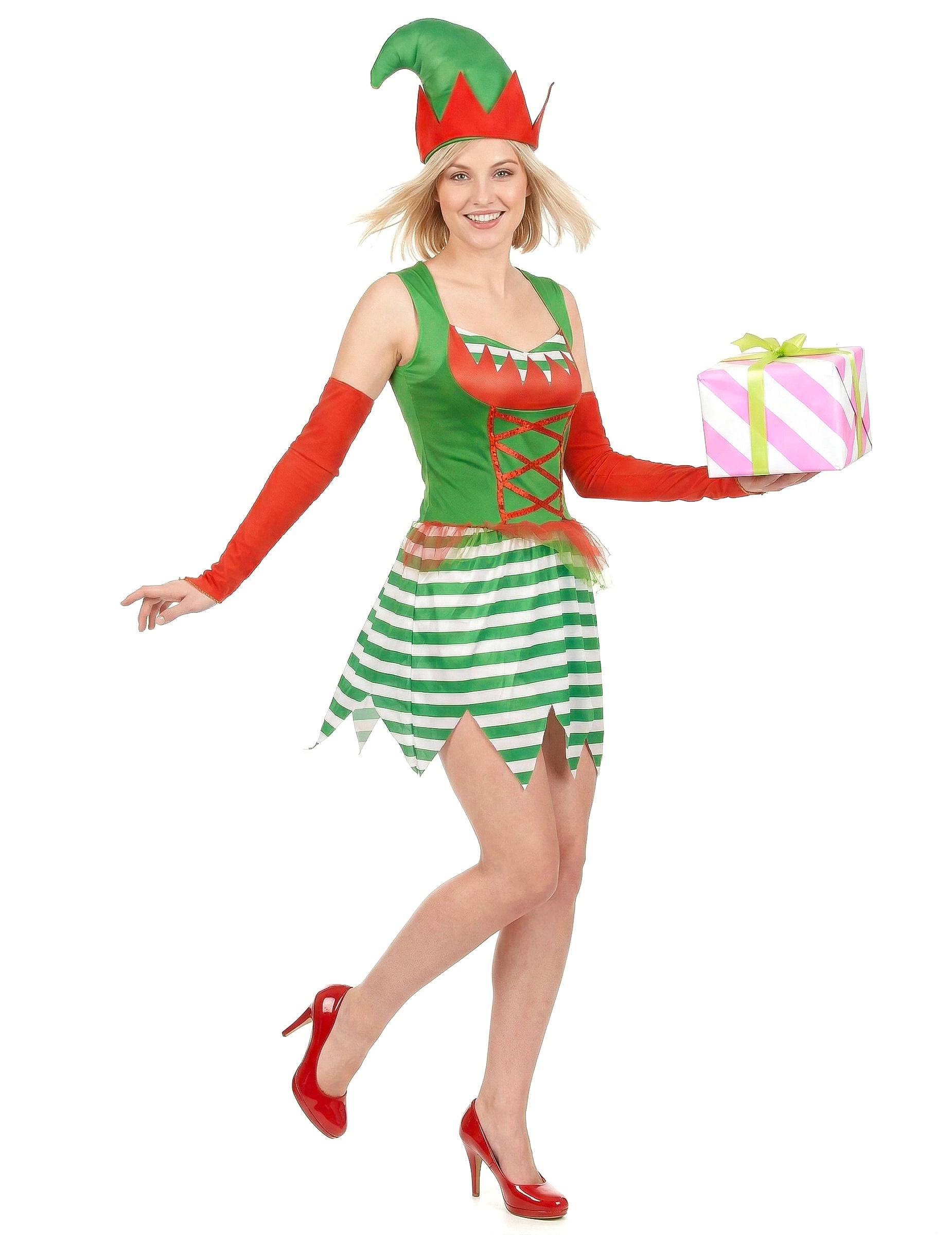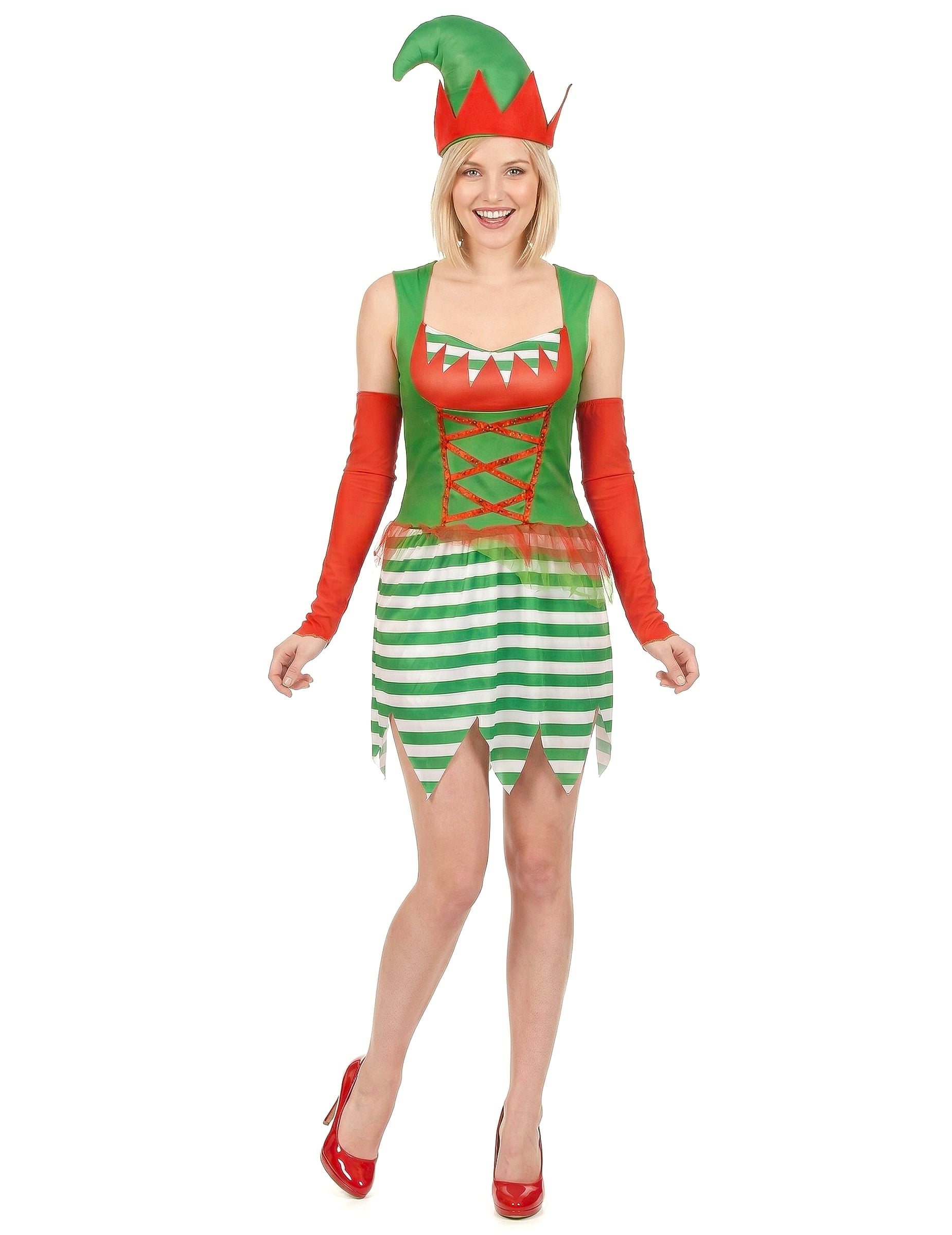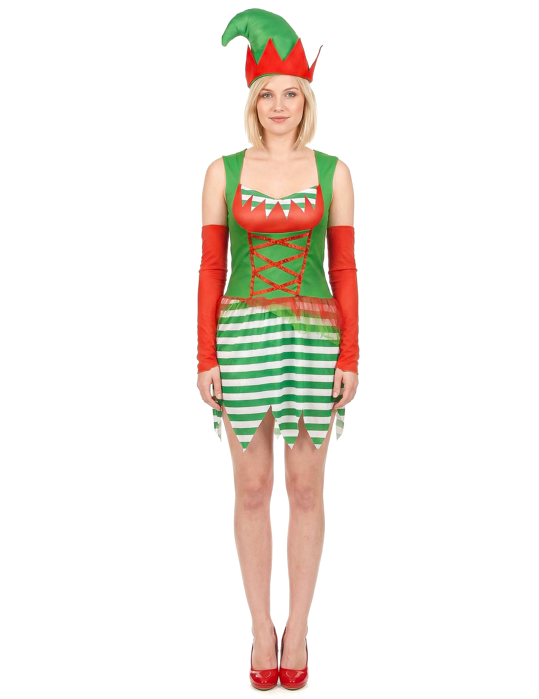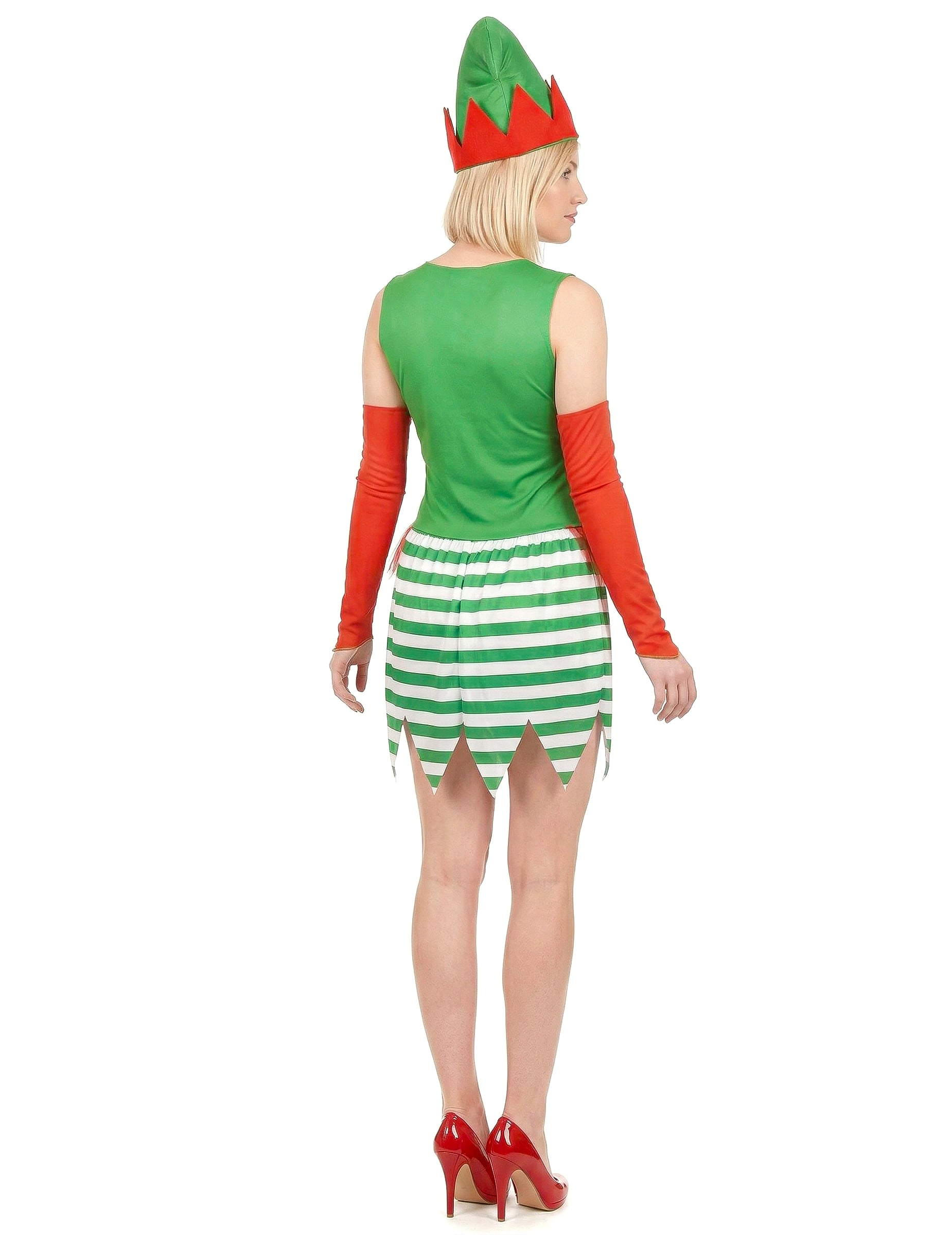 Ce déguisement pour adulte représente une elfe. Il comprend une robe, des manchons et un chapeau (collants et chaussures non inclus). La robe moulante est en polyester vert. Deux bretelles donnent un décolleté sexy souligné par des pointes de tissu rouge. Des lacets rouges sont cousus au niveau du ventre et des bouts de voile vert et rouge marquent la séparation entre le haut et le bas au niveau de la taille. Le jupon de la robe est rayé de vert et blanc. Le bas est découpé en pointes pour plus de fantaisie. Les manchons en polyester sont rouges et recouvrent la peau du poignet jusque mi-bras. Le chapeau elfique est typique, taillé en pointe verte. Une rangée de pointes couronne ce chapeau magique. Lors d'une soirée sur le thème de la nature ou de la magie transformez-vous en être magique.