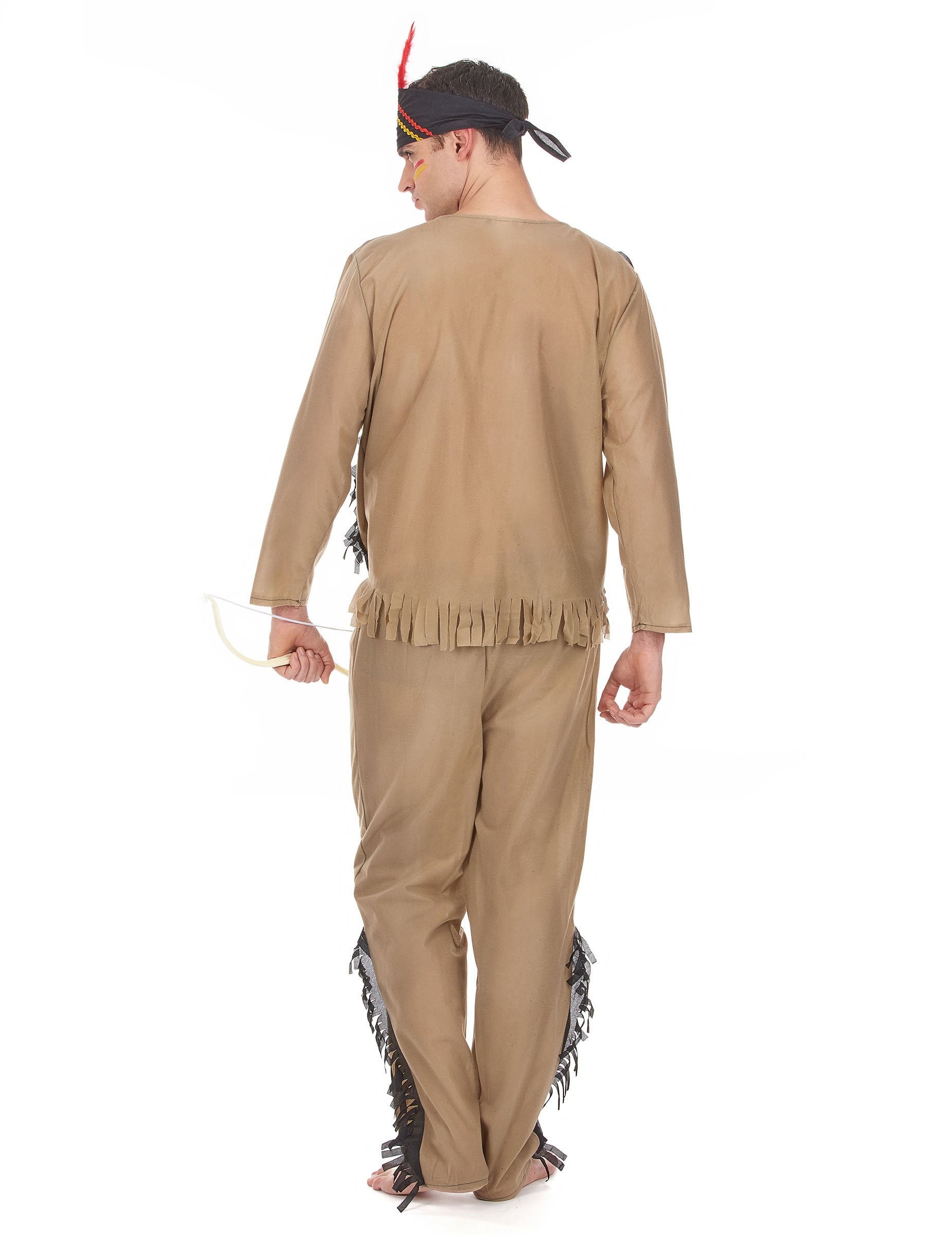 Ce déguisement d'indien pour homme se compose d'une coiffe (bandeau avec plume), d'une tunique et d'un pantalon (arme non incluse). La tunique est beige à effet velours. Des franges marrons sont présentes le long du corps et sur la poitrine ainsi que des bandes oranges et jaunes. Elle possède des manches longues et une ficelle à l'encolure pour l'ajuster. Le pantalon élastique à la taille est beige au toucher velours également. Des franges marrons sont présentes sur toute la longueur et un petit tablier reprenant les couleurs et motifs y est ajouté. La coiffe marron est ornée d'une plume rouge et de liserés rouges et jaunes tombants. Revenez à l'époque des indiens grâce à ce costume lors du carnaval ou d'un autre événement déguisé.