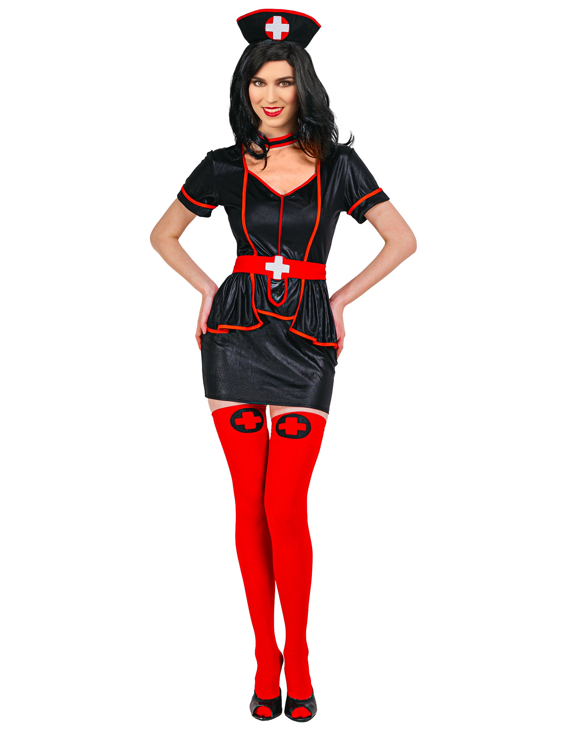 Ce déguisement infirmière noire est pour femme. Il comprend une robe, une coiffe, une ceinture ainsi qu'un ras de cou. La robe courte est noire et rouge sur l'ensemble. Parfaitement cintrer à votre silhouette, cette robe d'infirmière possède des contours rouges sont fond noir et elle se fermera facilement à l'aide d'une fermeture éclair centrale. La ceinture viendra parfaire votre silhouette, couleur rouge avec une croix blanche au centre. La coiffe d'infirmière noire possède des liserés rouges ainsi que le logo médical en forme de croix blanche. Pour terminer, le ras de cou est aux couleurs de l'ensemble, soit le rouge et le noir. Ce costume d'infirmière sera parfait pour votre soirée Halloween ou pour Carnaval !
