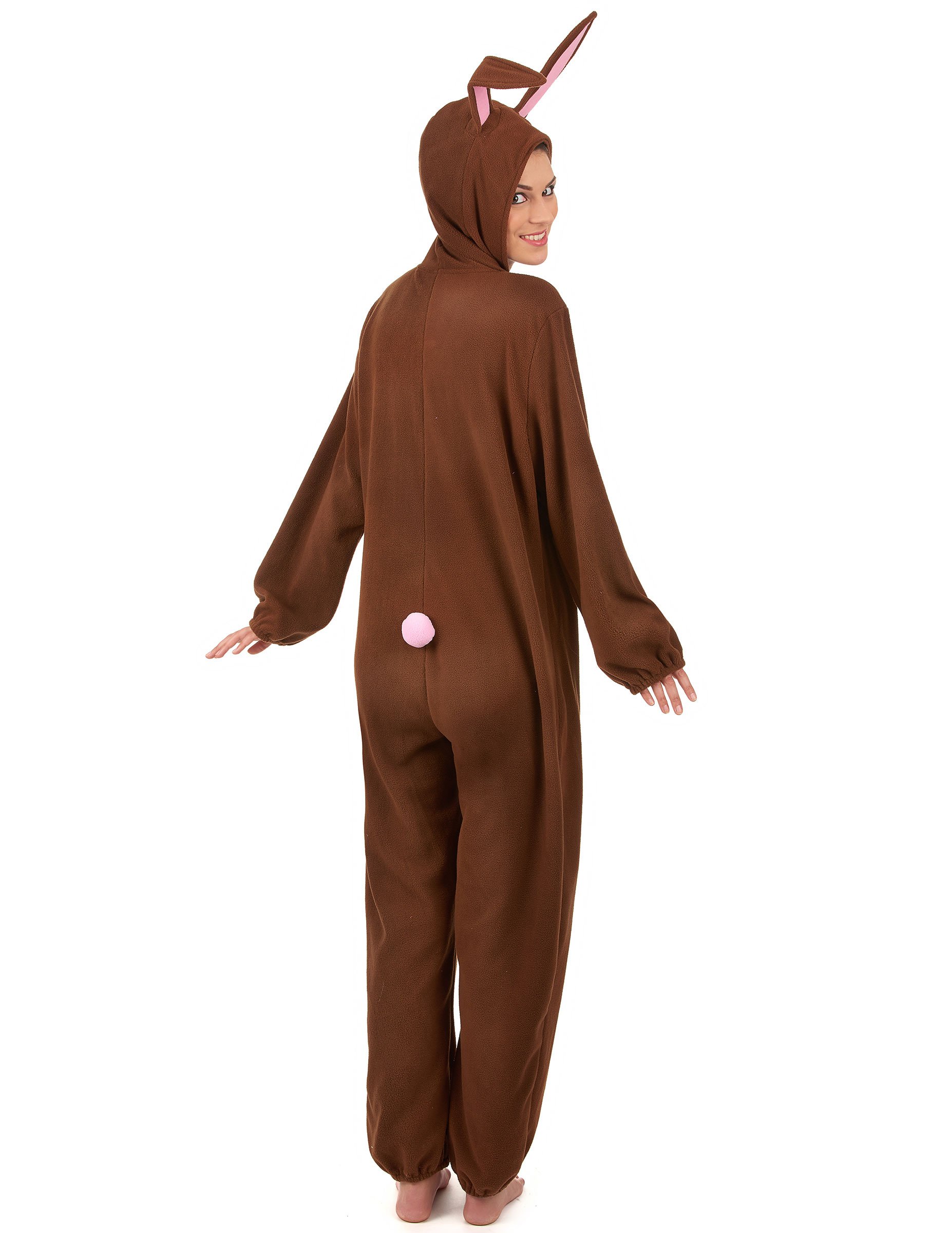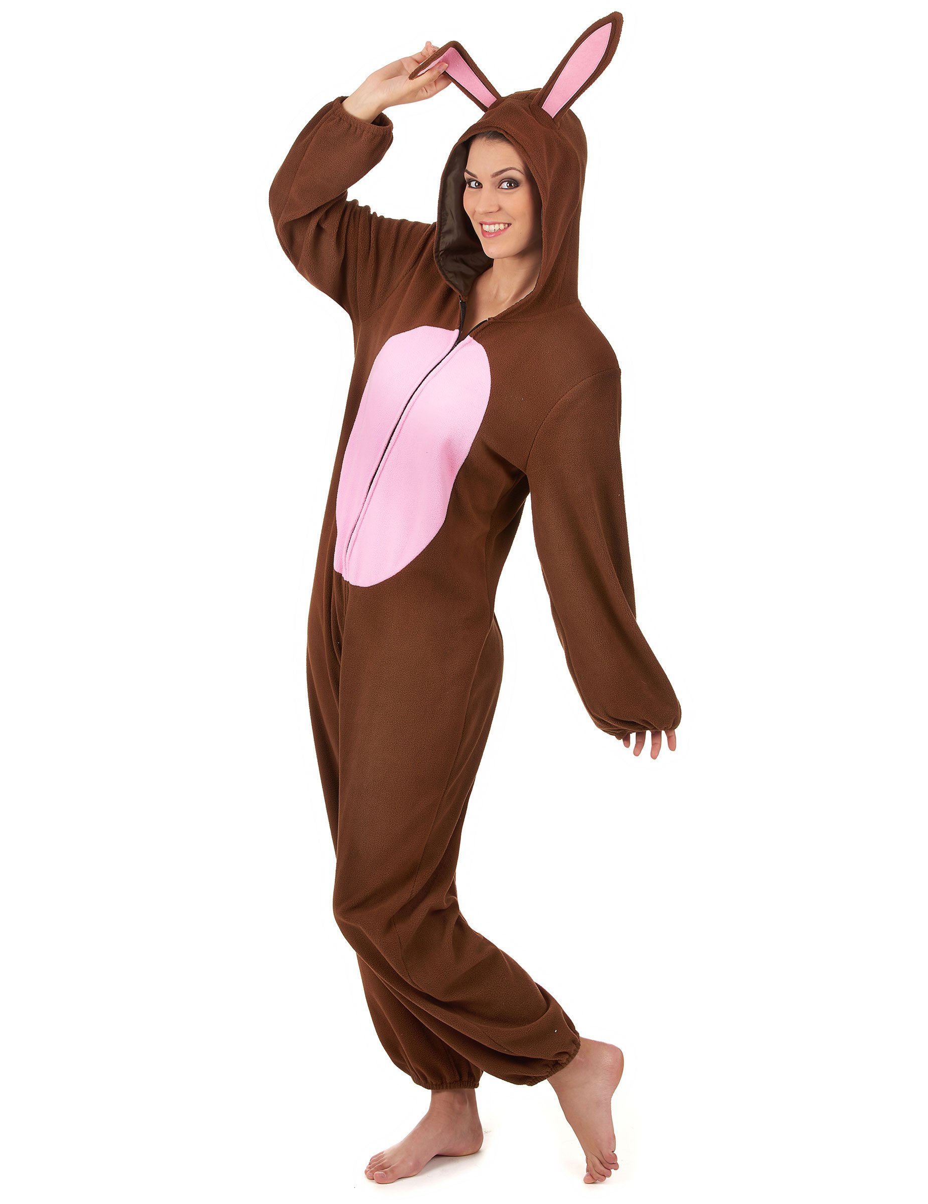 Ce déguisement de lapin pour femme est une combinaison. La combinaison marron est en matière effet polaire. Le ventre et l'intérieur des oreilles sont roses pour un effet des plus adorables ! La combinaison se ferme à l' avant avec une fermeture éclair et les oreilles possèdent une armature afin de les plier, si vous le souhaitez. Disponible en taille unique, elle mesure 155cm en longueur (sans la capuche). Optez pour ce déguiisement mignon et rigolo à l'occasion d'une fête à thème ou pour le carnaval.