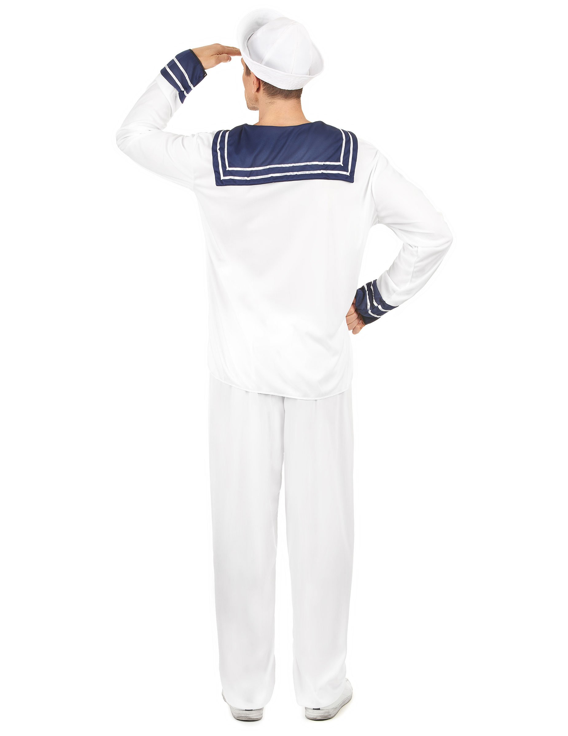 Ce déguisement de marin pour homme se compose d'un haut, d'un pantalon et d'un chapeau. Le haut est blanc à manches longues avec le bas des manches, le col et le noeud bleu marine avec des traits blancs. Le pantalon est blanc, la taille est élastique. Le chapeau est blanc avec une encre bleue imprimée sur le devant. Ce costume sera parfait pour partir en mer à l'occasion du carnaval ou pour une fête déguisée.