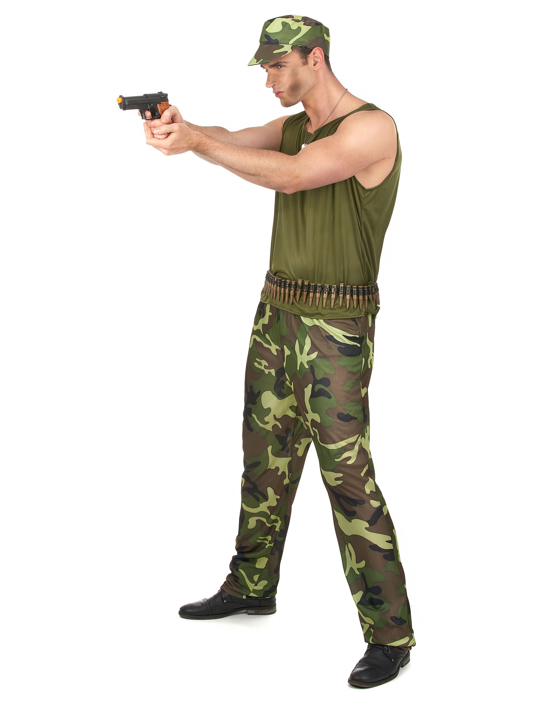 Ce déguisement de militaire pour homme se compose d'un haut, d'un pantalon, et d'une casquette (collier, arme et ceinture non inclus). Le haut est un débardeur vert kaki. Le pantalon, dans les tons de vert, possède un imprimé camouflage. Enfin, une casquette assortie au pantalon vient compléter ce costume. Ce déguisement de militaire sera parfait pour incarner un vaillant soldat à l'occasion du Carnaval.