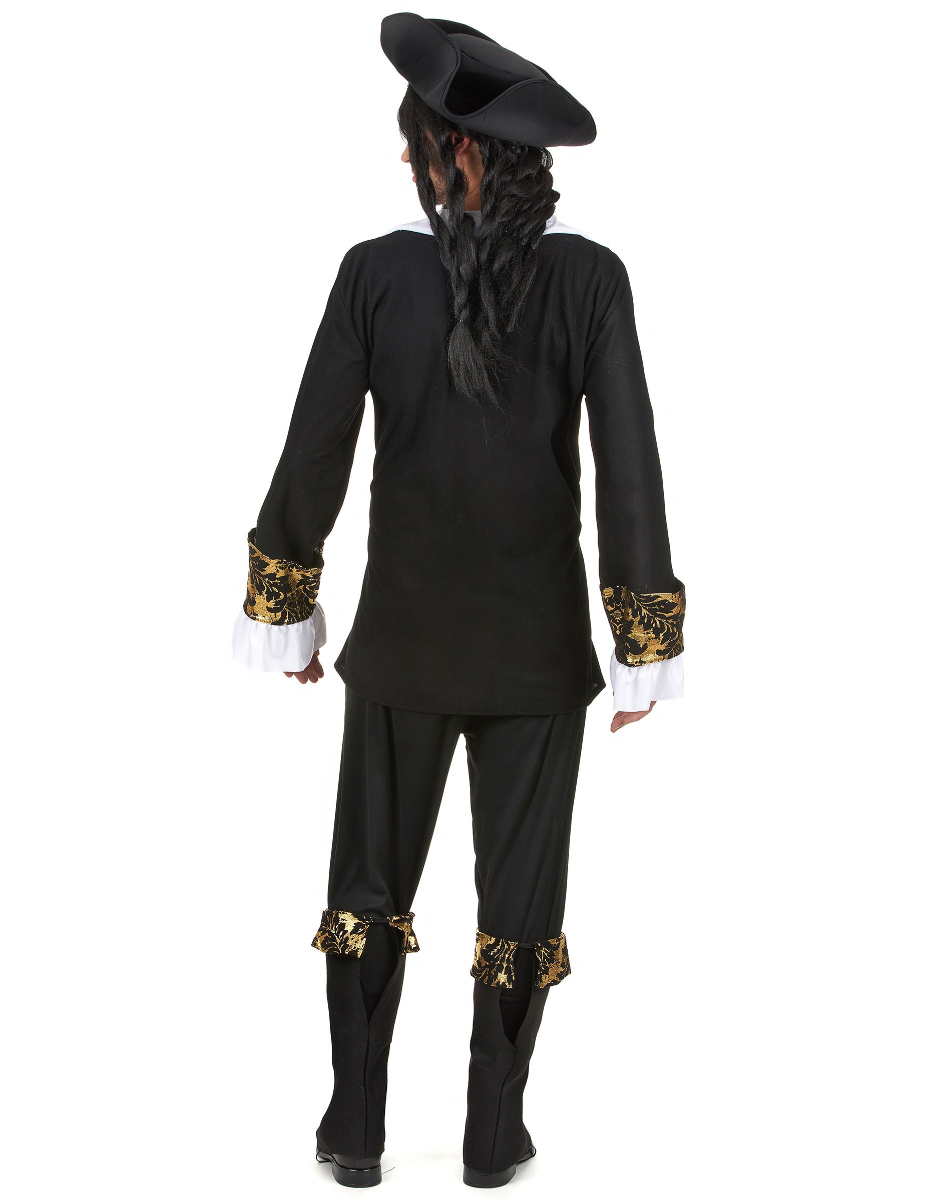 Ce déguisement de pirate pour homme comprend un haut, un pantalon, des sur-bottes et un tricorne. Le haut est composé d'une fausse chemise blanche à manches longues sur laquelle est directement cousue un gilet noir en feutrine épaisse à motifs dorés. Le col est largement ouvert. Le pantalon est noir en tissu fin. Il est à taille élastique et sera très facile à enfiler. Les sur-bottes sont en feutrine épaisse et se passeront très aisément par dessus vos chaussures. Leur maintien sera assuré par des élastiques cousus sous les sur-bottes. Le revers présent sur ses dernières est en rappel des motif du gilet. Enfin, le tricorne est en mousse souple. Entièrement noir, il conviendra pour des tours de tête proches des 58 cm environ. Ce costume très classe de capitaine pirate sera idéal pour le Carnaval ou un spectacle !