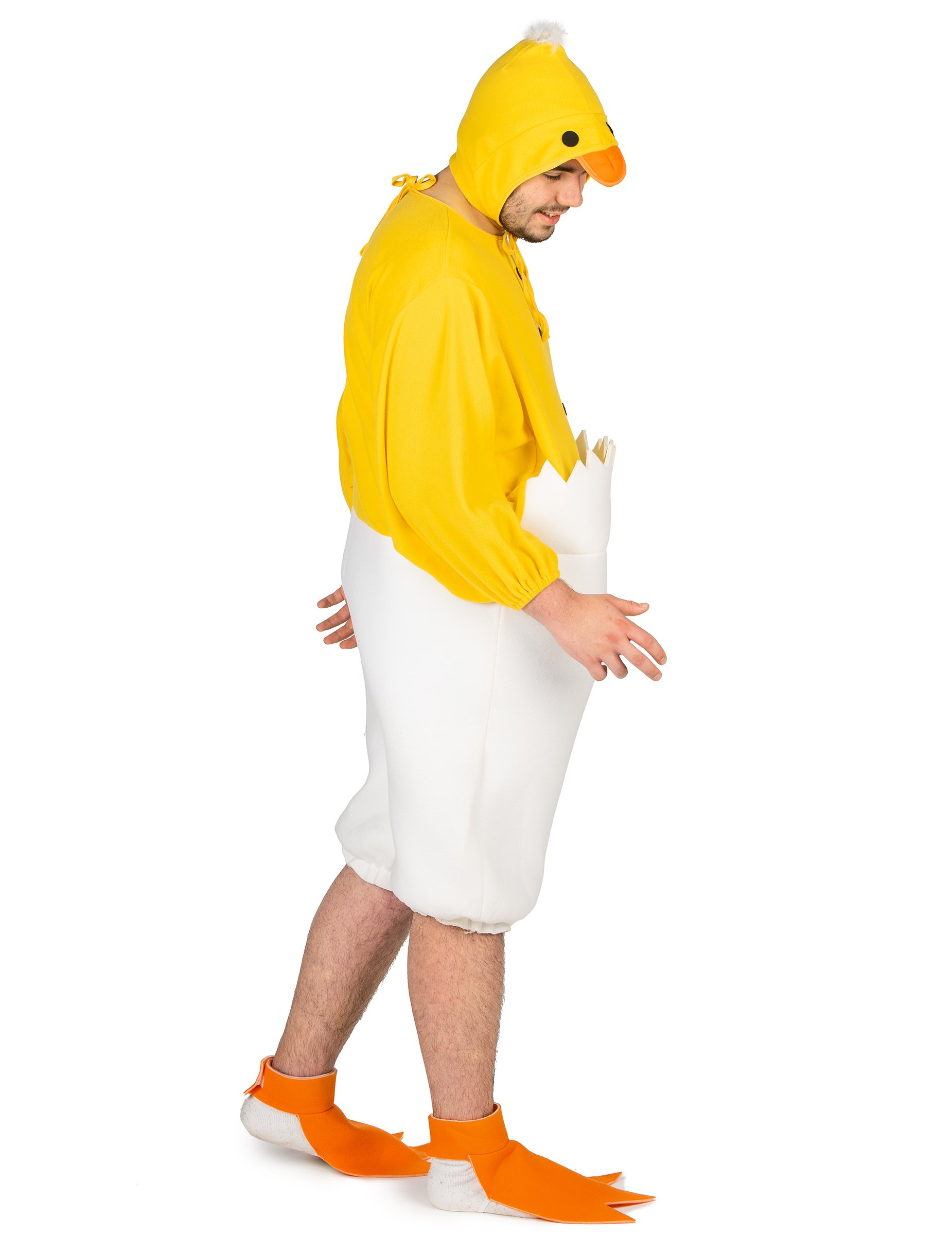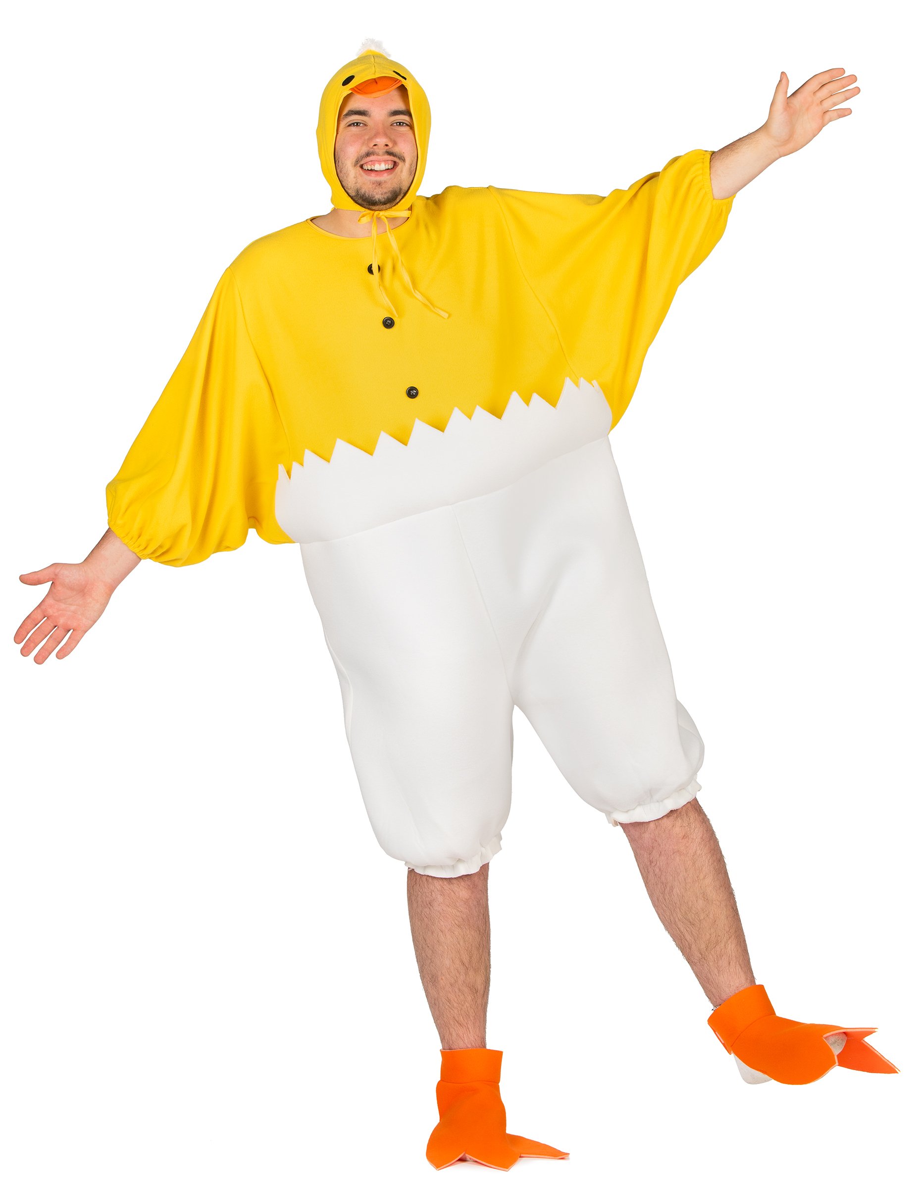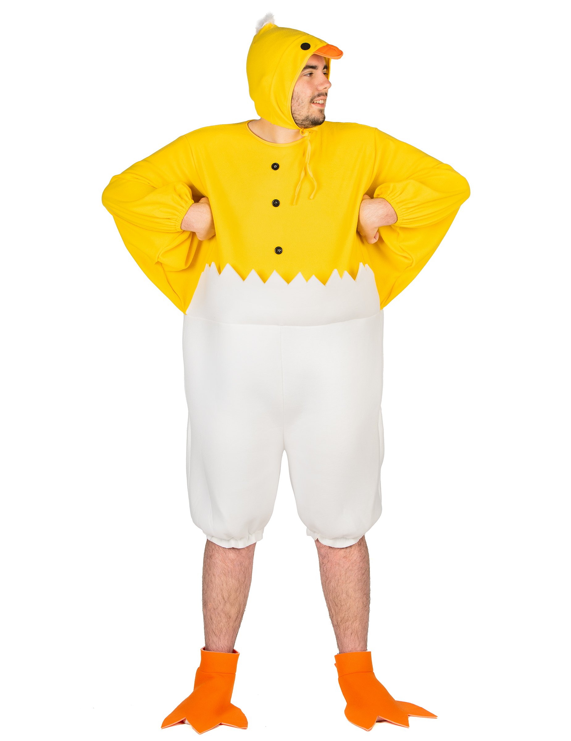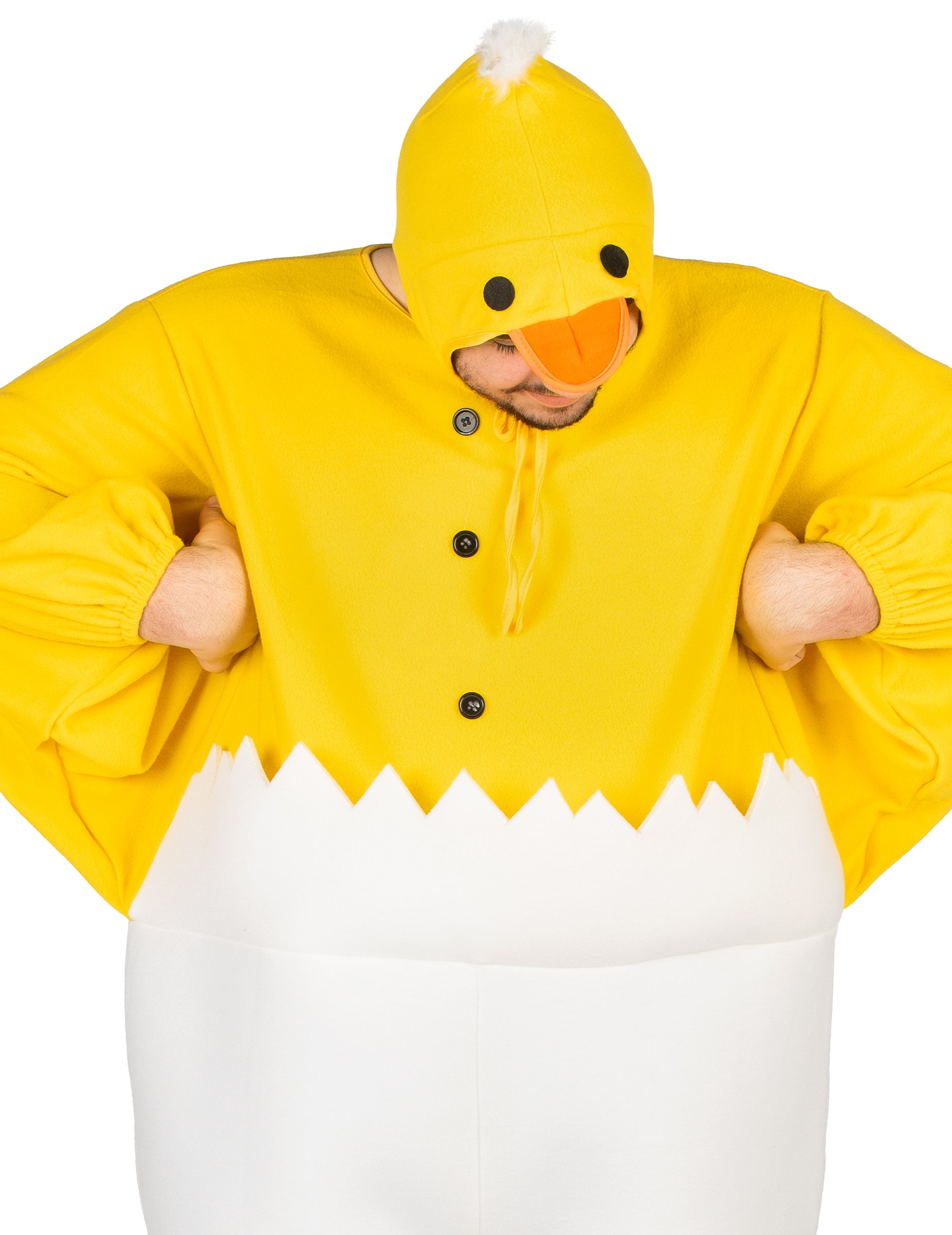 Ce déguisement de poussin pour adulte se compose d'une combinaison, d'une coiffe et d'une paire de sur-chaussures. La combinaison jaune et blanc devient plus épaisse à partir de la taille pour créer cette illusion de sortir d'un oeuf. Les manches longues sont très amples. Elle se ferme en haut du dos à l'aide d'un lien à nouer. La coiffe laisse deviner la tête d'un poussin, la crête est en plumes synthétique et les sur-chaussures oranges en forme de pattes de poussin se ferment grâce à des scratchs. Ce costume de poussin très drôle et original est idéal pour une soirée déguisée sur le thème des animaux ainsi que pour le Carnaval.