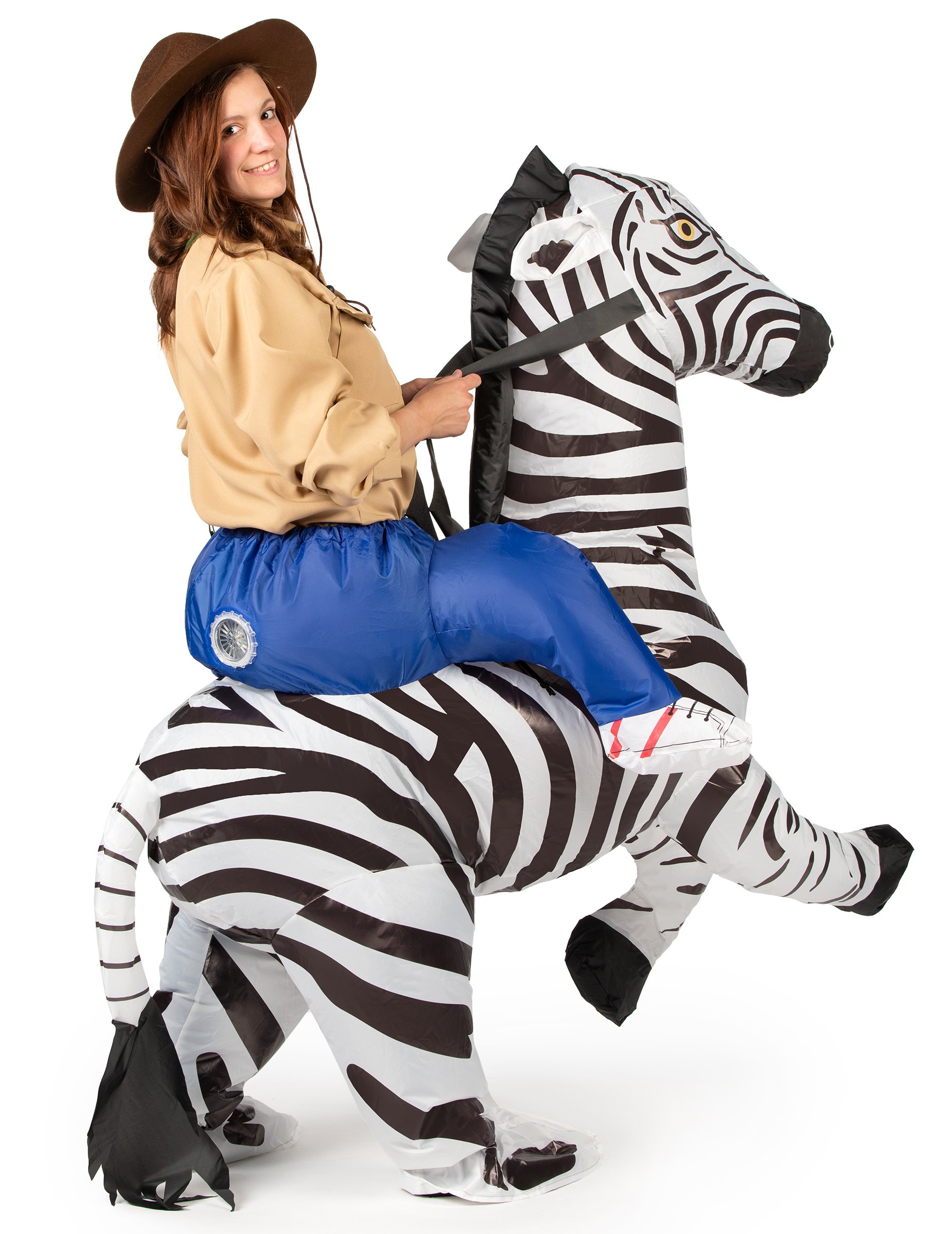 Ce déguisement d'homme à dos de zèbre est pour adulte. Cette combinaison s'enfile à la manière d'un pantalon avec un cordon à la taille qui se resserre pour s'adapter à votre morphologie. Ce zèbre est gonflable et semble porter l'homme sur son dos. Deux rubans noirs vous permettent de tenir la tête du zèbre et de partir à l'aventure dans la savane sauvage, tel un cowboy sur son cheval ! Avec ce déguisement original transformez-vous en explorateur de la savane et partez en safari sur le dos de votre monture lors de soirées costumées, de courses déguisées ou pour le carnaval! Ce déguisement se gonfle à l'aide d'un ventilateur et d'un boîtier. Le ventilateur présent à l'arrière est à brancher au boîtier à piles (4 piles AA non incluses). Pour gonfler le déguisement il faut simplement appuyer sur le bouton ON/OFF.