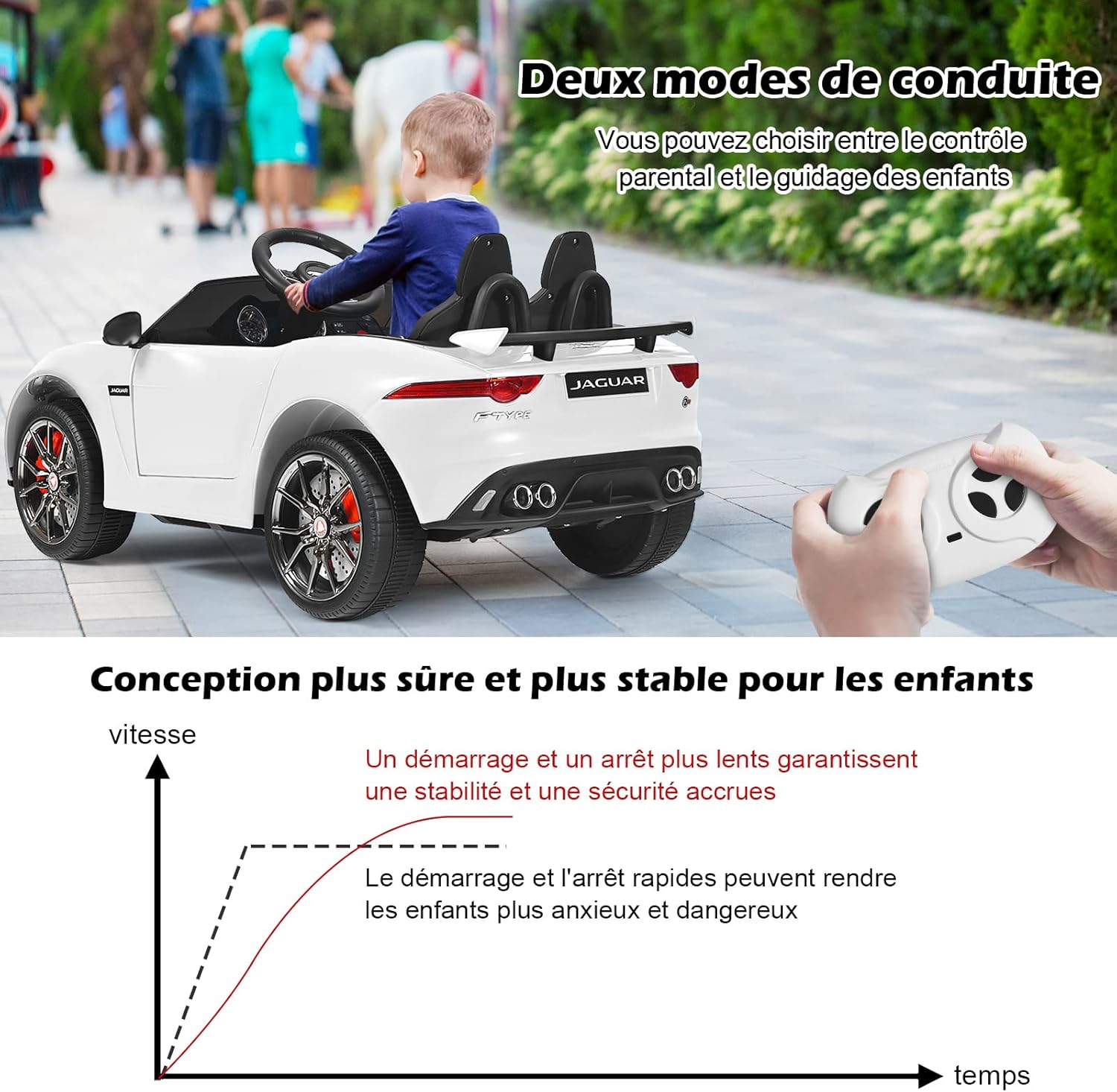 - Voiture électrique avec télécommande 2,4G : Cette voiture Jaguar à l'allure cool est un excellent jeu de conduite pour vos enfants et est télécommandée par les parents (à 3 vitesses). Cette voiture électrique peut être contrôler par vos chouchous à 2 vitesses. en avant et en arrière, tourner et aller à haute ou basse vitesse. Assurer la sécurité de votre enfant.