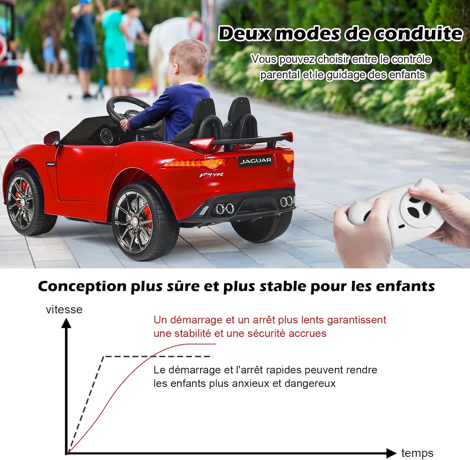 - Voiture électrique avec télécommande 2,4G : Cette voiture Jaguar à l'allure cool est un excellent jeu de conduite pour vos enfants et est télécommandée par les parents (à 3 vitesses). Cette voiture électrique peut être contrôler par vos chouchous à 2 vitesses. en avant et en arrière, tourner et aller à haute ou basse vitesse. Assurer la sécurité de votre enfant.