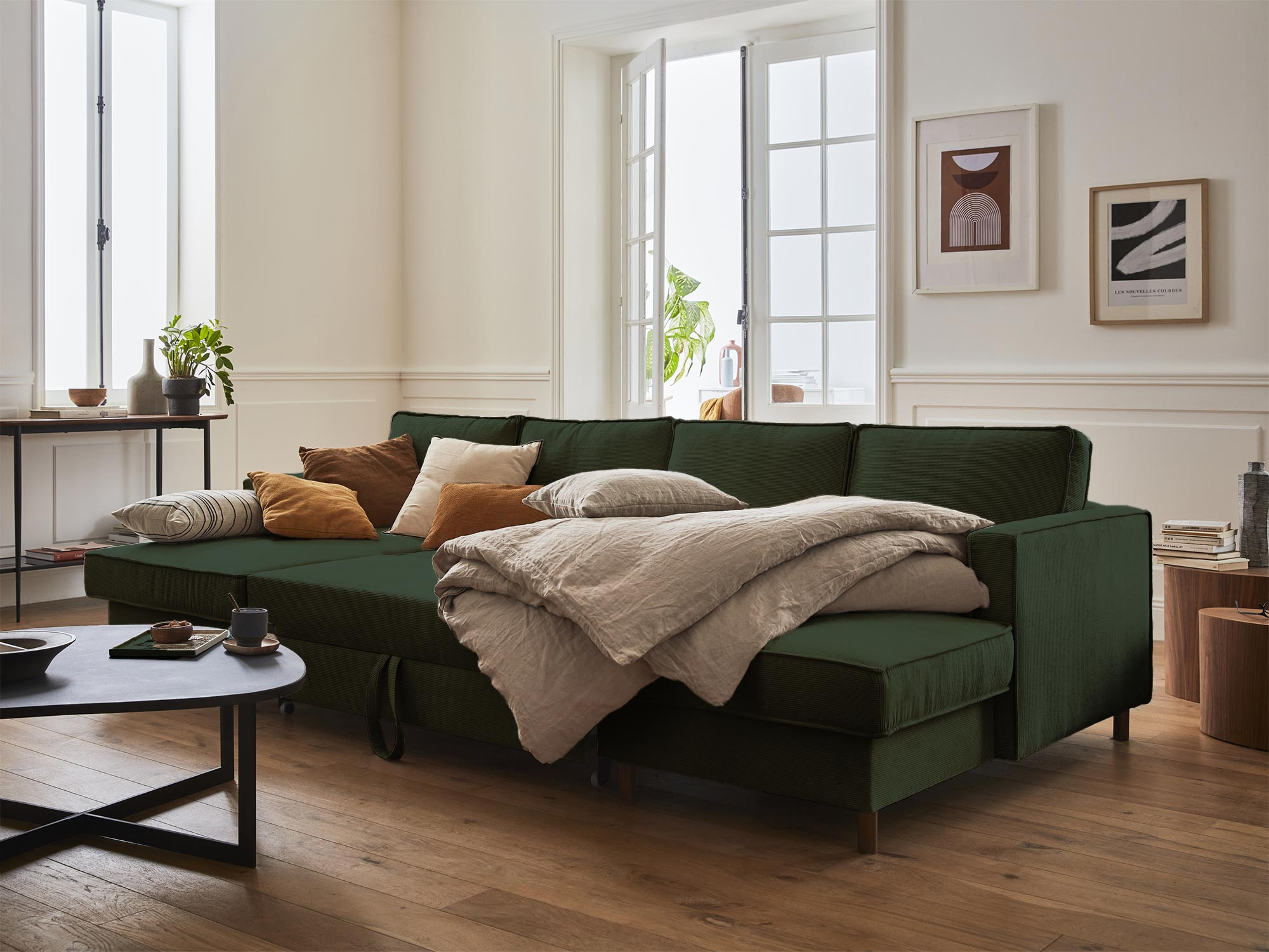 La fonction convertible du canapé Jake ne vous laissera pas indifférent. Pour la déployer, il vous suffit de tirer sur la poignée située sous l’assise principale du canapé. Le canapé panoramique Jake est également équipé d’un coffre de rangement sous sa méridienne, idéal pour y loger plaids, coussins, livres, etc. Ce canapé a donc tout pour vous plaire !