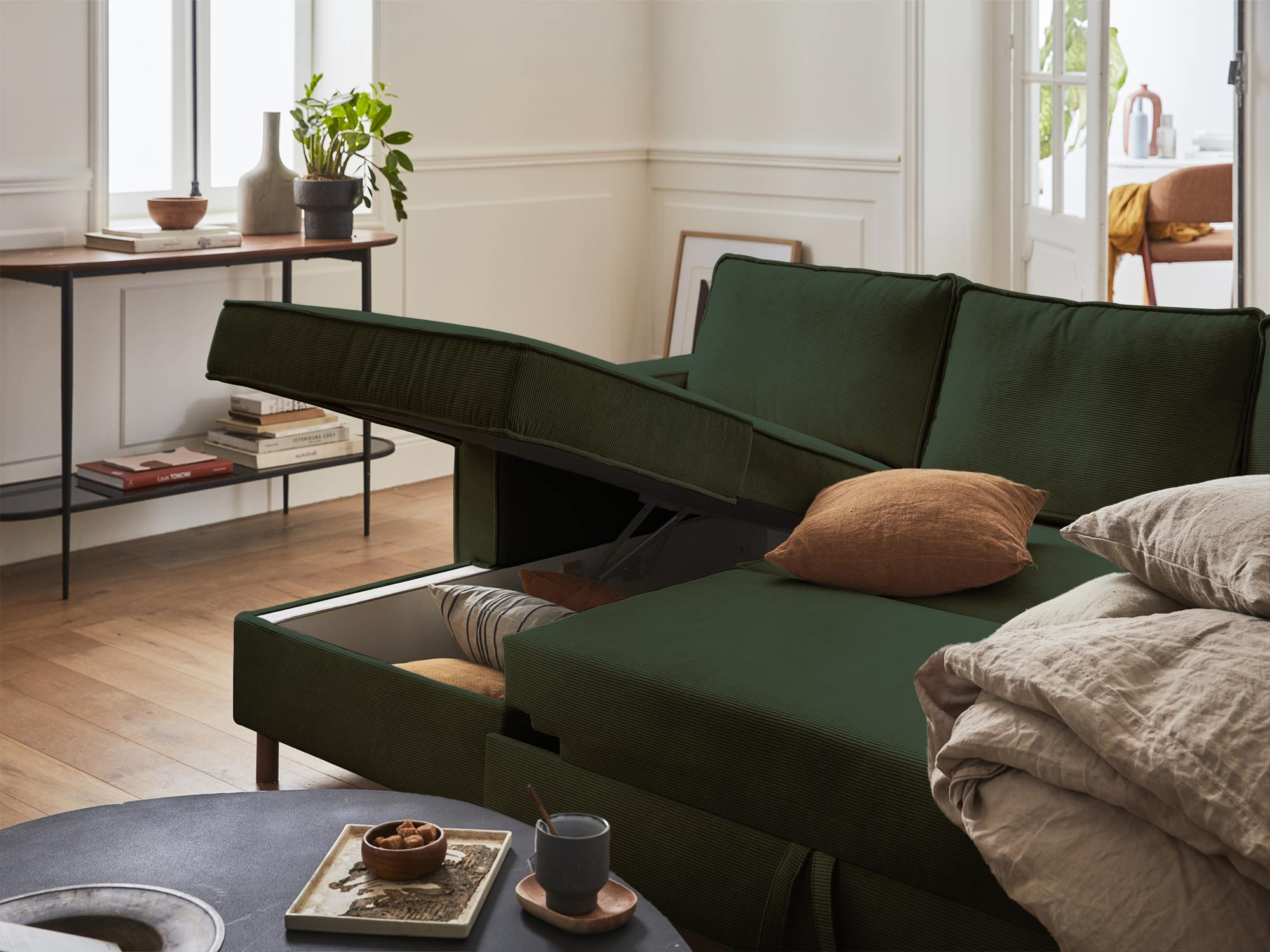 Jake - canapé panoramique en U - 7 places - convertible avec coffre - en velours côtelé