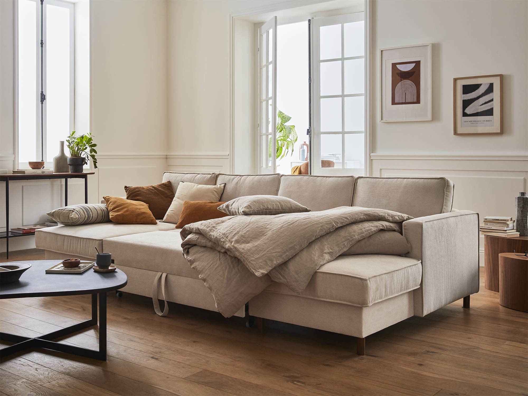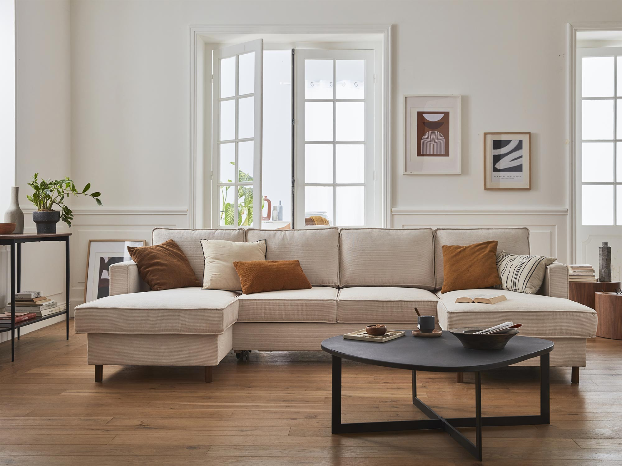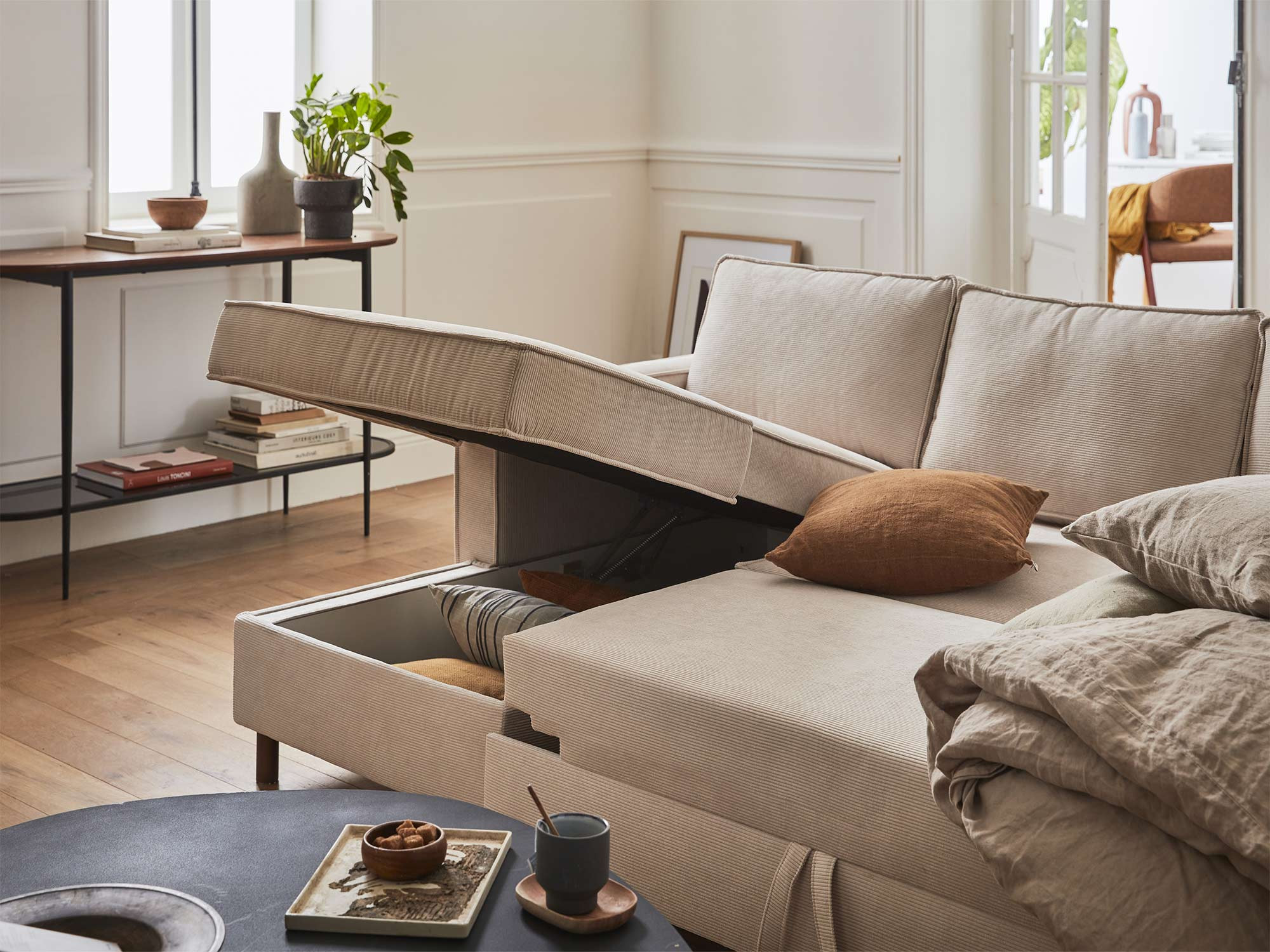 La fonction convertible du canapé Jake ne vous laissera pas indifférent. Pour la déployer, il vous suffit de tirer sur la poignée située sous l’assise principale du canapé. Le canapé panoramique Jake est également équipé d’un coffre de rangement sous sa méridienne, idéal pour y loger plaids, coussins, livres, etc. Ce canapé a donc tout pour vous plaire !