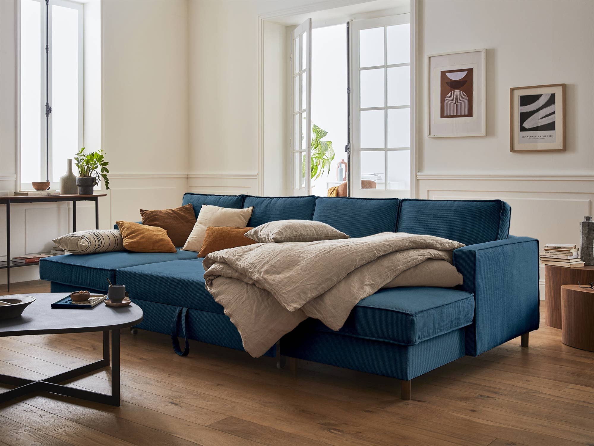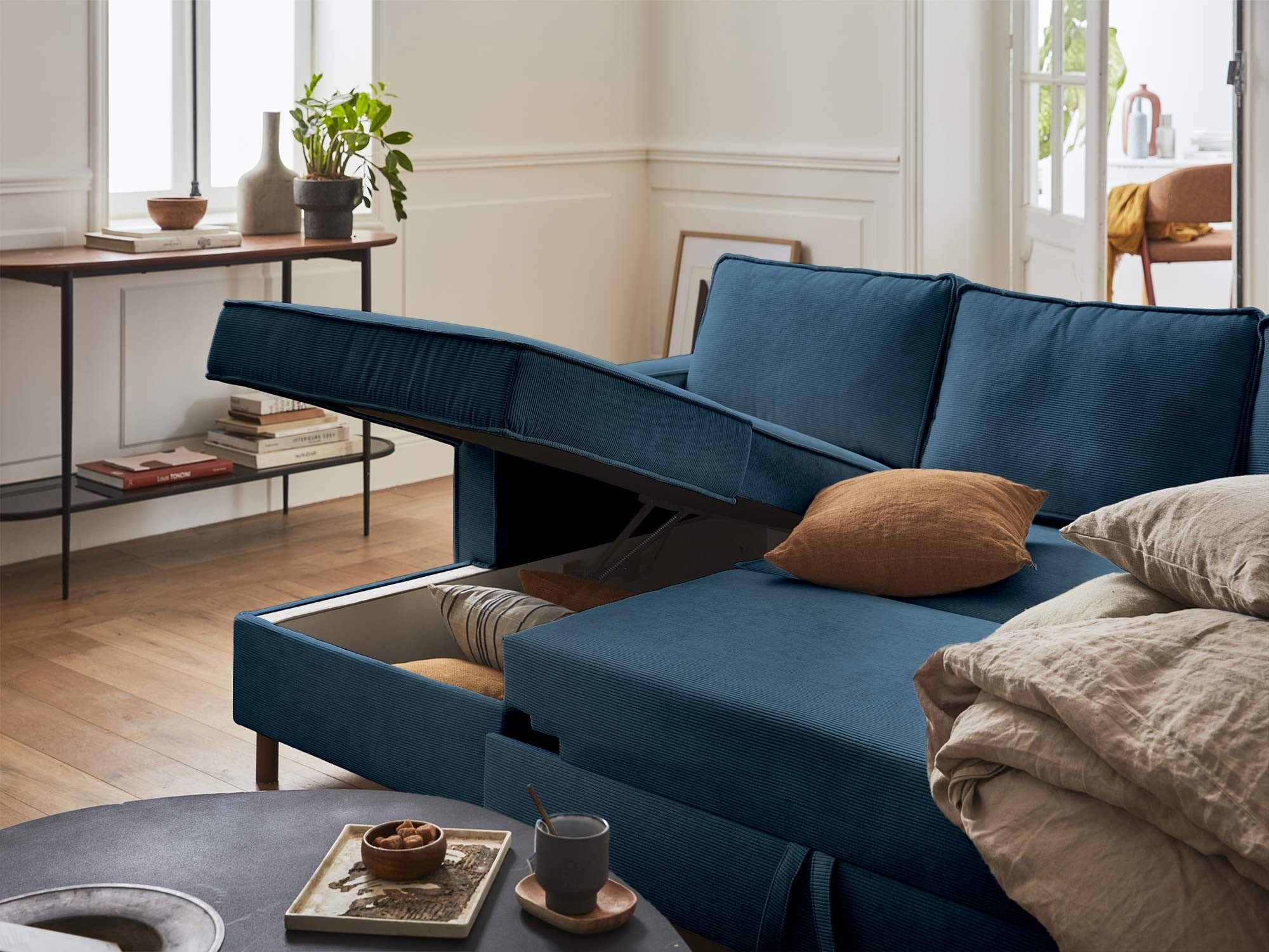 La fonction convertible du canapé Jake ne vous laissera pas indifférent. Pour la déployer, il vous suffit de tirer sur la poignée située sous l’assise principale du canapé. Le canapé panoramique Jake est également équipé d’un coffre de rangement sous sa méridienne, idéal pour y loger plaids, coussins, livres, etc. Ce canapé a donc tout pour vous plaire !