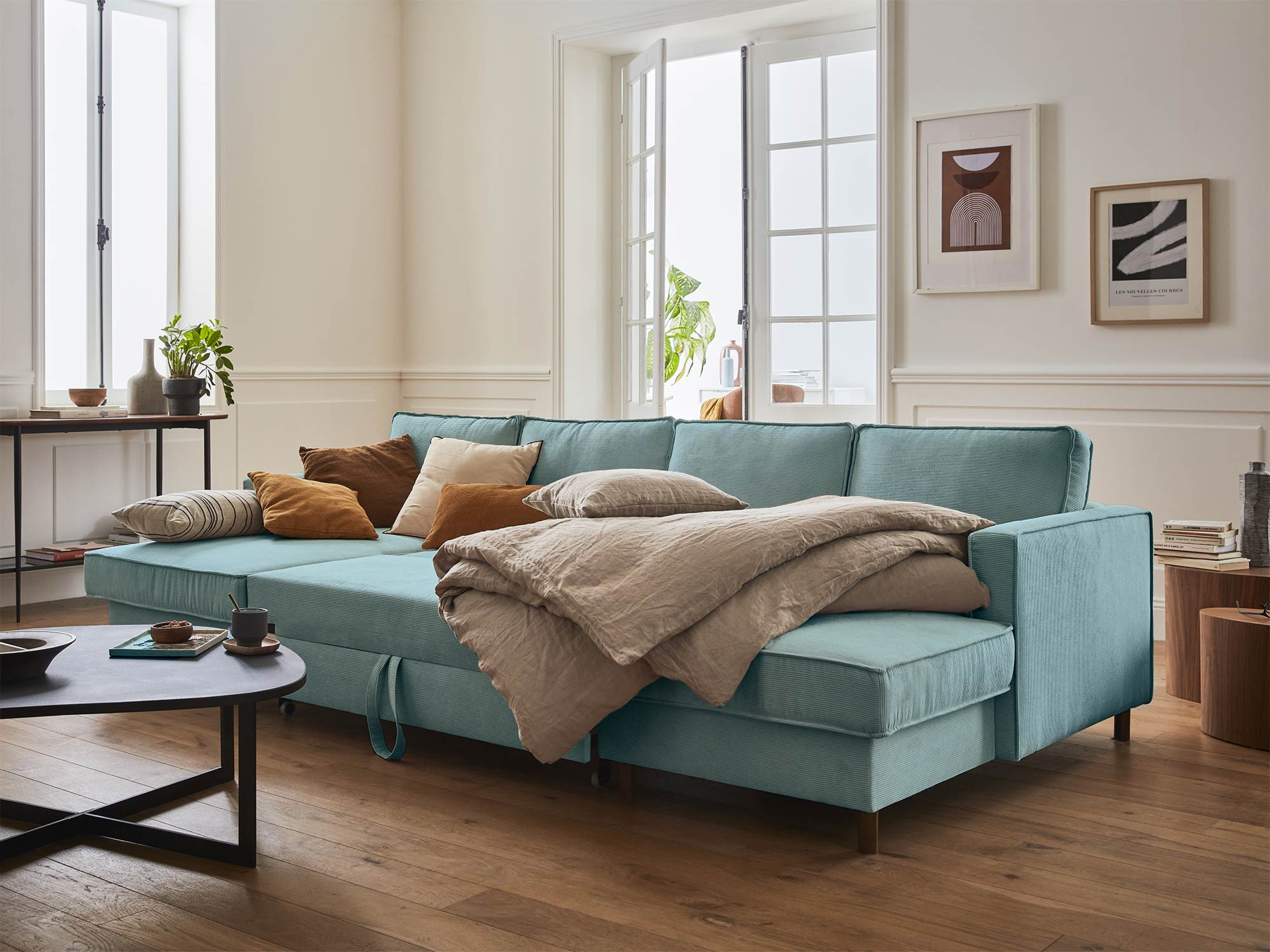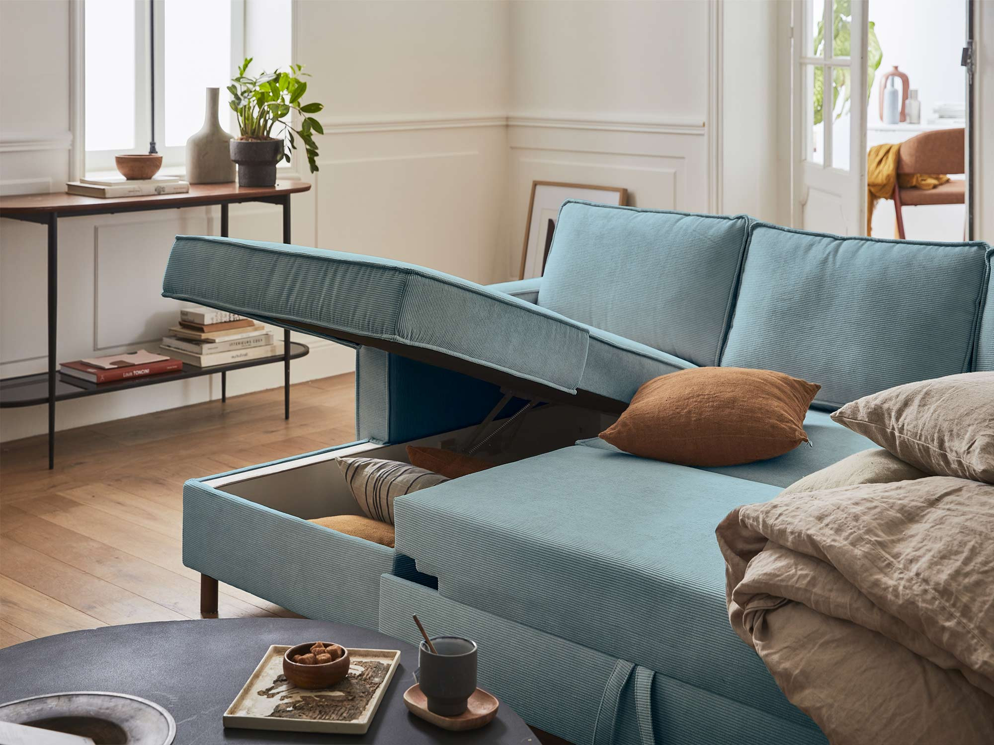 La fonction convertible du canapé Jake ne vous laissera pas indifférent. Pour la déployer, il vous suffit de tirer sur la poignée située sous l’assise principale du canapé. Le canapé panoramique Jake est également équipé d’un coffre de rangement sous sa méridienne, idéal pour y loger plaids, coussins, livres, etc. Ce canapé a donc tout pour vous plaire !