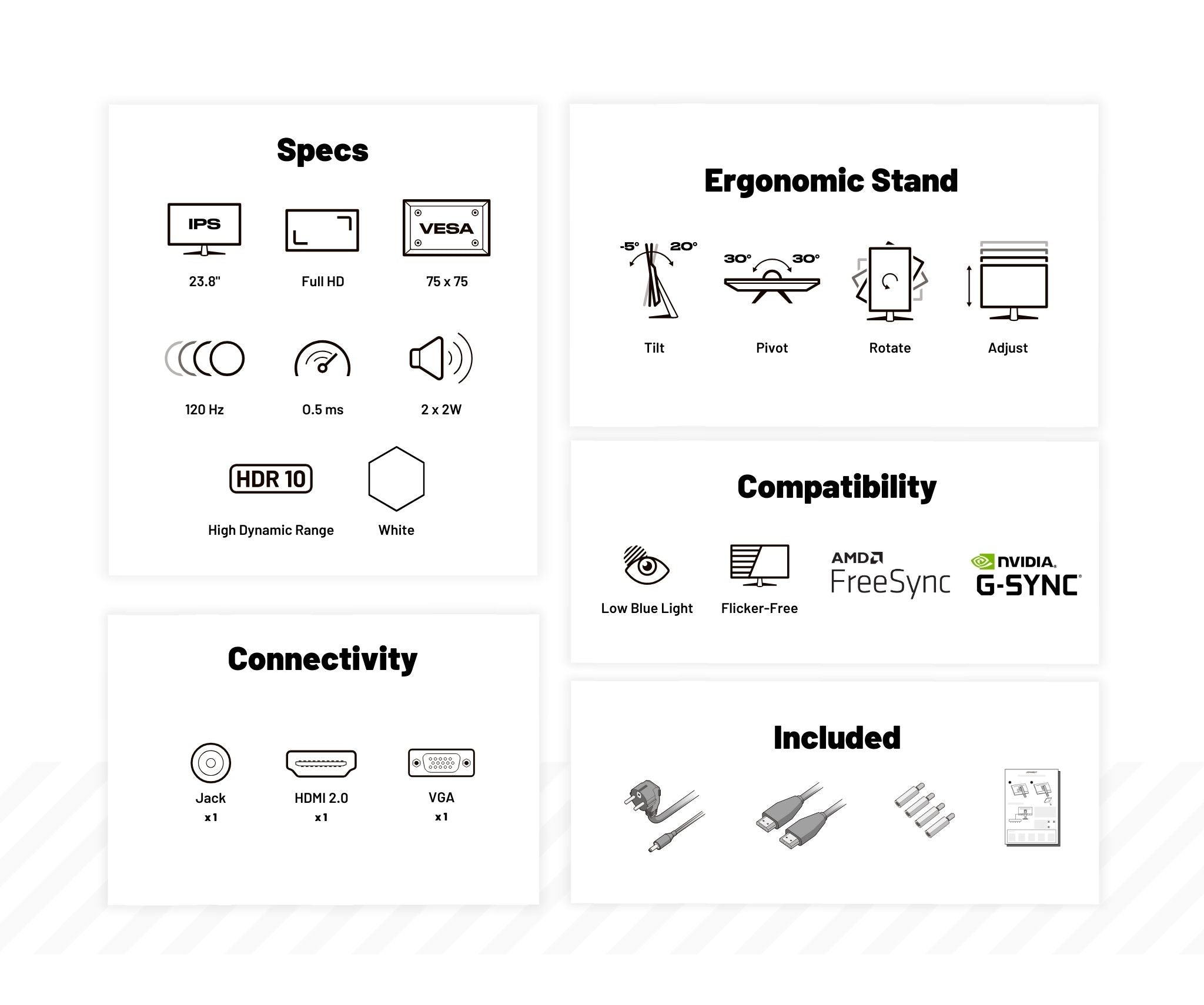 | Libellé | JAPANNEXT Ecran PC Gamer 23.8" IPS Full HD (1920x1080) 120Hz 0.5ms Blanc | JN-IPS238G120F-HSP-W |
