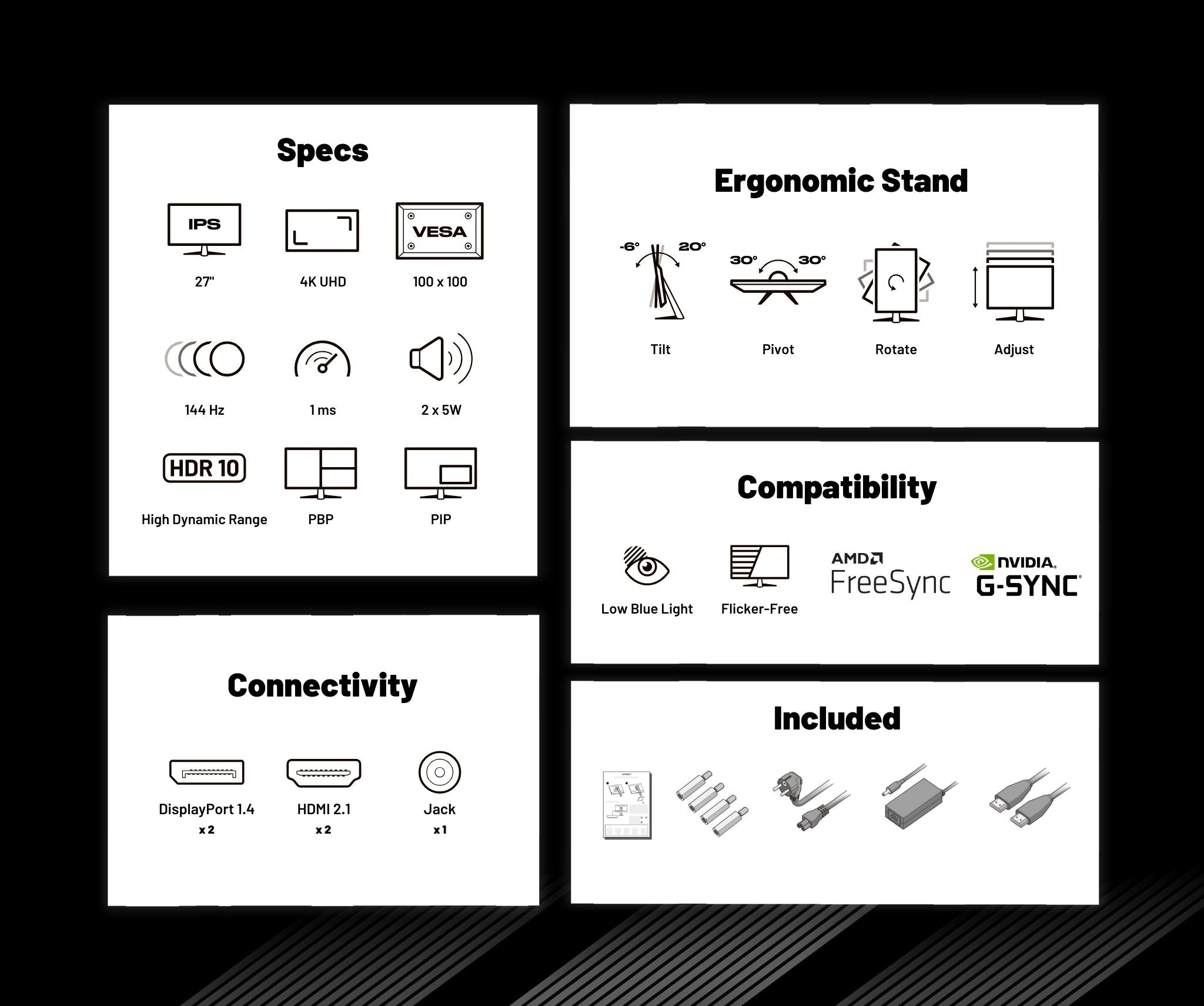 • Écran PC Gamer 27" 4K UHD : Dalle IPS ultra-précise avec 144Hz, 1ms, HDR, réglage ergonomique (HSP), haut-parleurs, Flicker-Free, G-Sync/FreeSync. Garantie 2 ans.