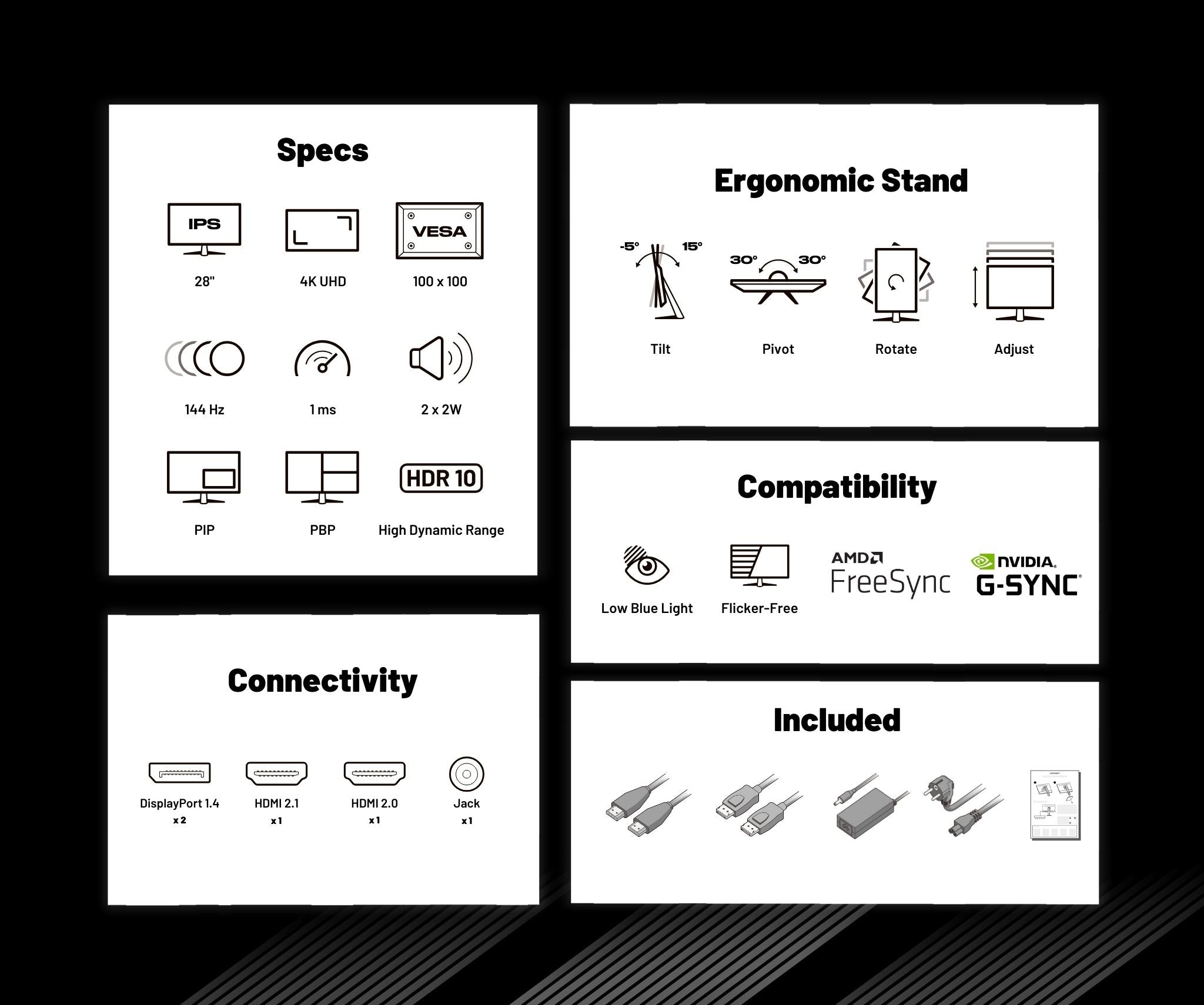 • Écran PC Gamer 28" 4K UHD : Dalle IPS ultra-haute définition avec 144Hz, 1ms et HDR. Réglages ergonomiques (HSP), haut-parleurs intégrés, Flicker-Free, G-Sync/FreeSync. Garantie 2 ans.