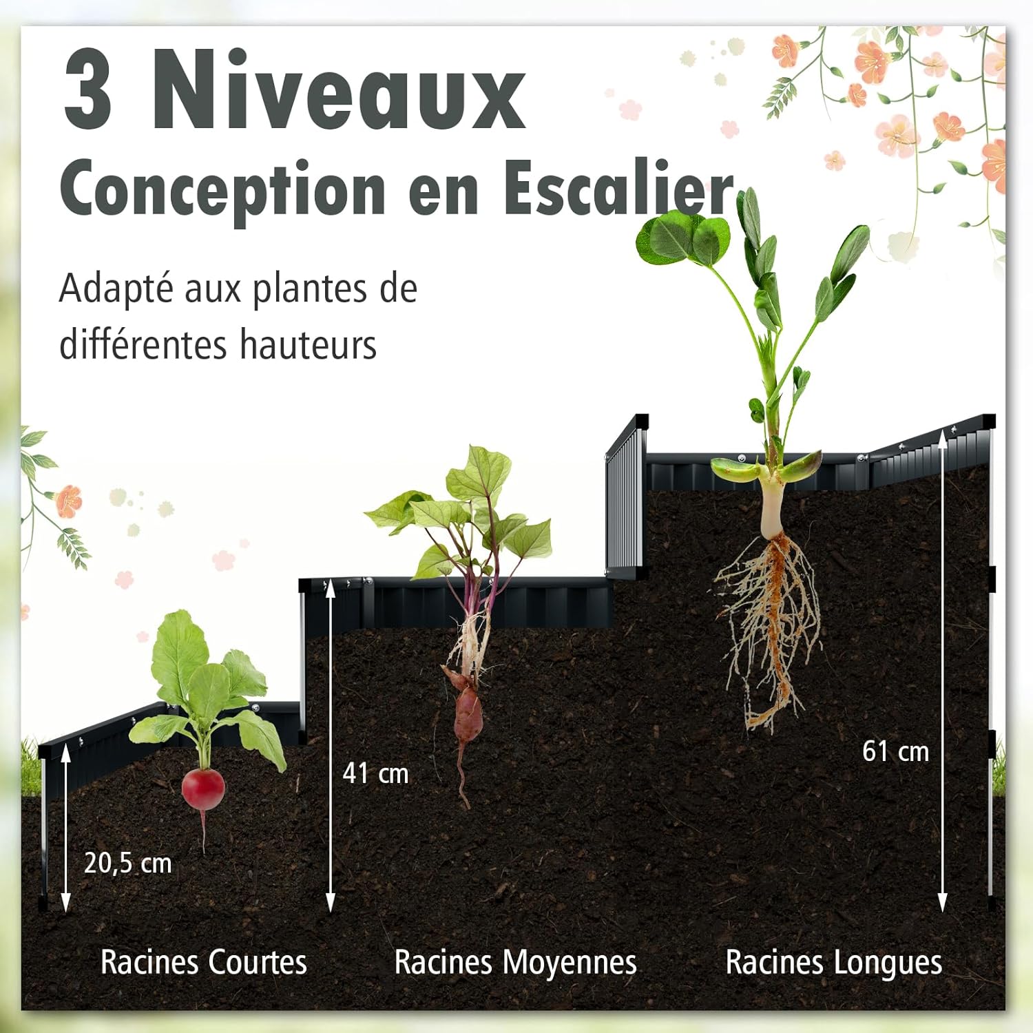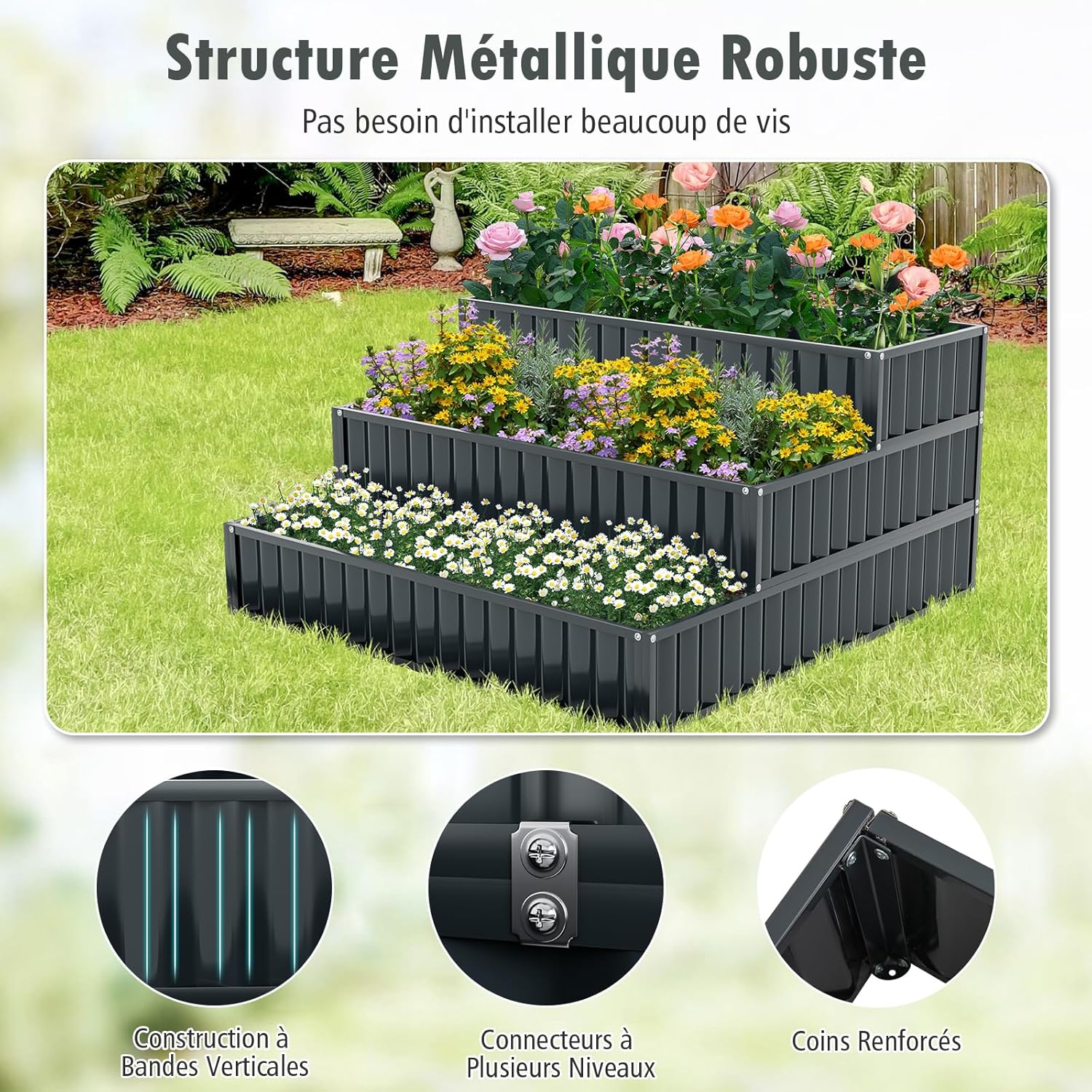 | Libellé | Jardinière à 3 niveaux en escalier métal, lit de jardin suréléve avec base ouverte pour plantes à racines |