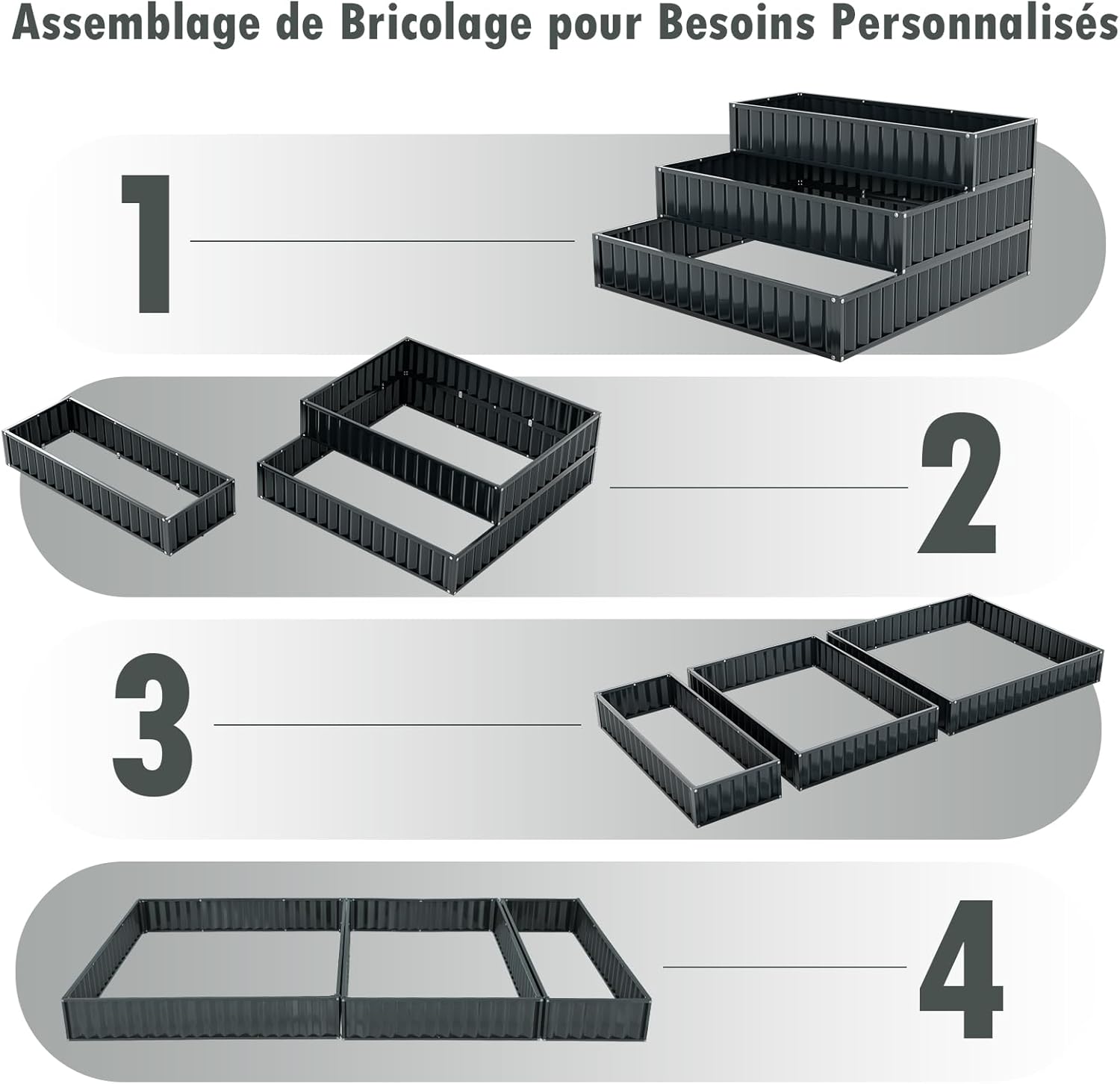 Ce qui distingue notre lit de jardin, c'est sa capacité à se transformer en 3 bacs séparés, vous permettant de concevoir un aménagement unique qui convient à votre style. Avec 3 niveaux, il vous permet de cultiver une variété de plantes avec des structures et des tailles de racines différentes. Il offre un grand espace et un fond ouvert, permettant aux plantes de prospérer sans arrosage excessif. Fabriqué à partir de panneaux métalliques robustes avec revêtement en poudre, il bénéficie d'une construction robuste et la structure unique à rayures verticales améliorera sa robustesse.