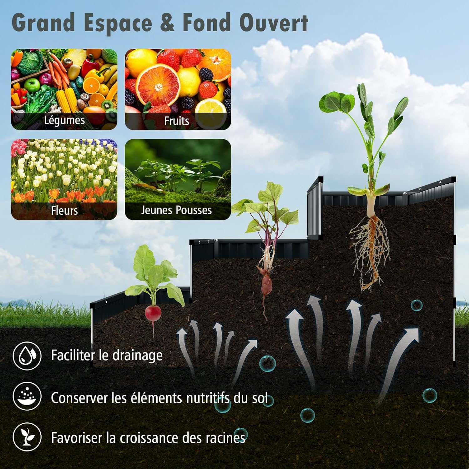- Fond Ouvert : Le lit de jardin est conçu avec une base ouverte, qui assurera un drainage adéquat et maintiendra les nutriments du sol. De plus, la base ouverte facilite la croissance des racines profondes, créant un environnement idéal pour que vos plantes bien-aimées prospèrent.