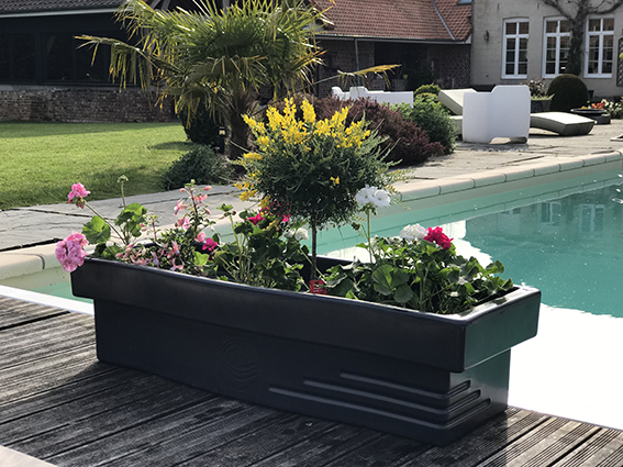 Capacité : 70L. Longueur : 125 cm_Hauteur : 31 cm_ Largeur : 46 cm._Poids : 12 kg_ Pour plantation fleurs et aromates_ Matière : polyéthylène haute densité _Très résistant aux chocs. plage d'utilisation : -30°C à +60°C_ 100% recyclable_Traité anti UV_Marque : PLAST'UP ROTOMOULAGE_Fabrication Française