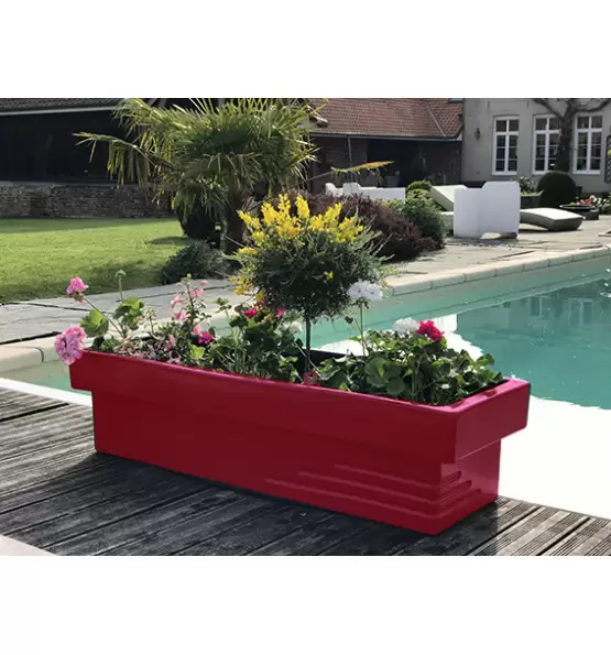 Capacité : 70L. Longueur : 125 cm_Hauteur : 31 cm_ Largeur : 46 cm._Poids : 12 kg_ Pour plantation fleurs et aromates_ Matière : polyéthylène haute densité _Très résistant aux chocs. plage d'utilisation : -30°C à +60°C_ 100% recyclable_Traité anti UV_Marque : PLAST'UP ROTOMOULAGE_Fabrication Française